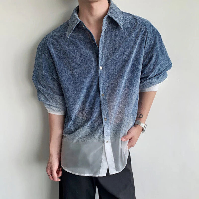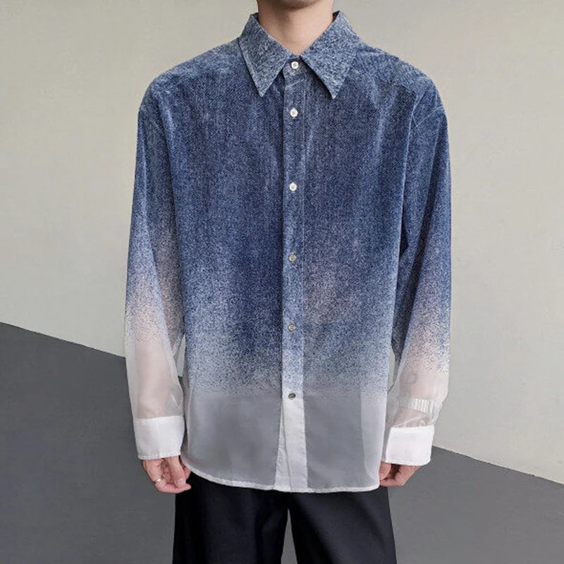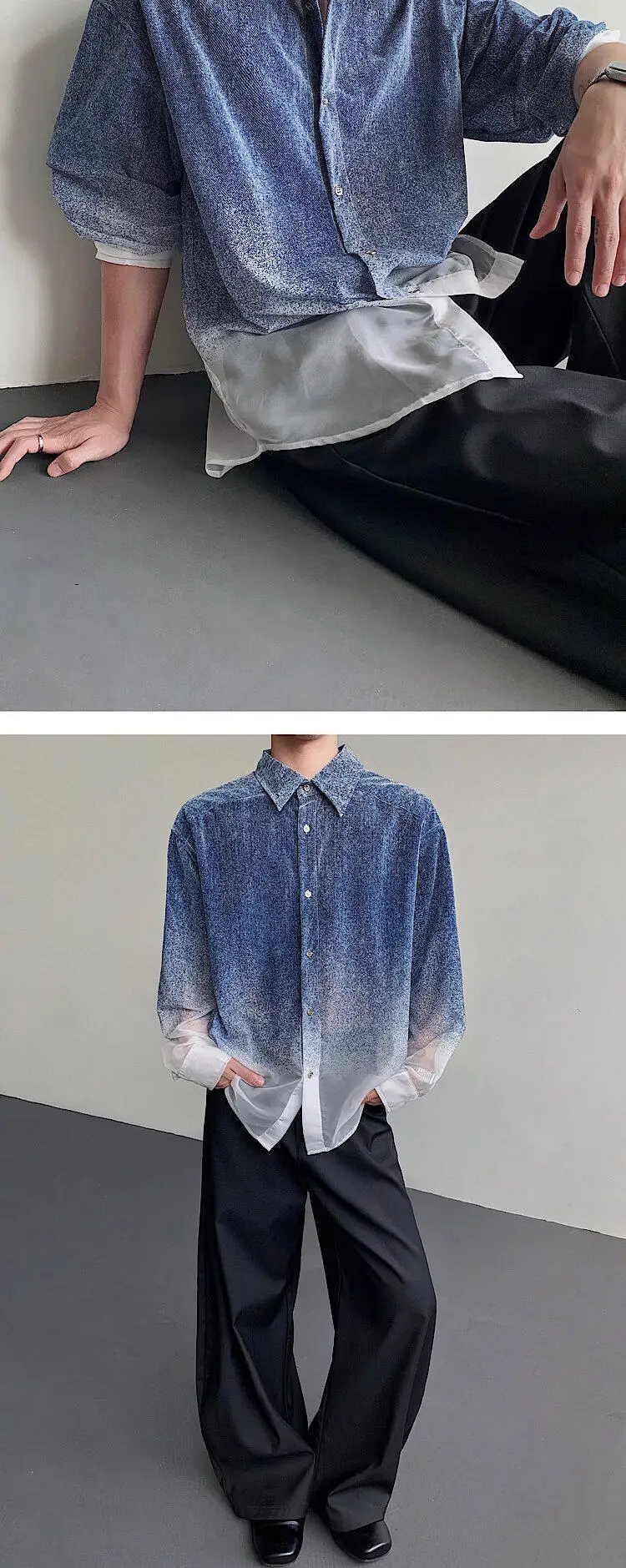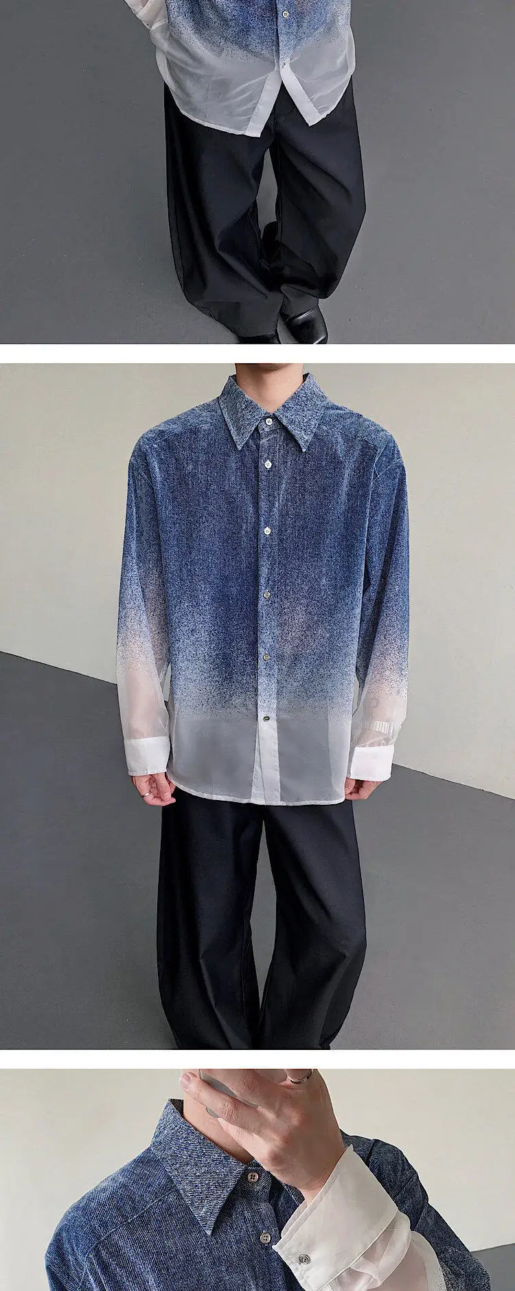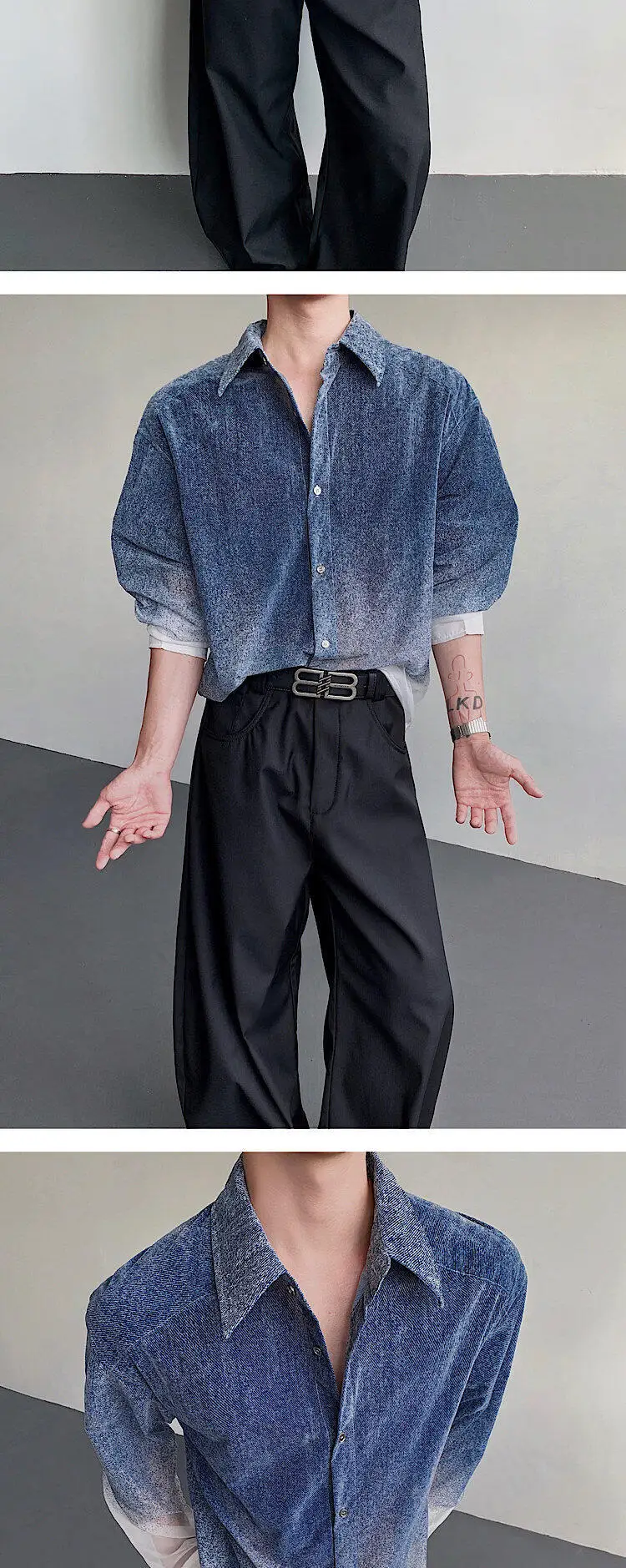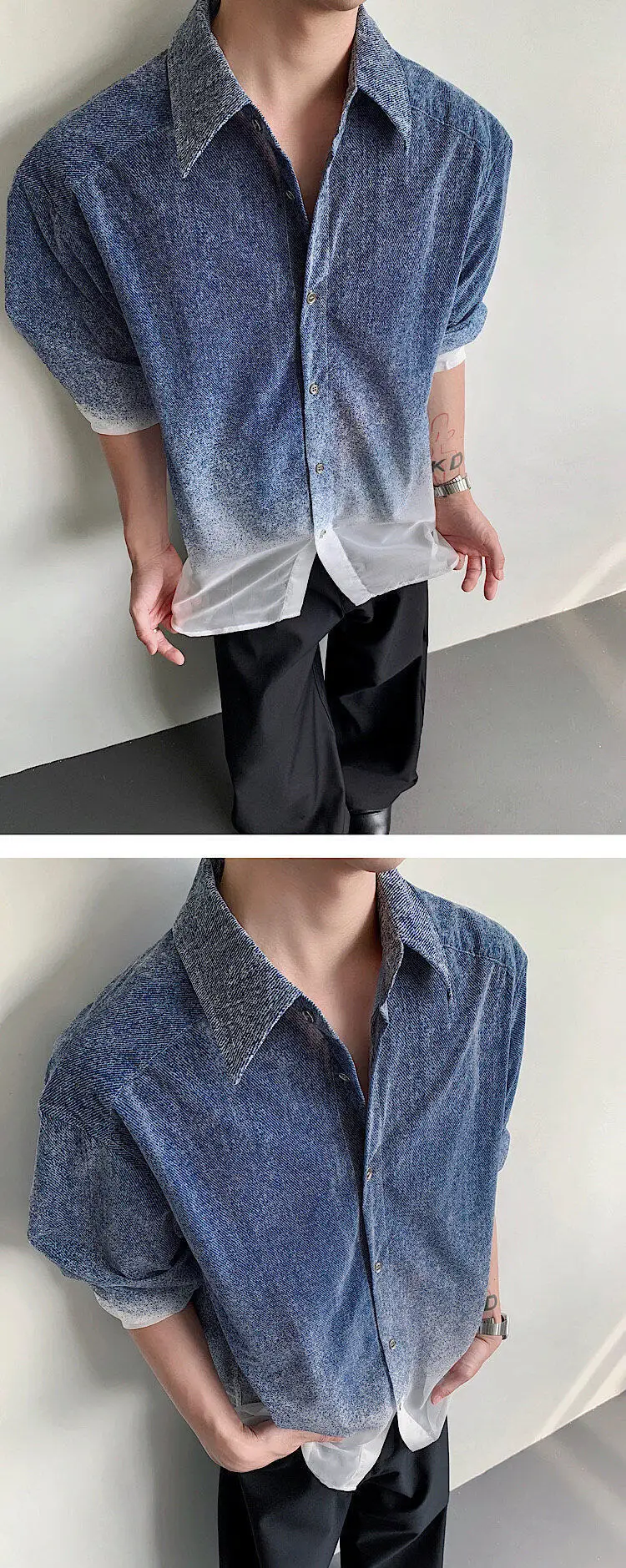 AIDASE  -  Men's Shirts Gradient Denim Contrast Color Patchwork Design Turn-Down Collar Shirt Single-breasted Long Sleeve Tops 21E6718