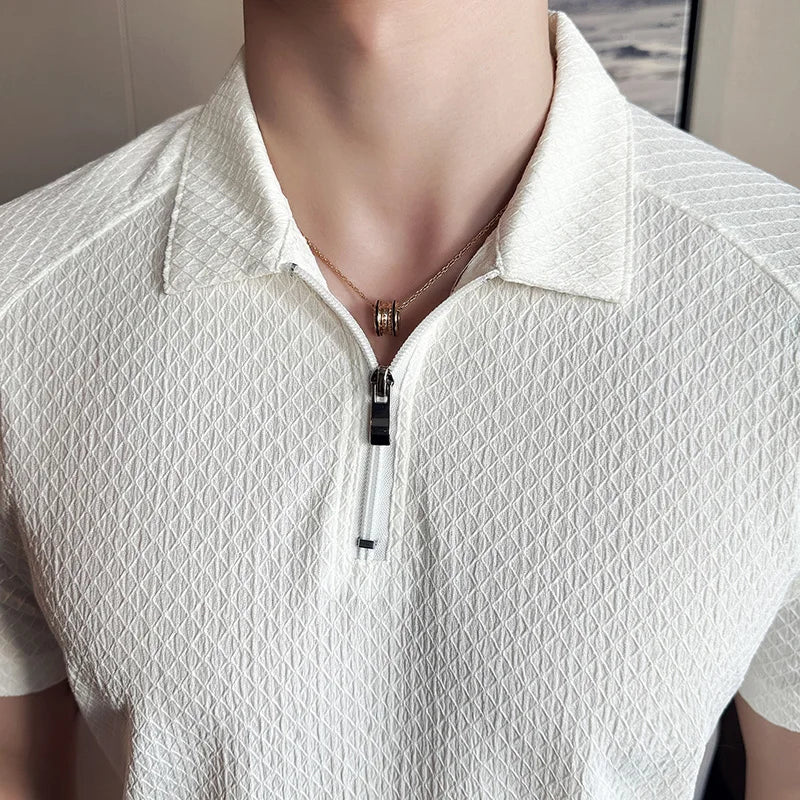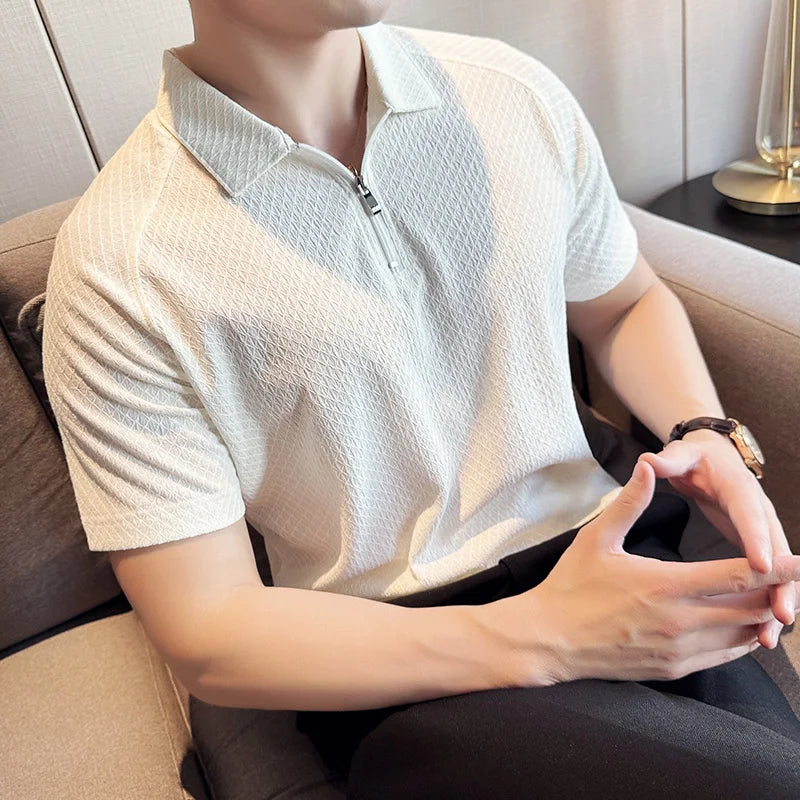 Men's Short-Sleeved White Golf Shirt, Seersucker Mesh Fabric, Ice Silk Thin High Elastic Half Zipper Polo Shirt,T-shirt