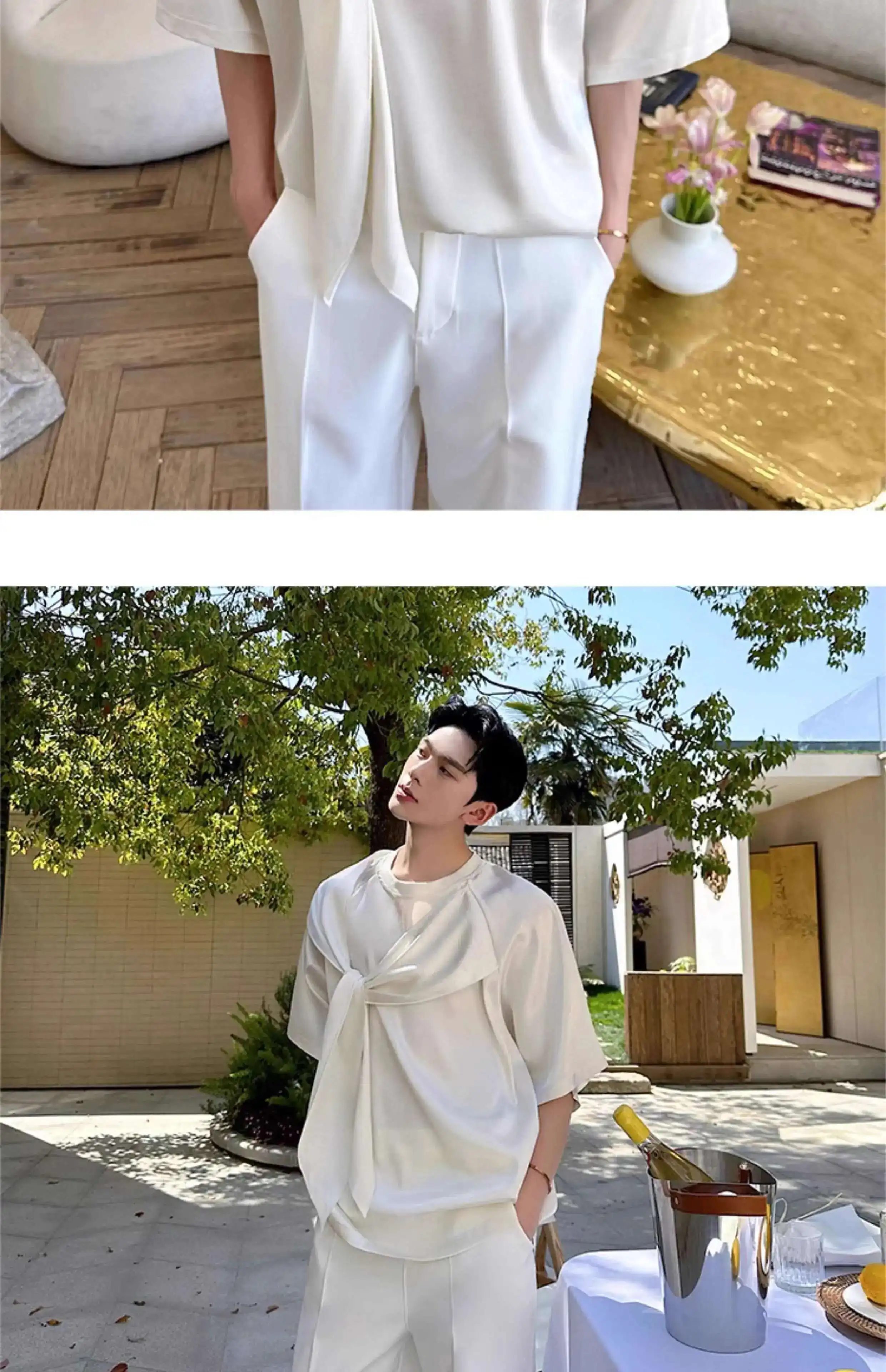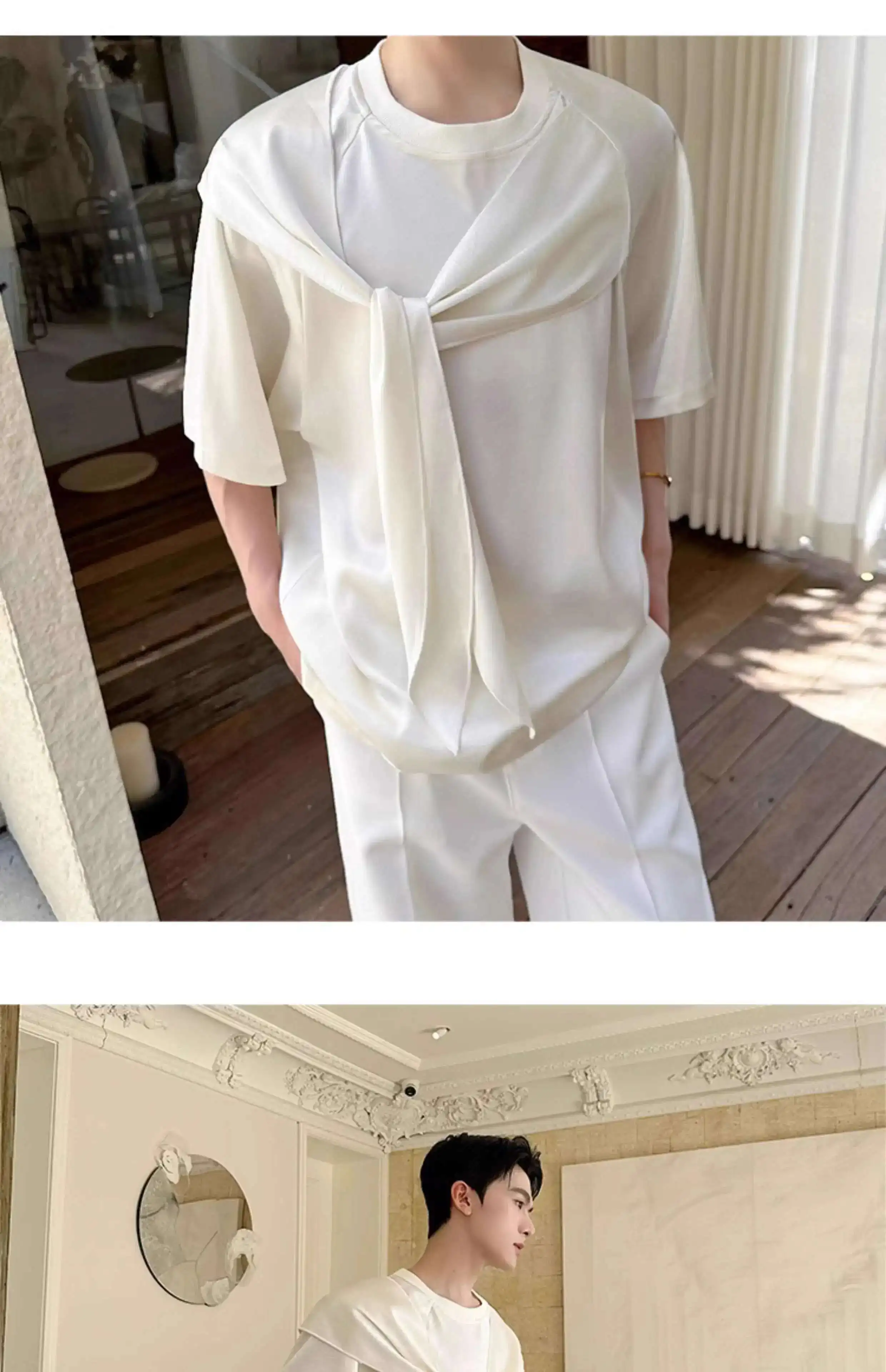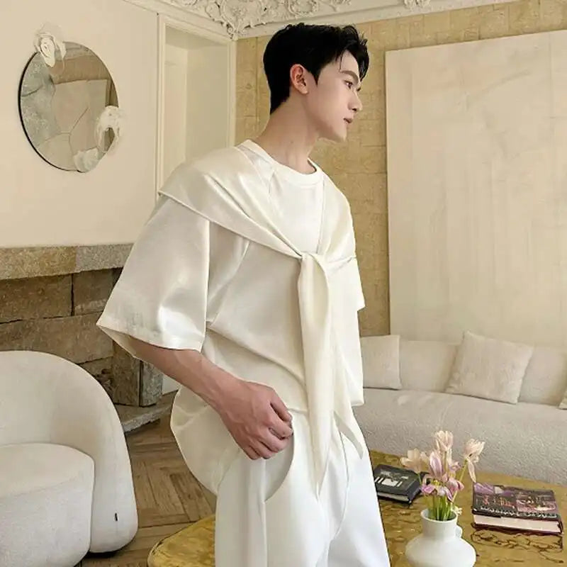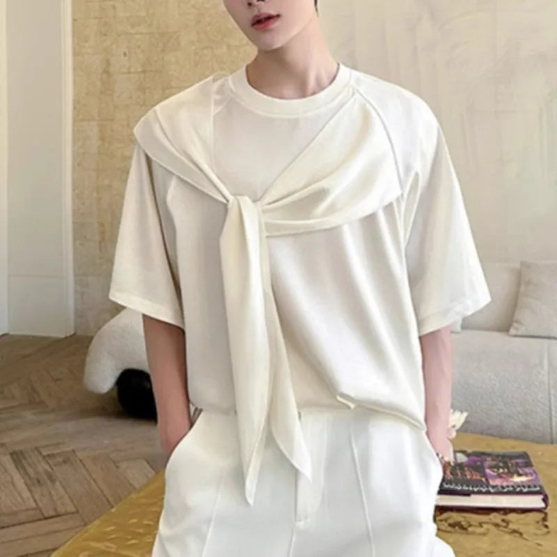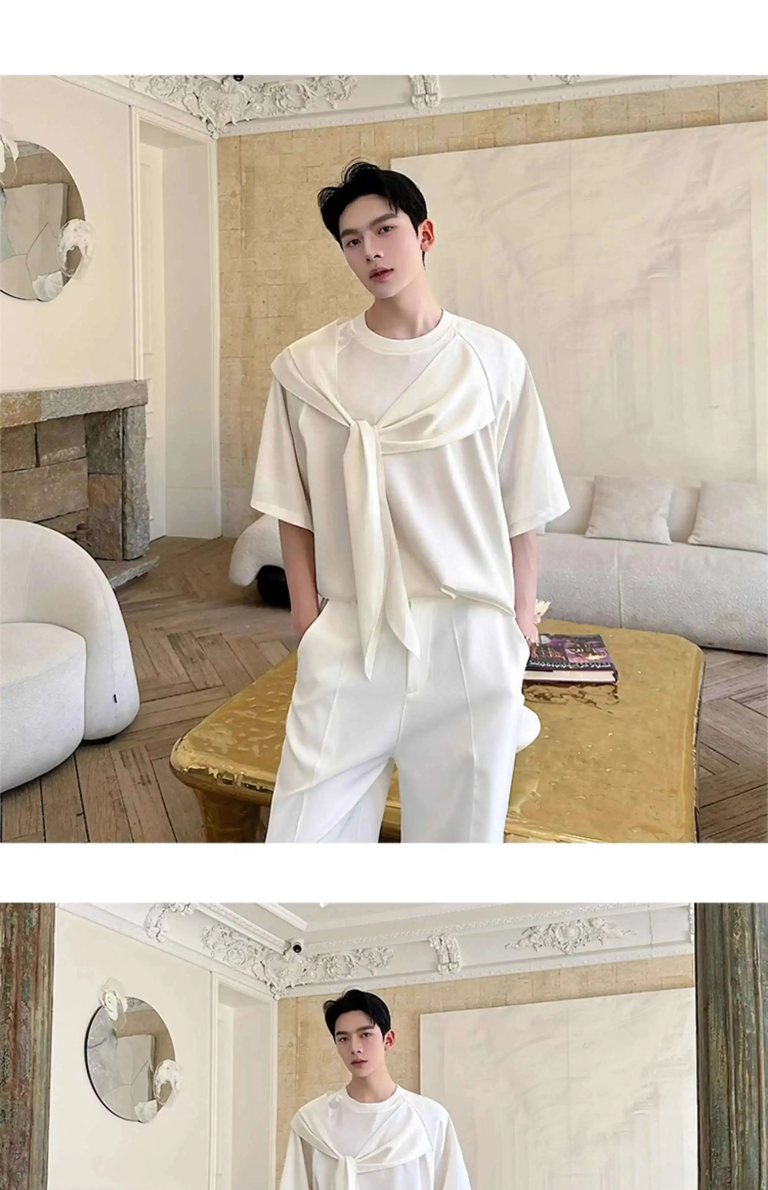 AIDASE - Men's T-shirts New Summer Cutting Tie Ribbon Design Round Neck Short Sleeve Solid Color Male Loose Clothing 2025 9W2125