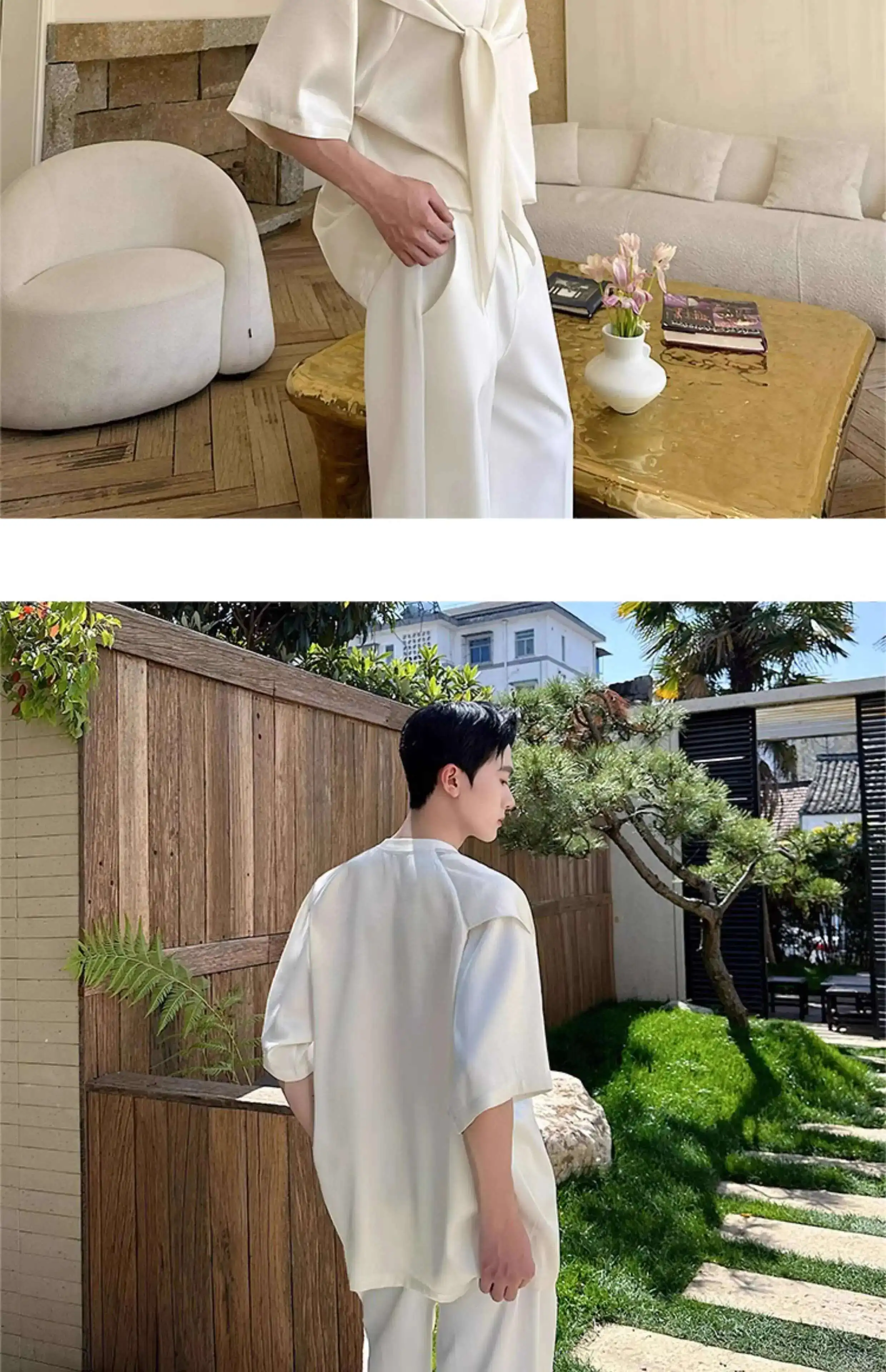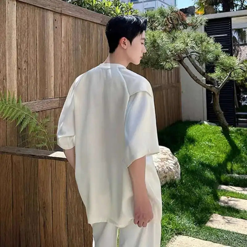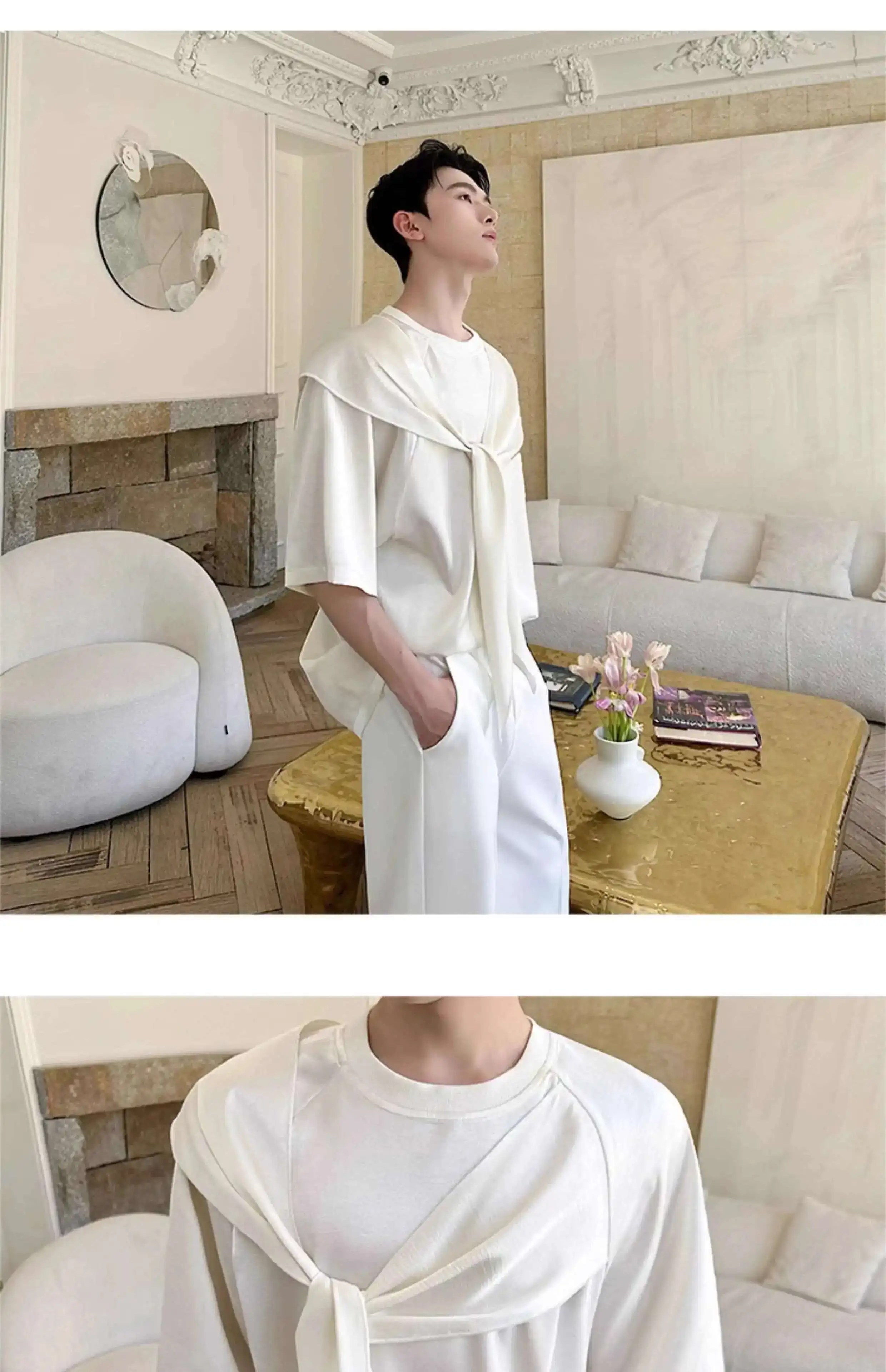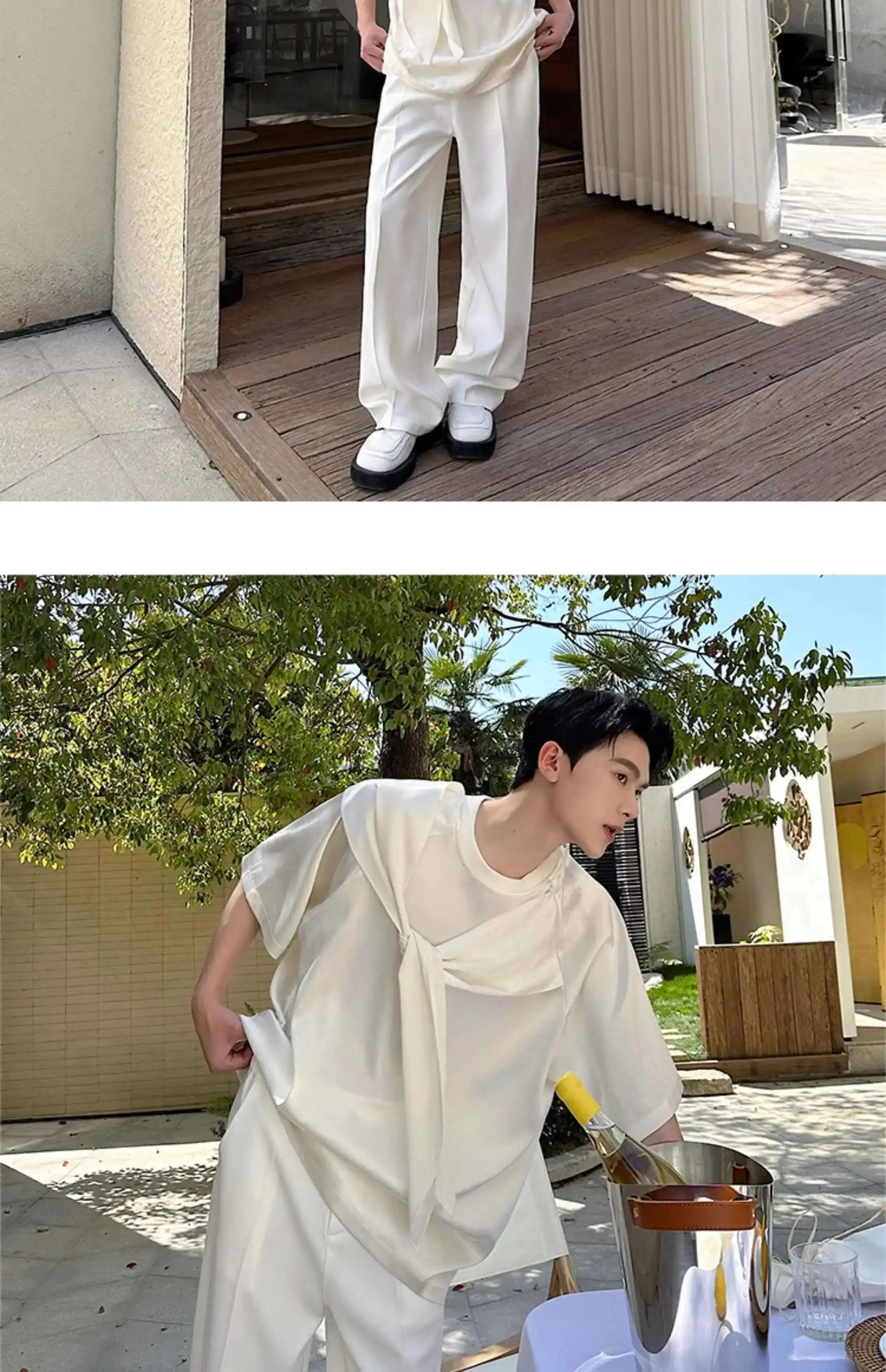 AIDASE - Men's T-shirts New Summer Cutting Tie Ribbon Design Round Neck Short Sleeve Solid Color Male Loose Clothing 2025 9W2125