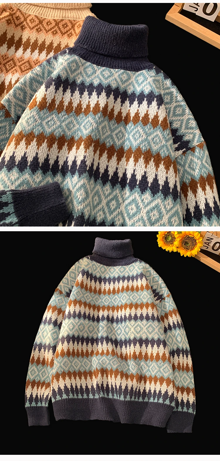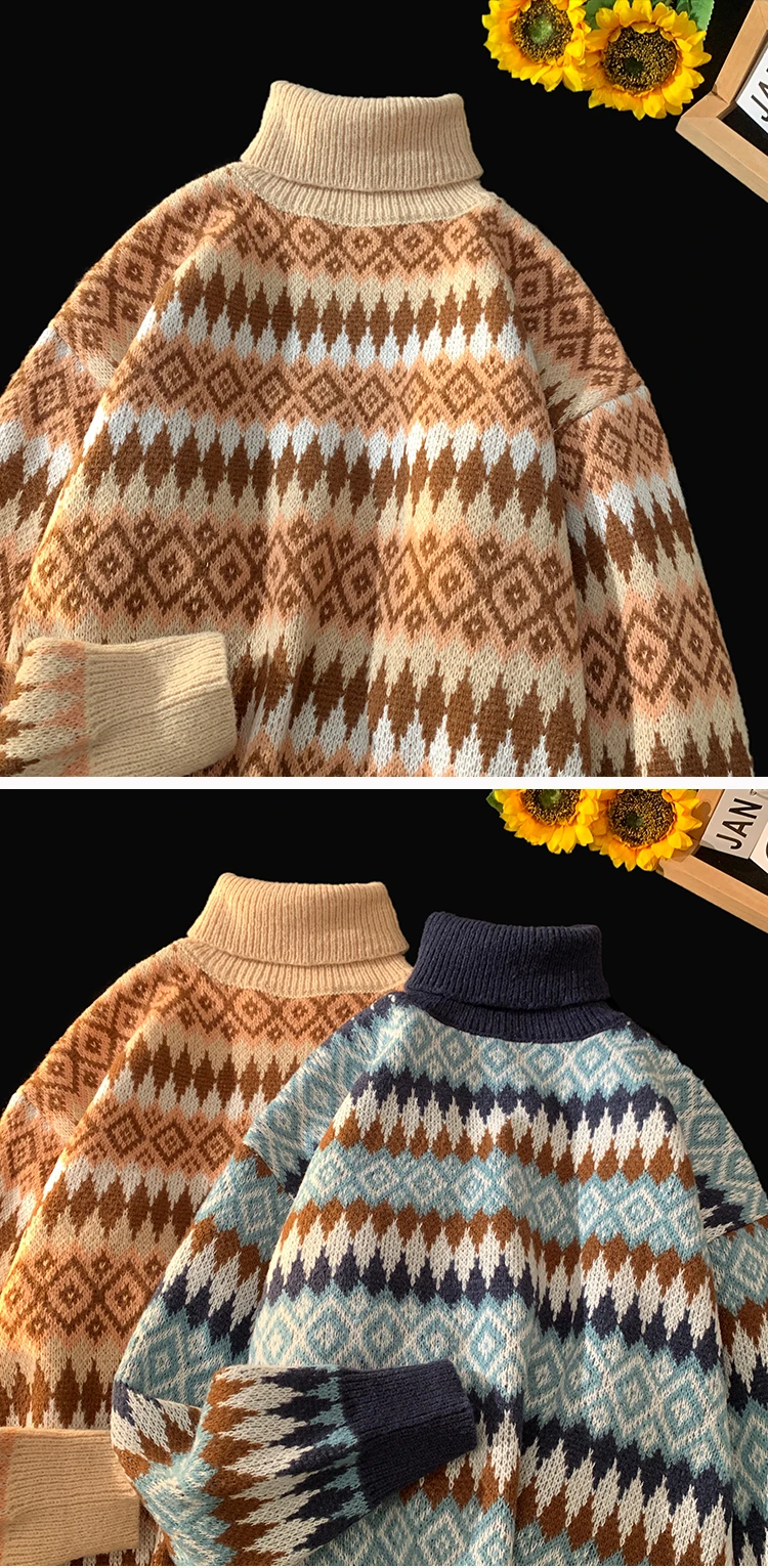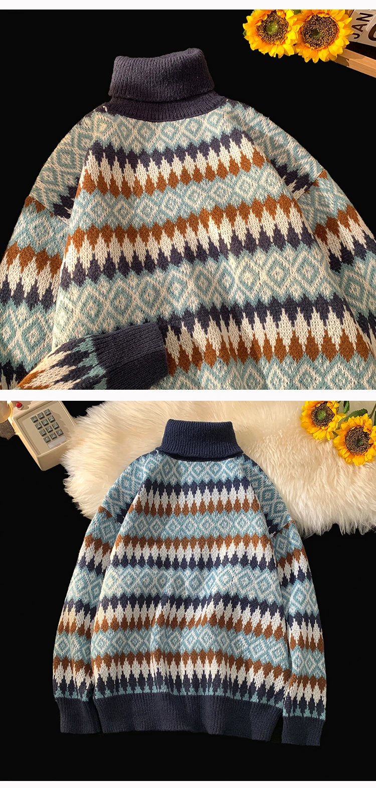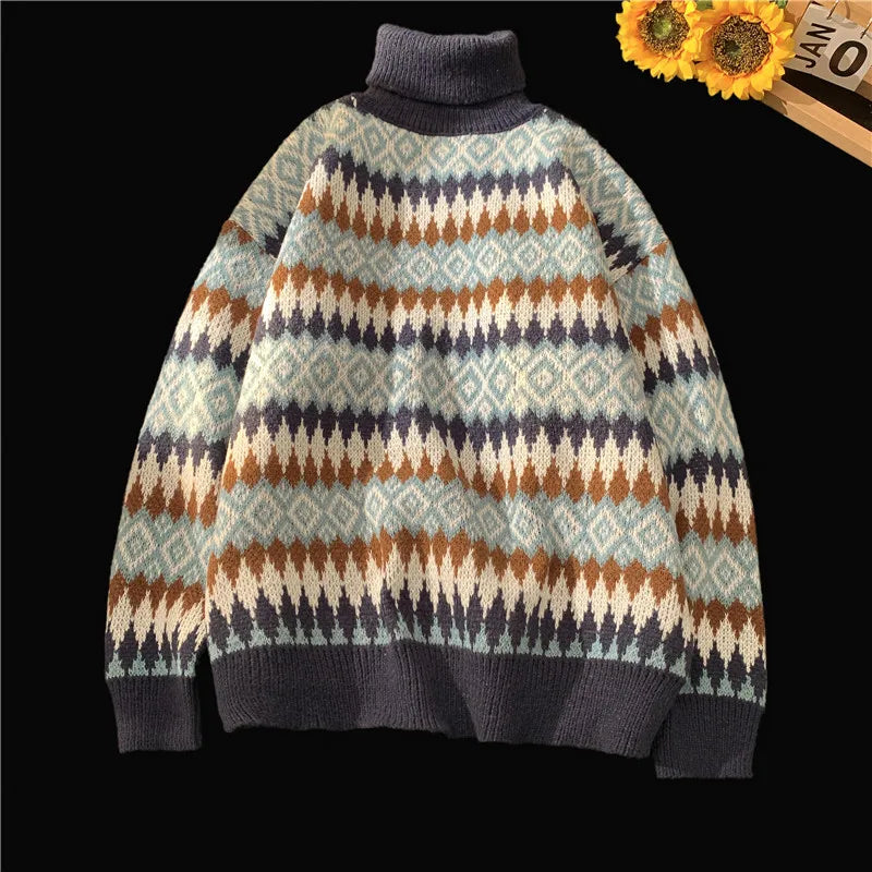 Aidase Neck Sweaters Men Geometric Trendy Traditional Baggy Long Sleeve Knitting Pullovers Harajuku Leisure Japanese Style Warm