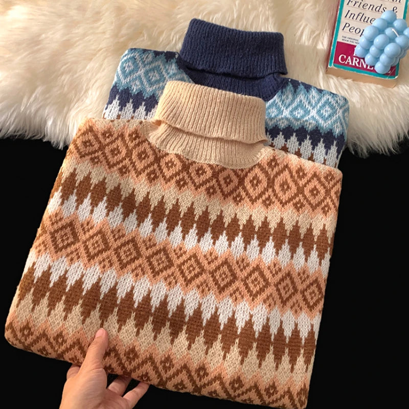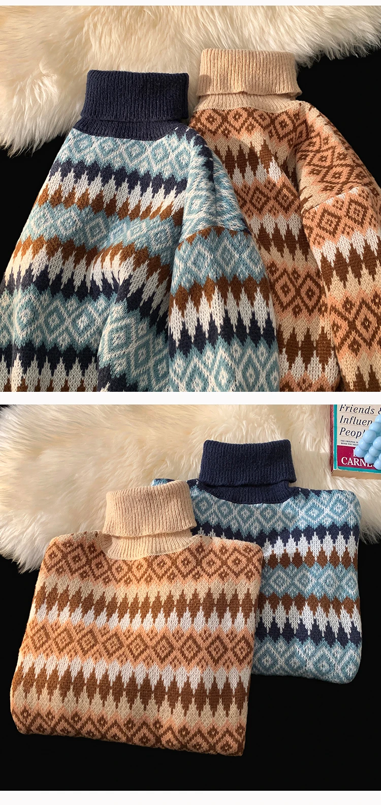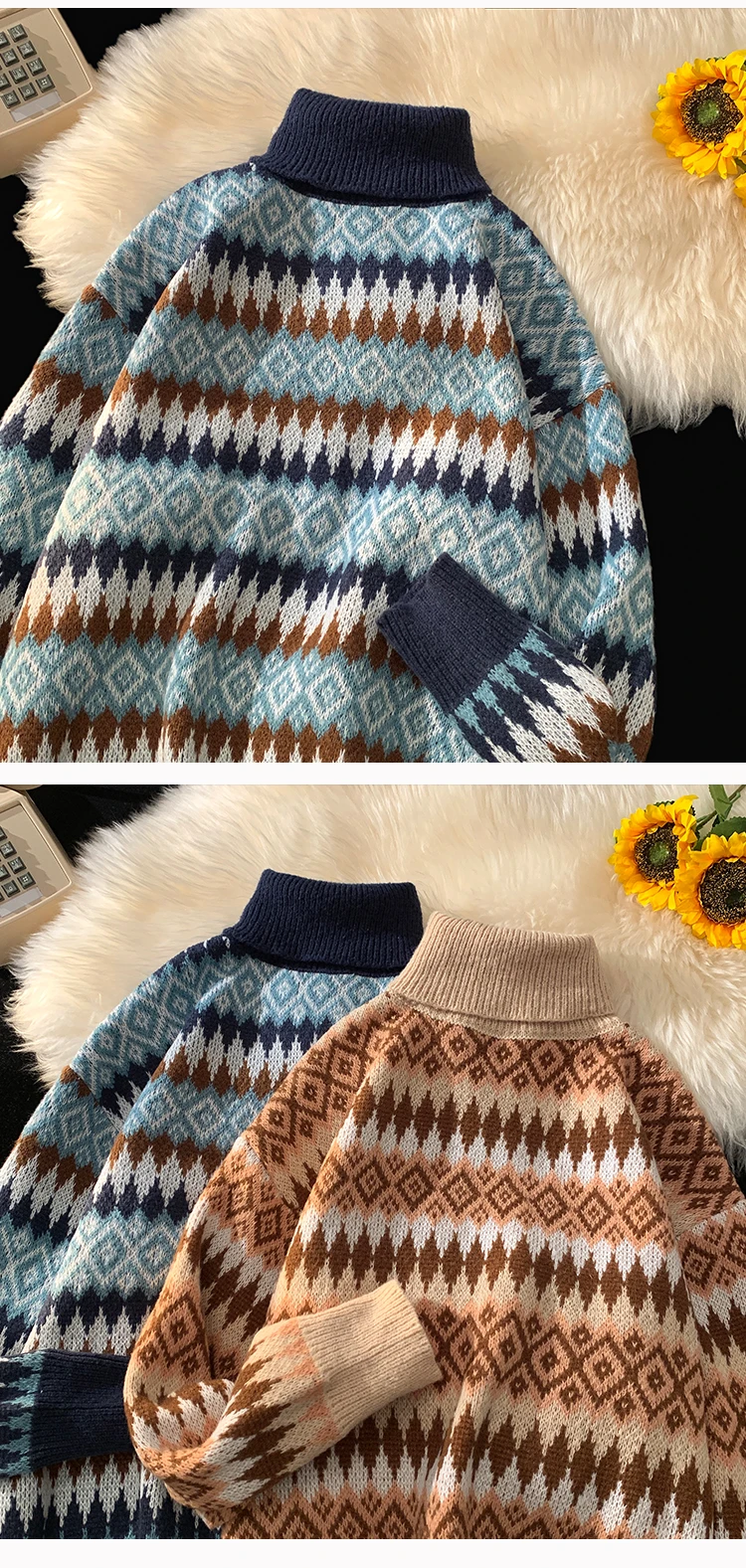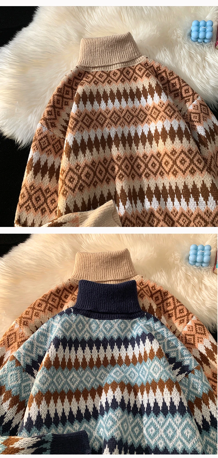 Aidase Neck Sweaters Men Geometric Trendy Traditional Baggy Long Sleeve Knitting Pullovers Harajuku Leisure Japanese Style Warm