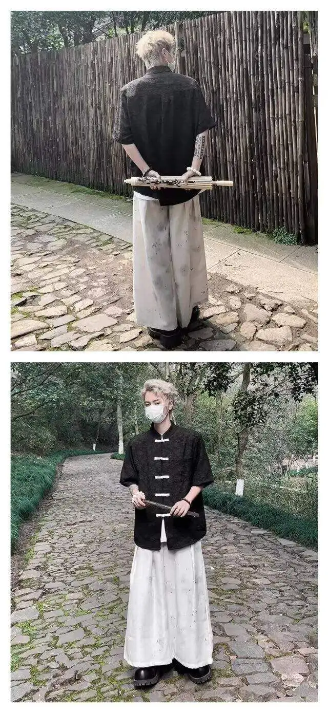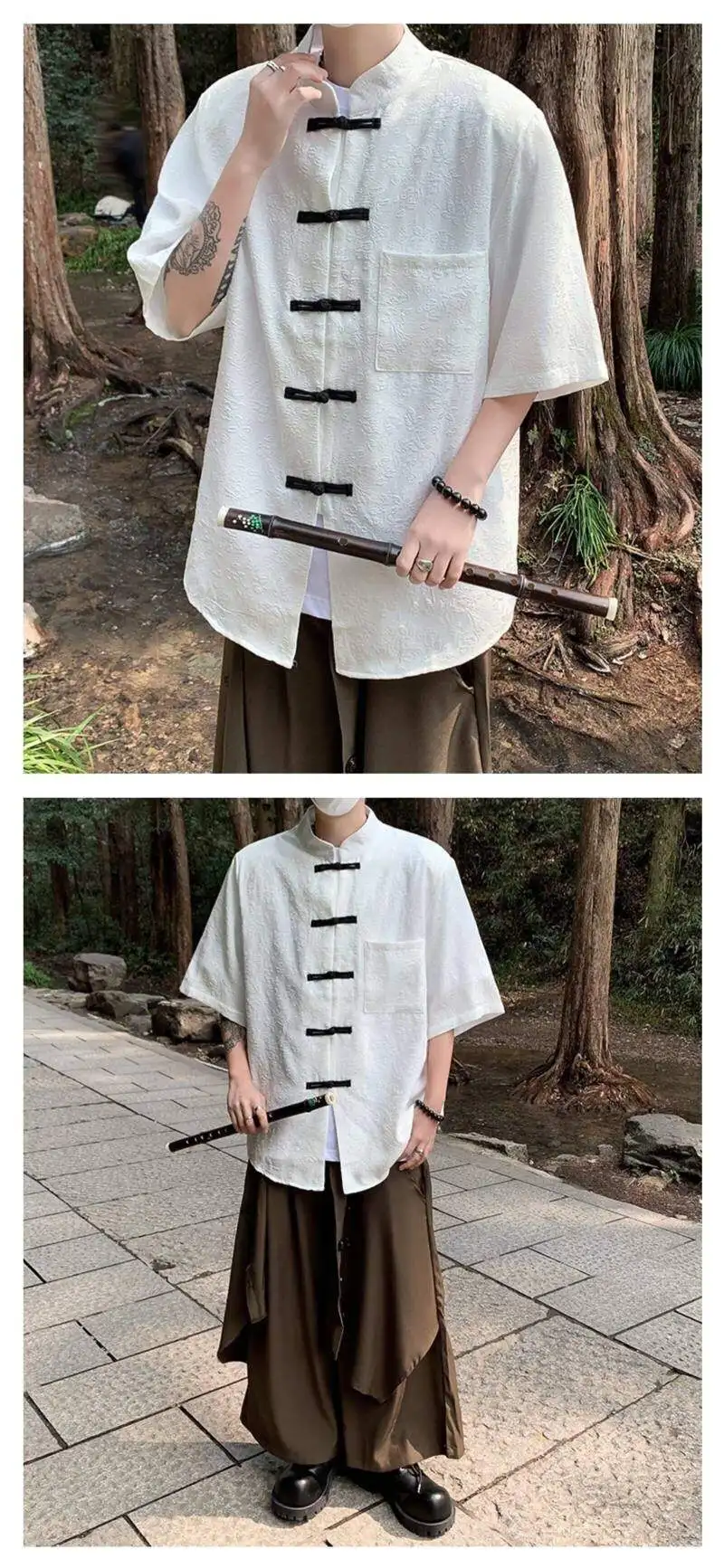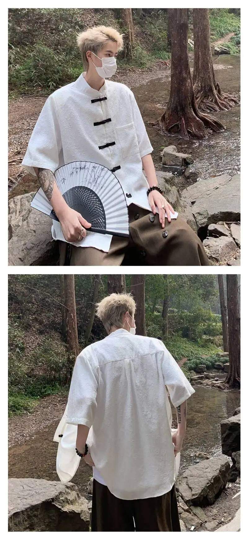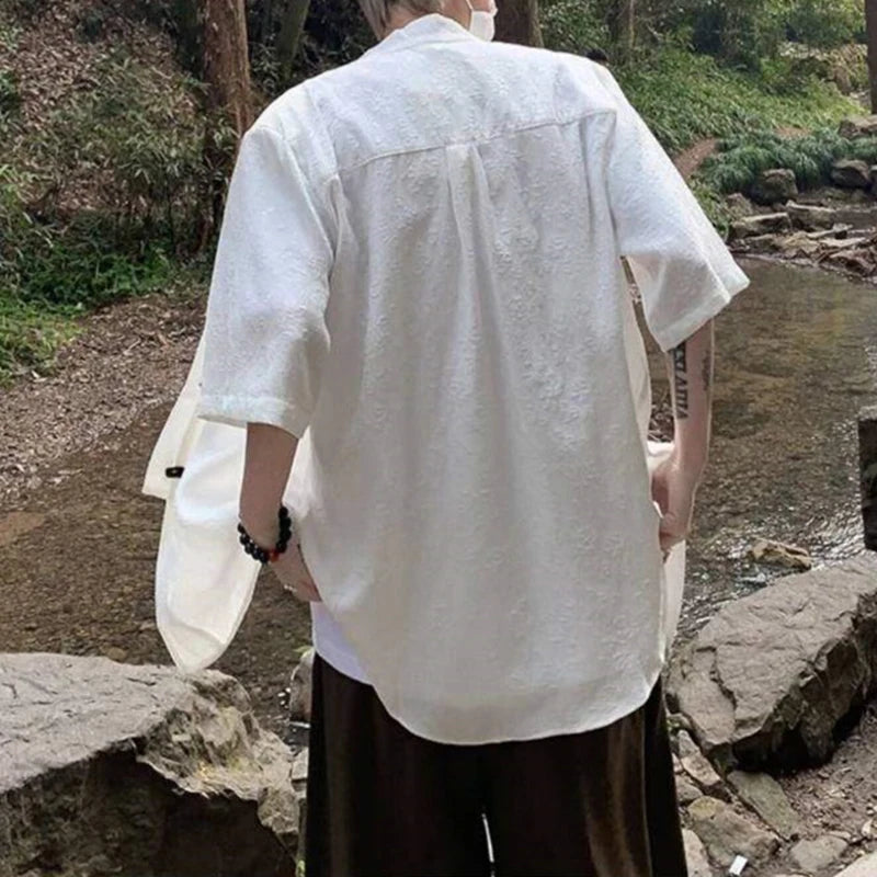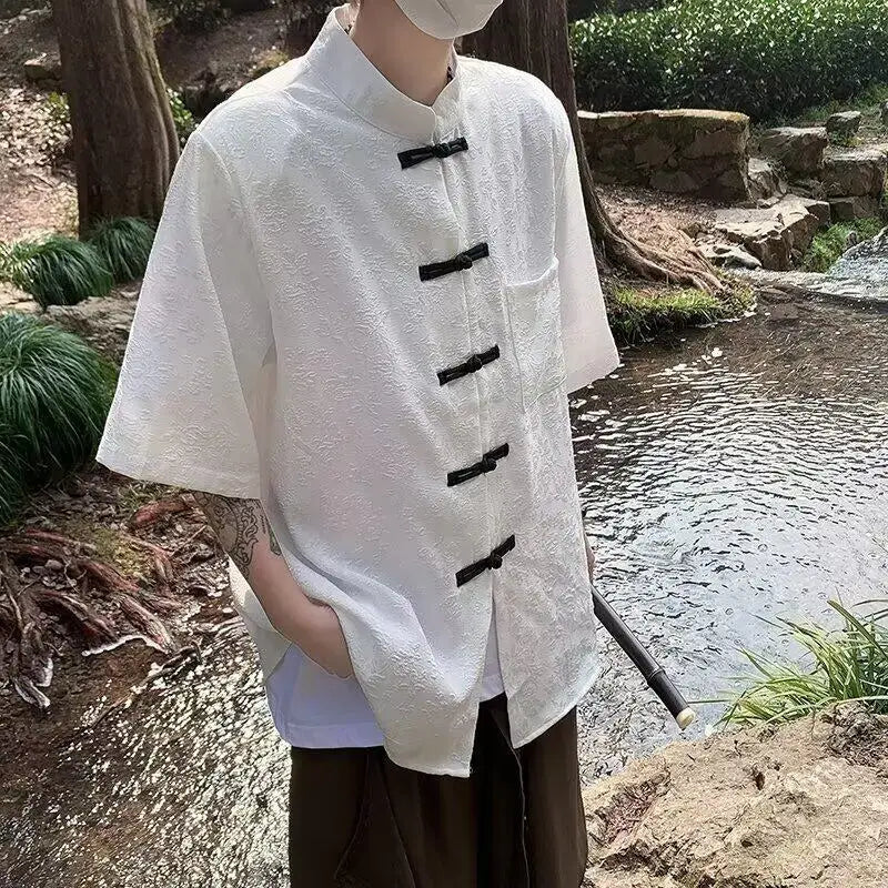 AIDASE - New Chinese Style Men's Shirt Trend Short Sleeve Stand Collar Jacquard Pattern Button-front Shirts Summer Stylish 21E6432