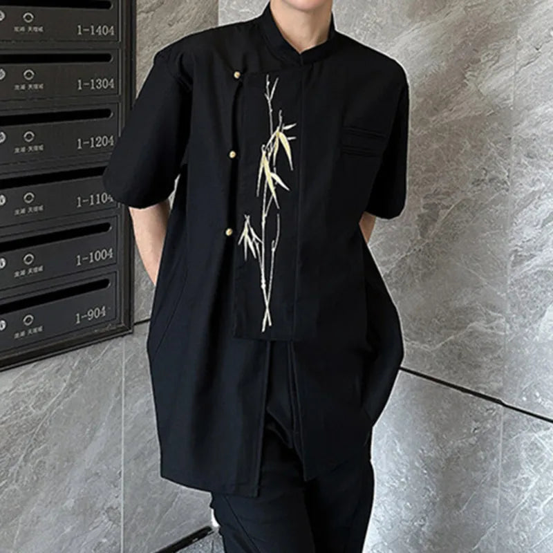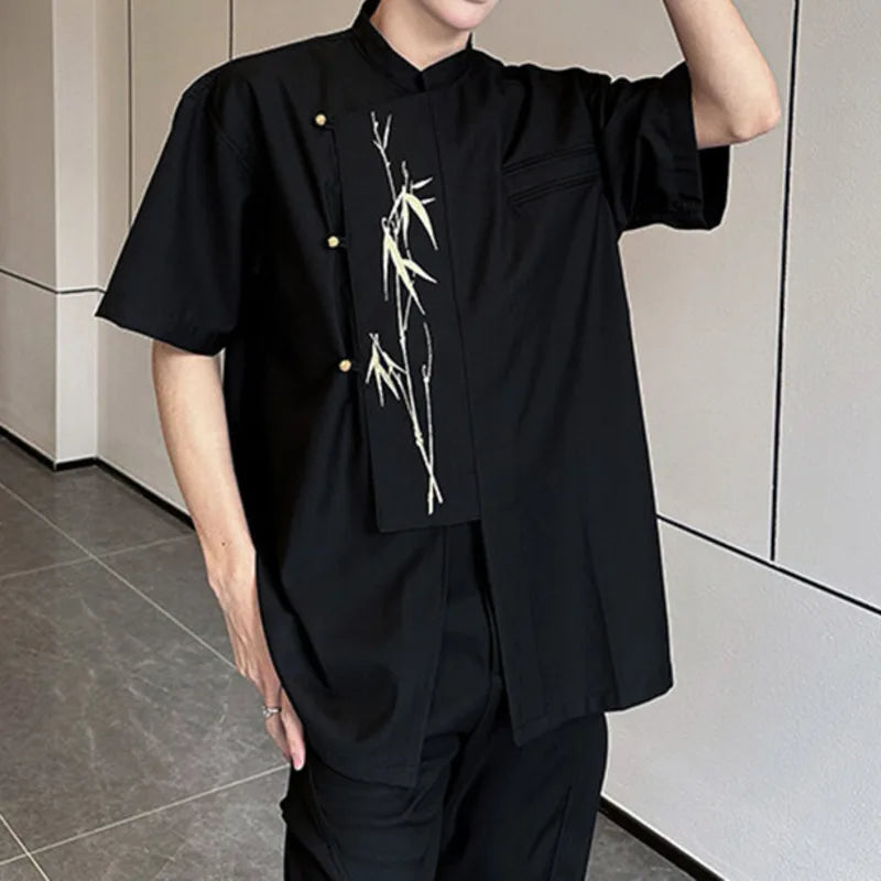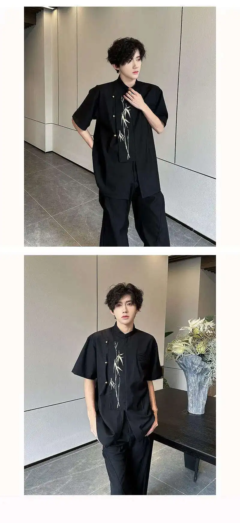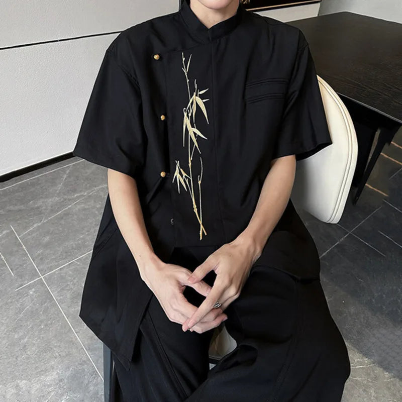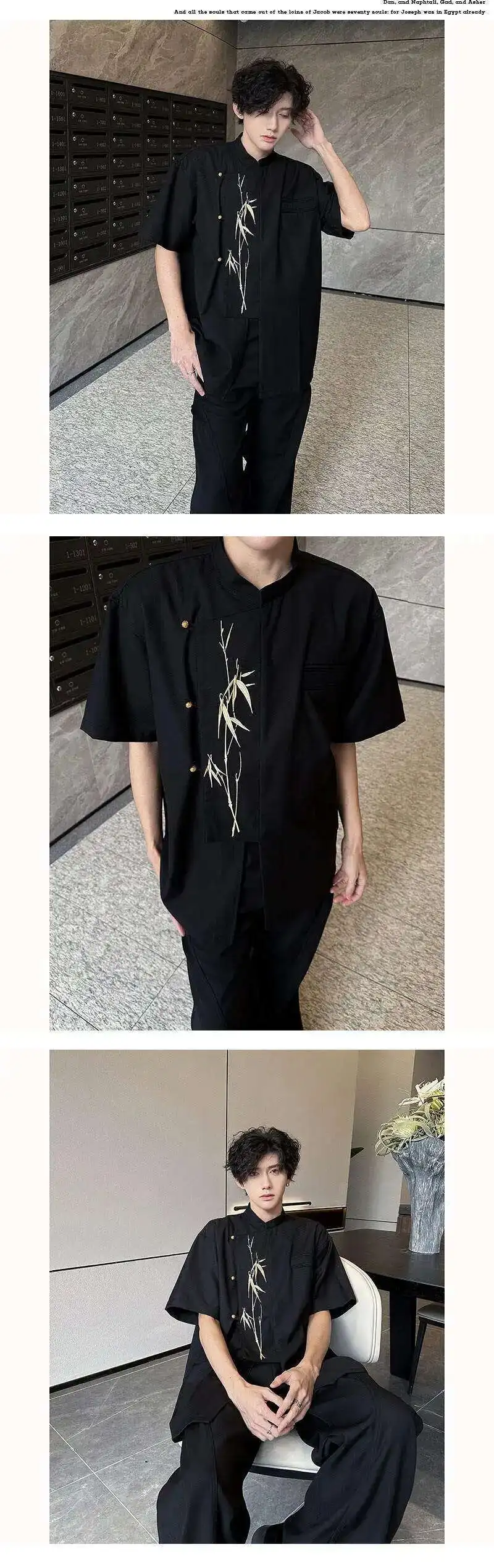 AIDASE - New Chinese Style Shirt Men Wear Bamboo Leaf Pattern Embroidery Short Sleeve Shoulder Pad Male Shirts Loose Fit 9W3086