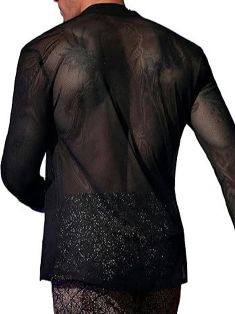 Aidase New Spring Sexy Mesh Shirts Men See Through Transparent Loose Mesh Tops Male Beach Fashion Deep V Neck Button Long Sleeve Shirt