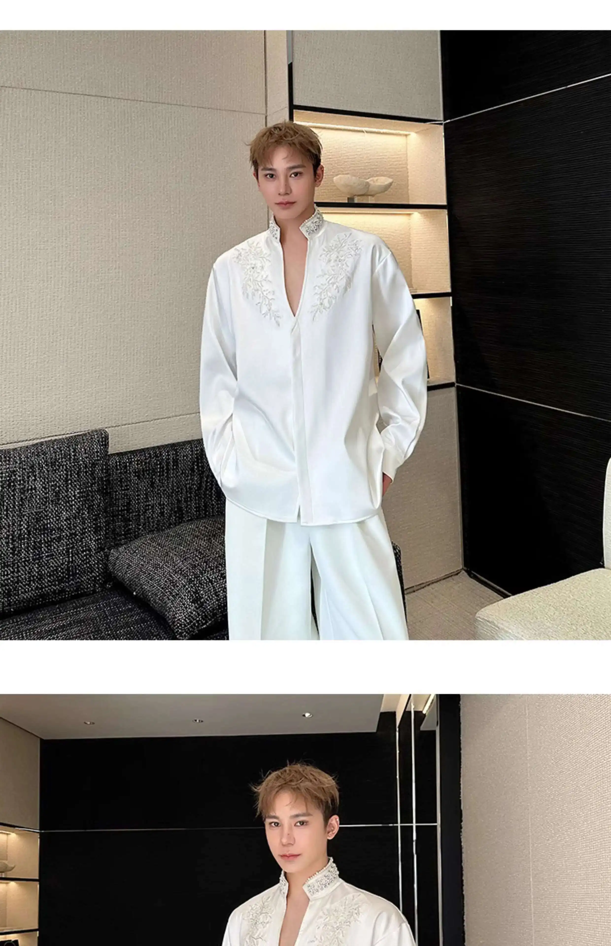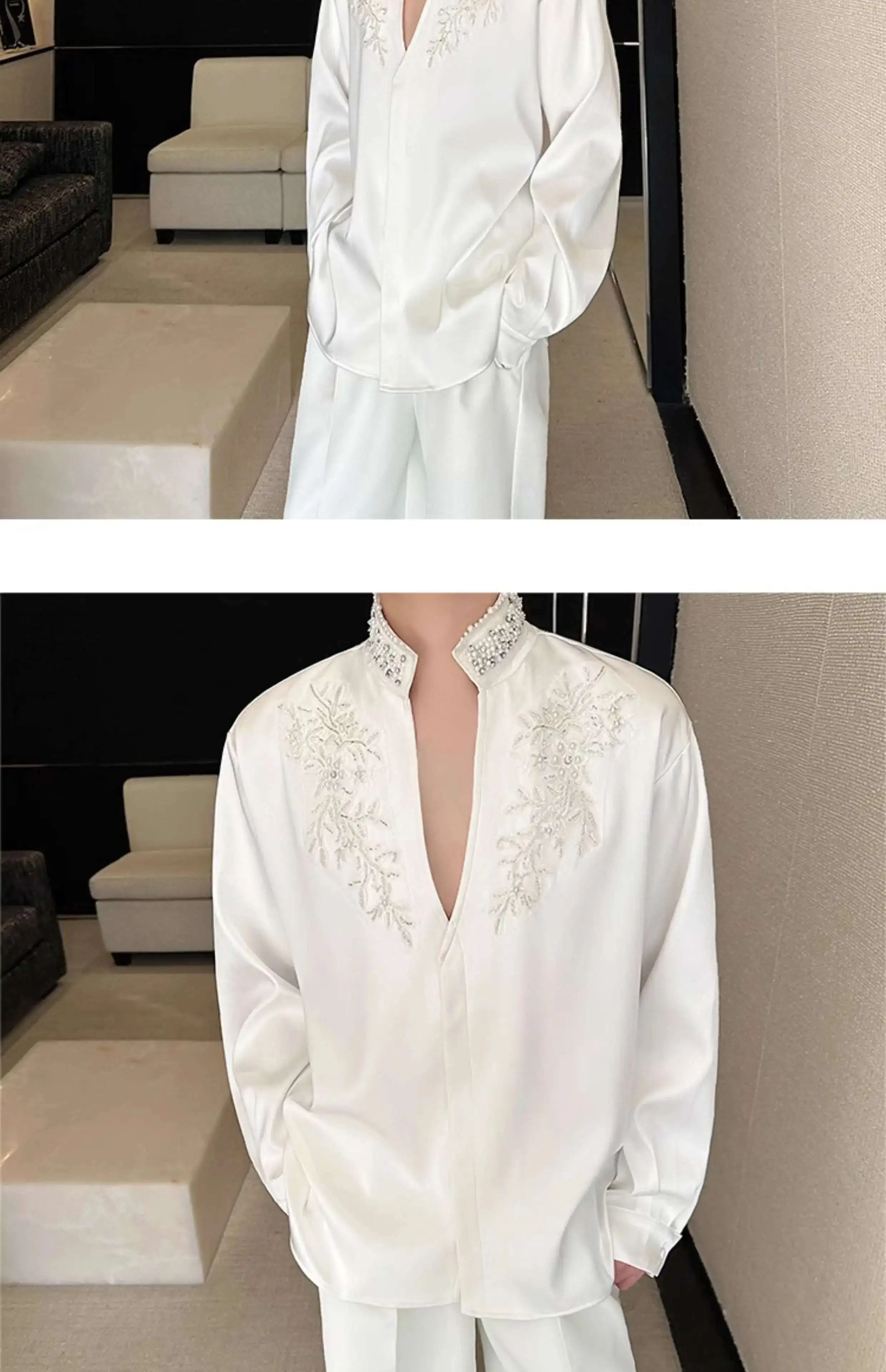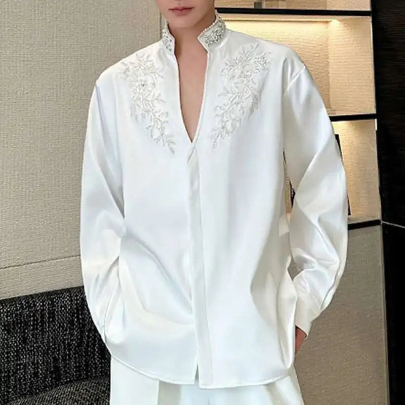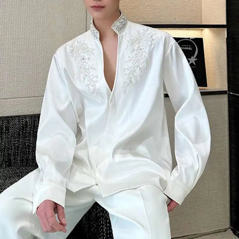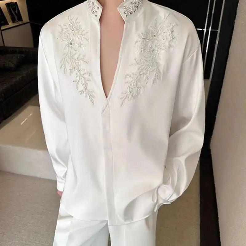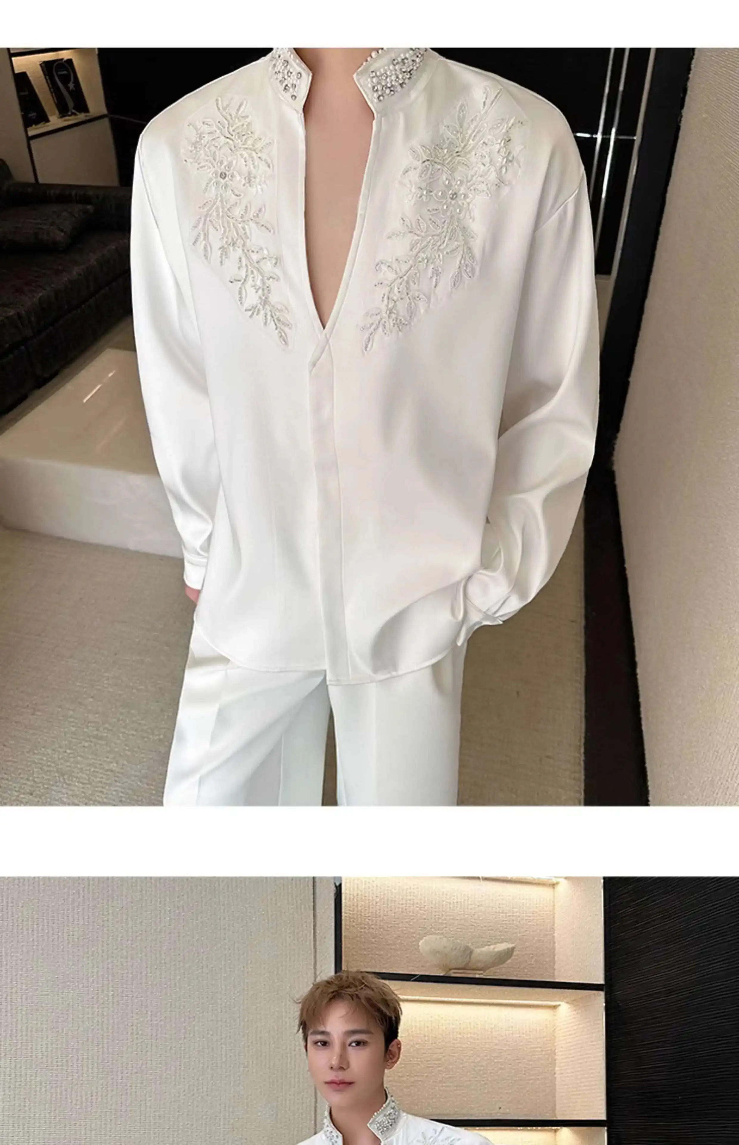 AIDASE  -  Pearl Flower Design Men's Shirts Stand Collar Diamond Solid Color Long Sleeve Cloth Loose Covered Button Male Tops