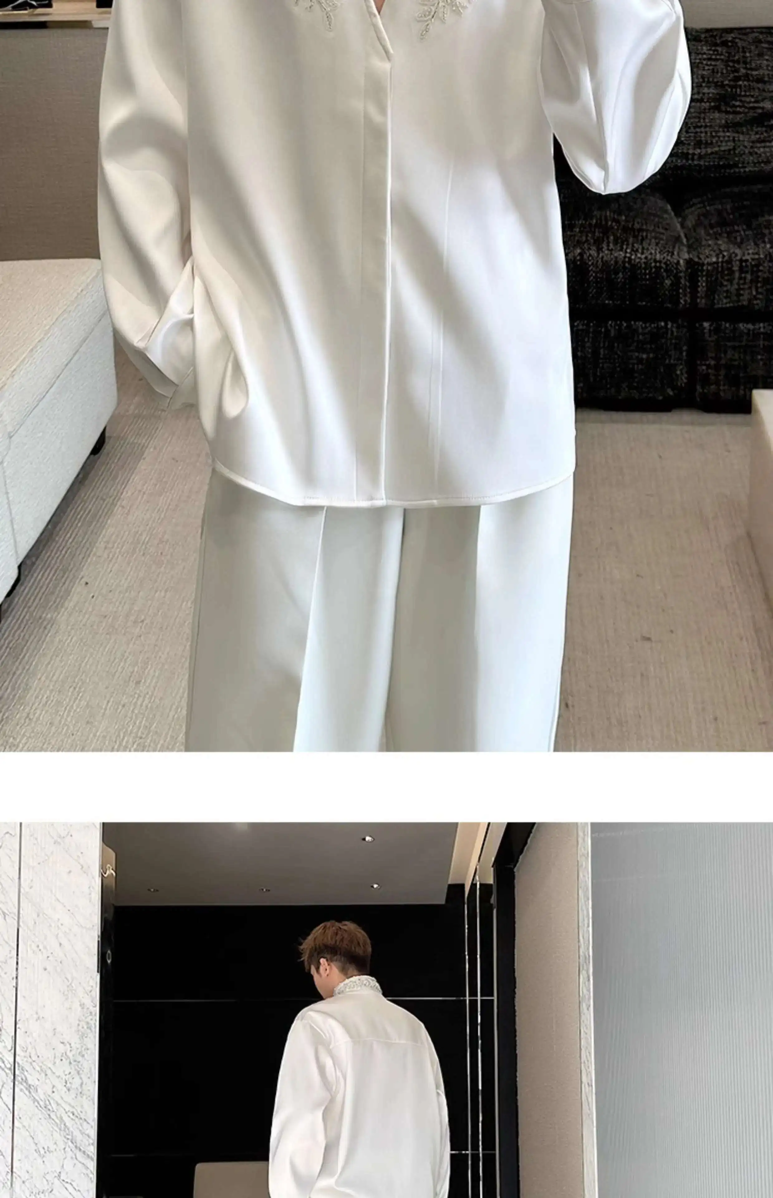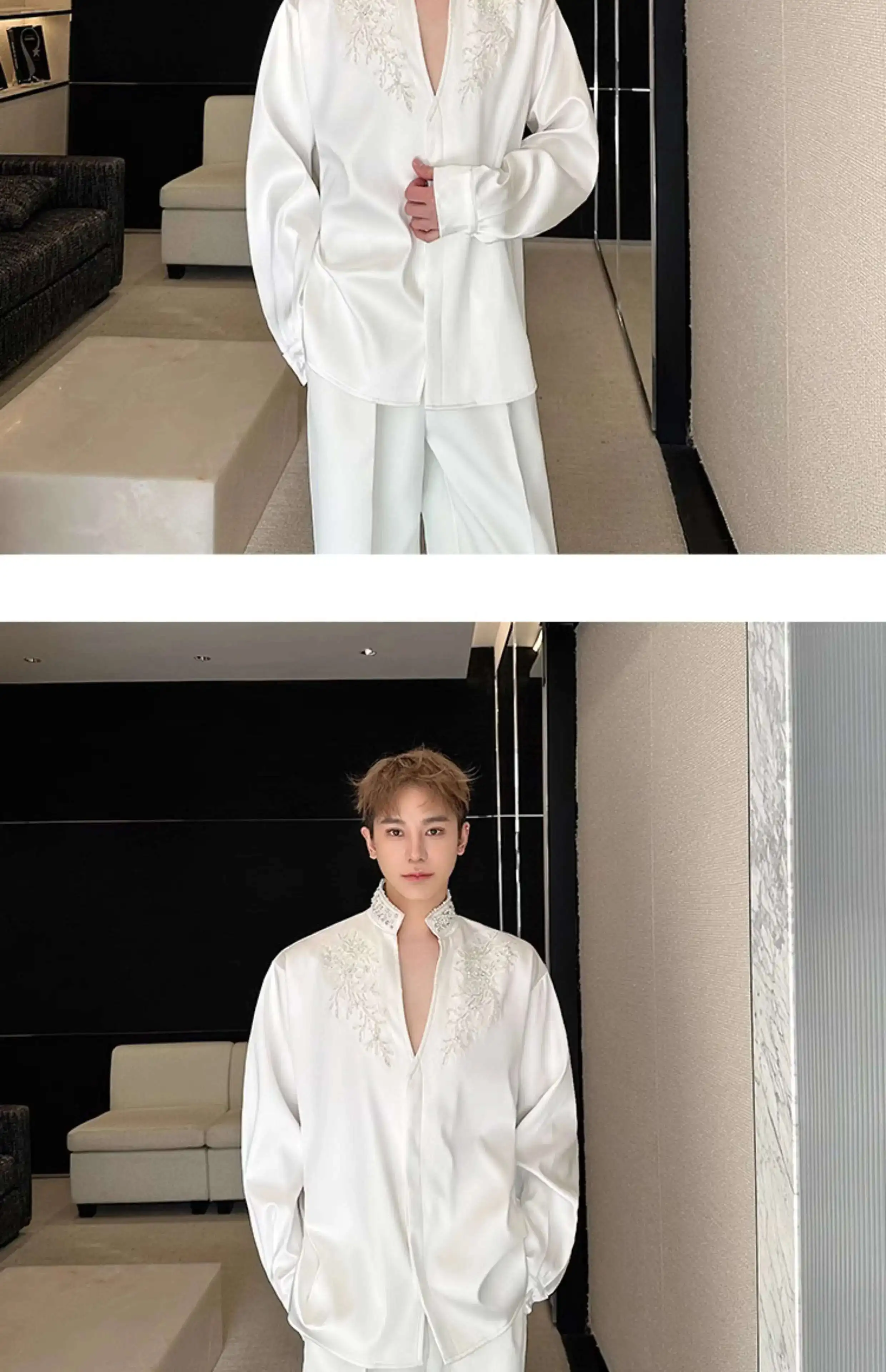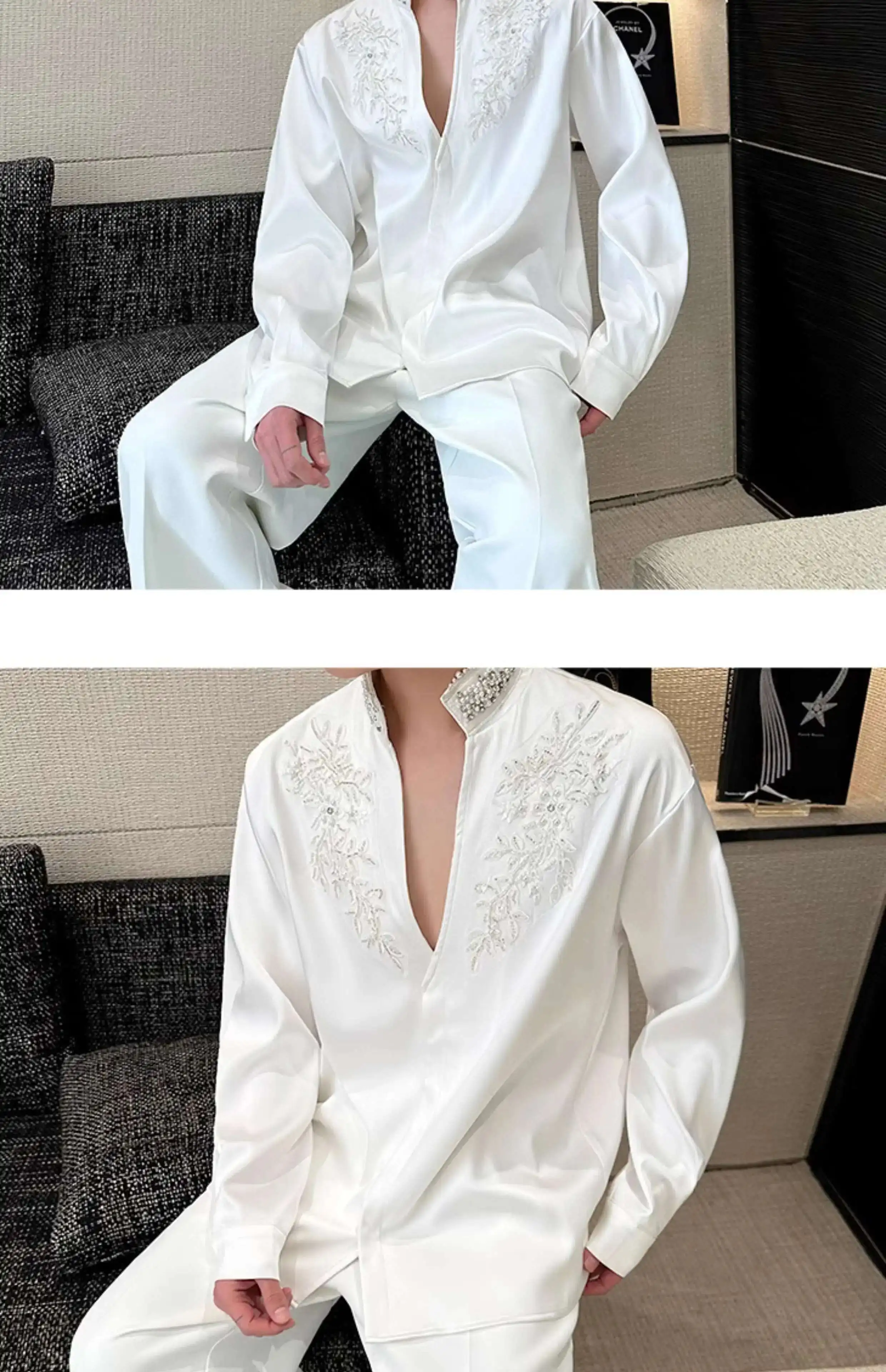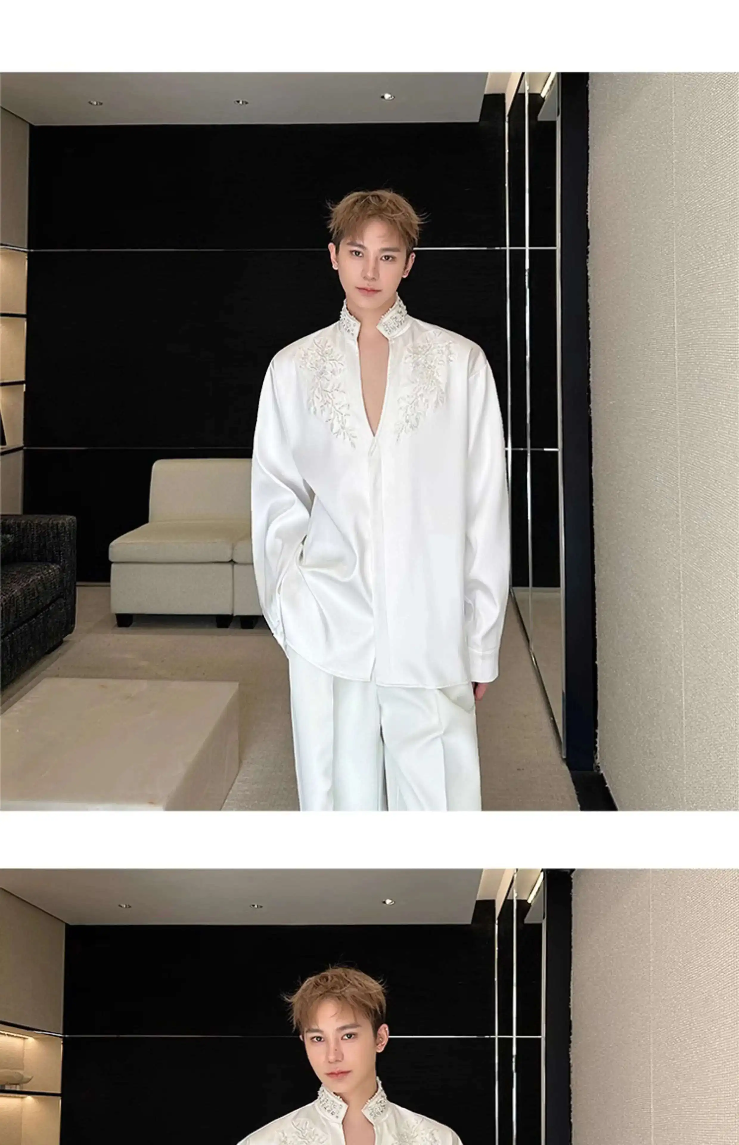 AIDASE  -  Pearl Flower Design Men's Shirts Stand Collar Diamond Solid Color Long Sleeve Cloth Loose Covered Button Male Tops