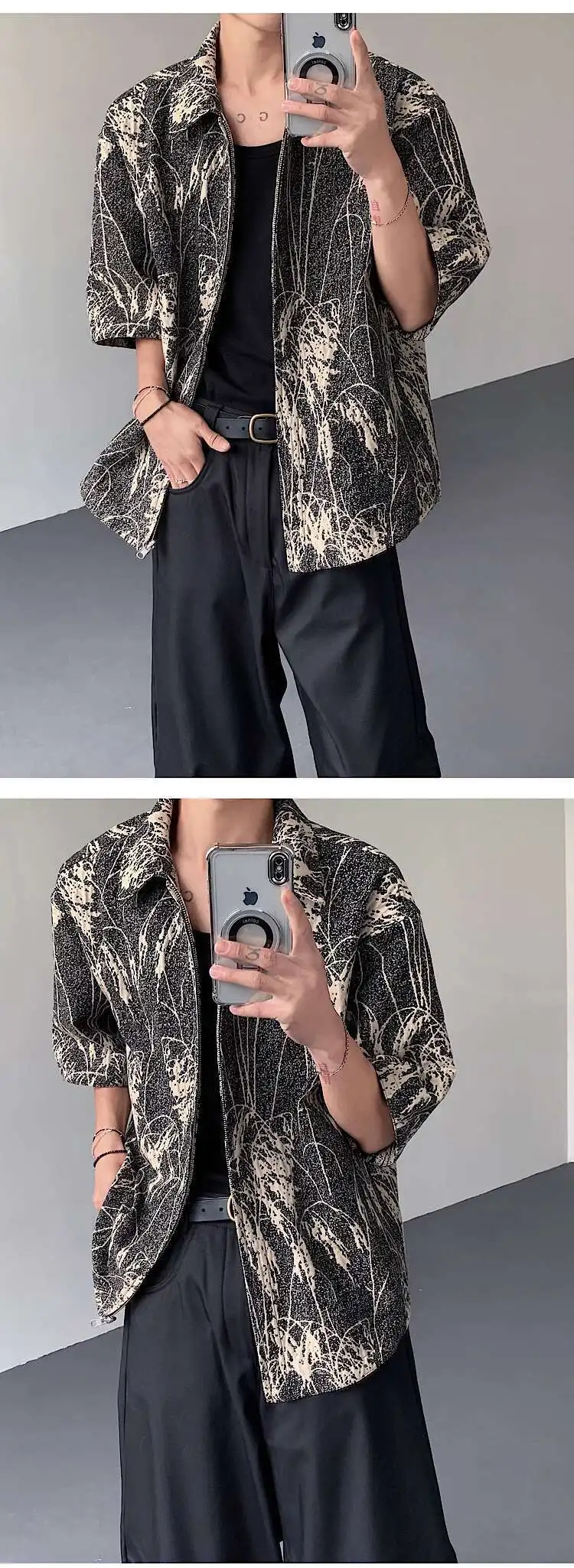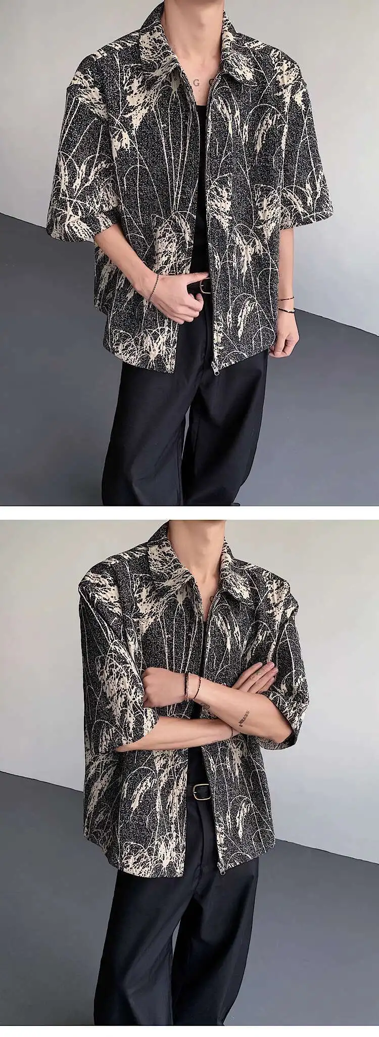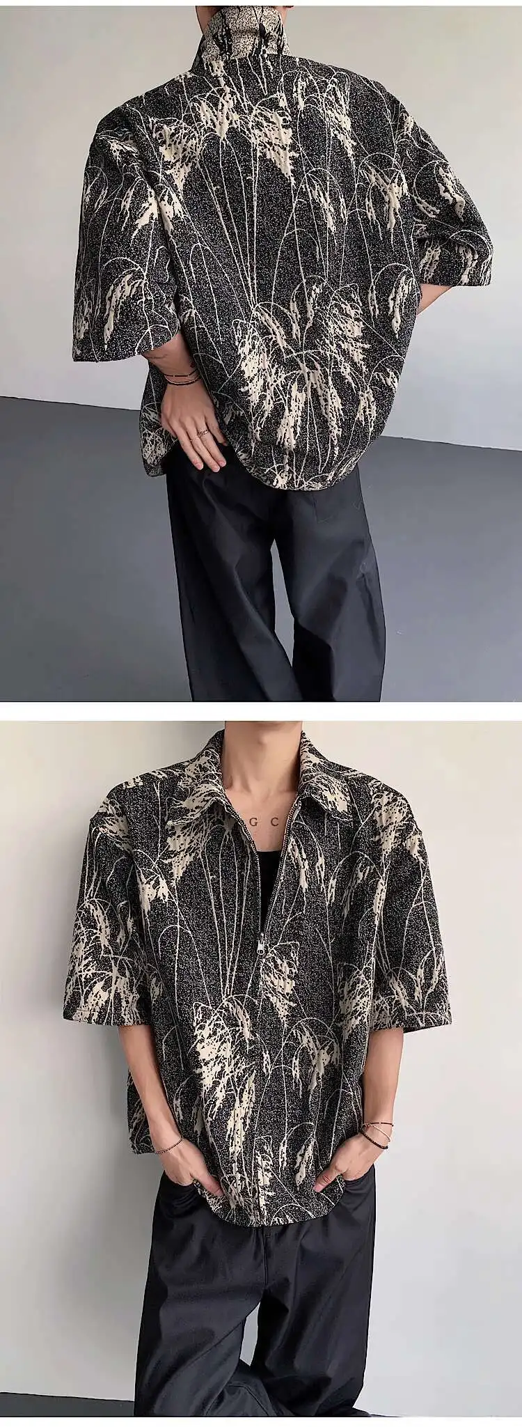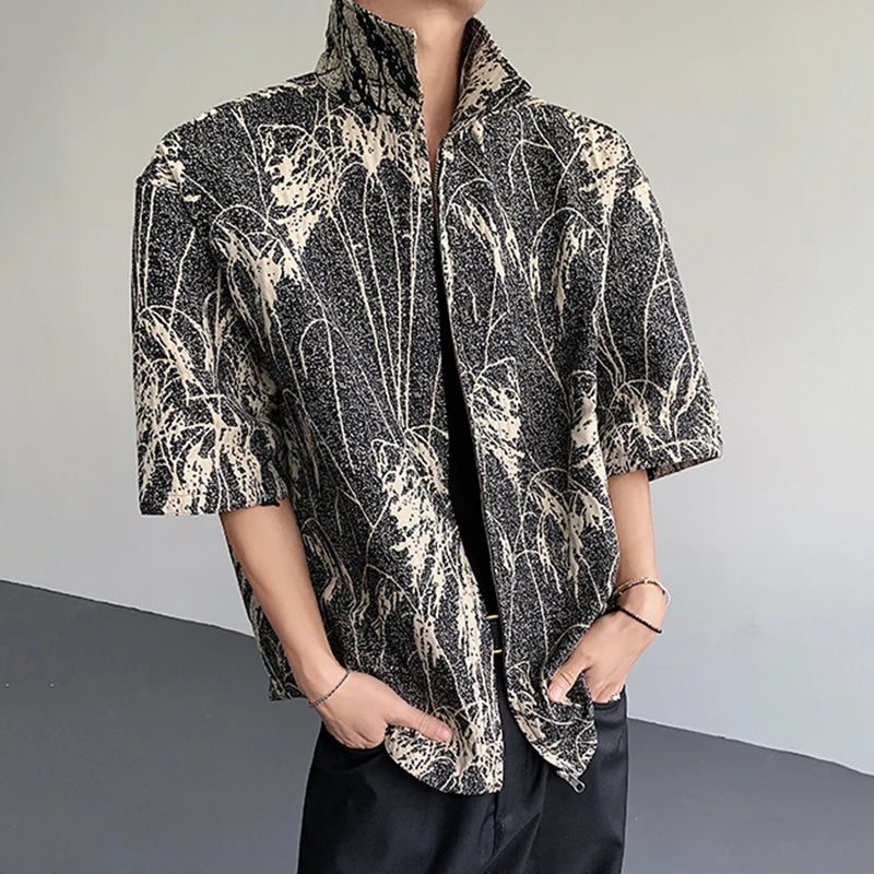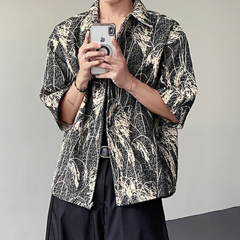 AIDASE - Reed Double-sided Men's Shirt Jacquard Texture Pattern Decoration Single-breasted Short Sleeved Lapel Casual Tops