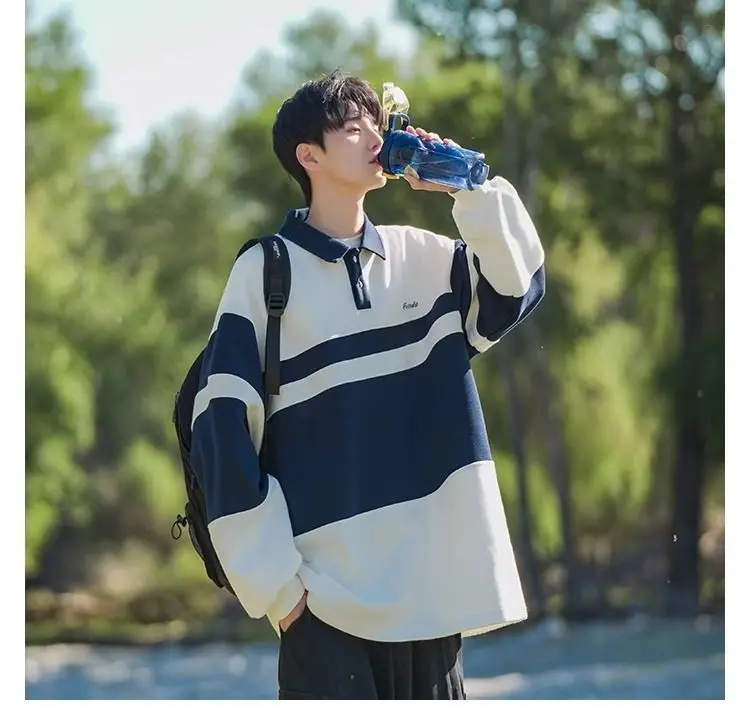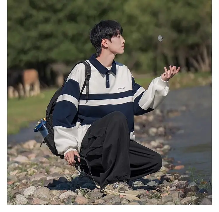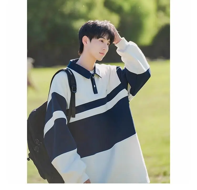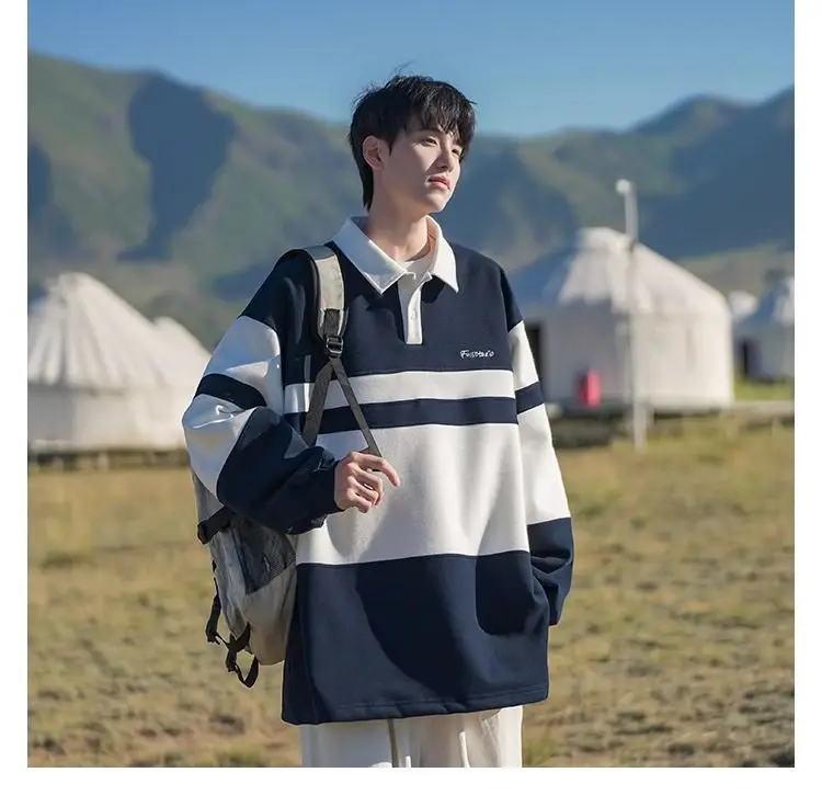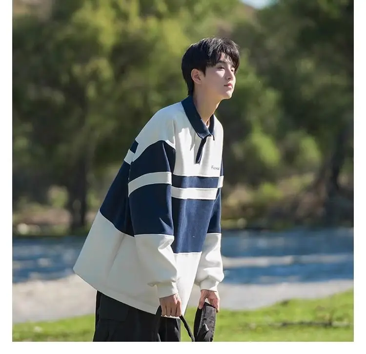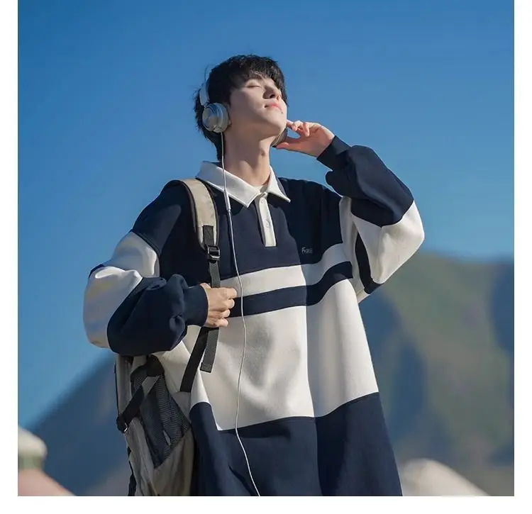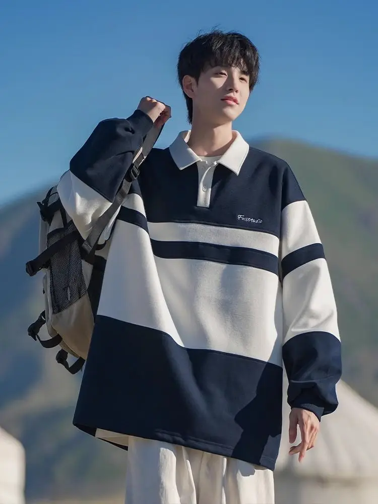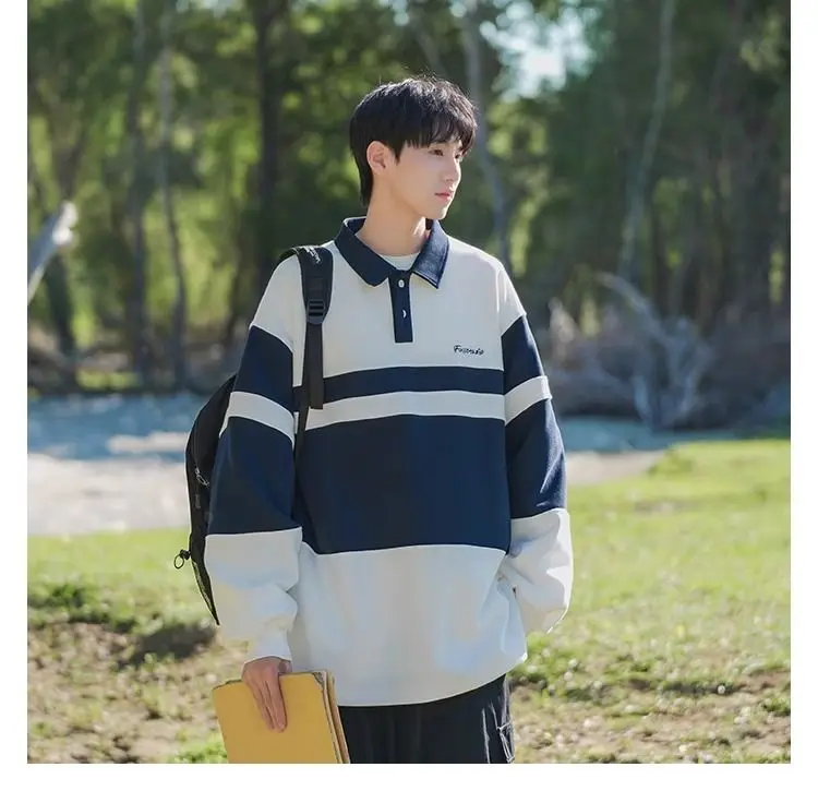AIDASE - Retro Contrast Striped POLO Collar Sweatshirt for Men Loose Fashionable Casual Top