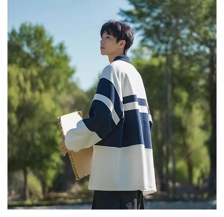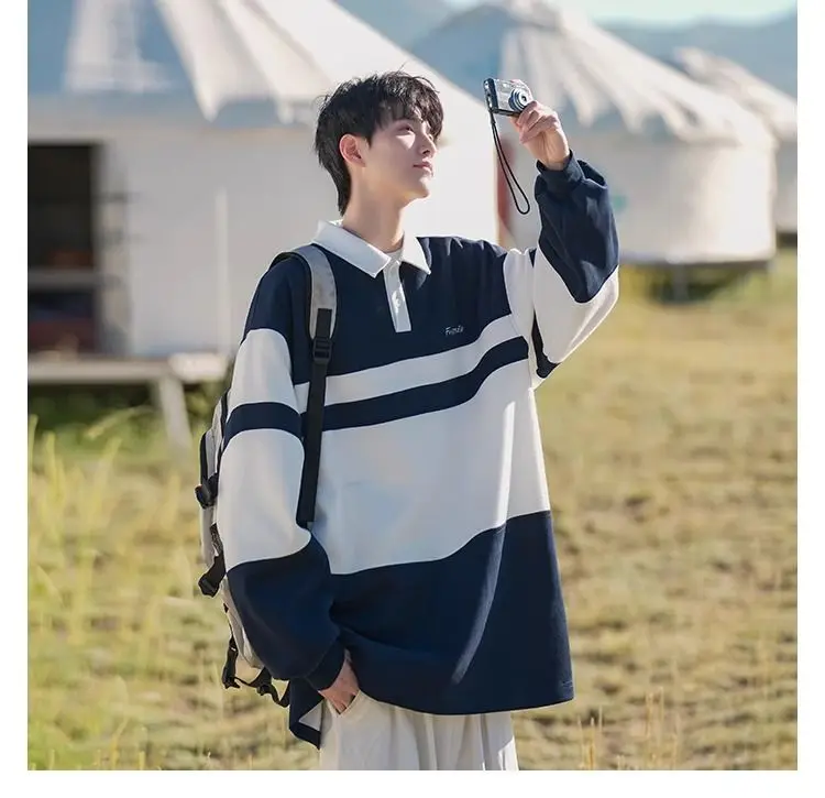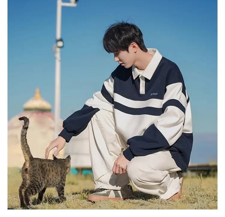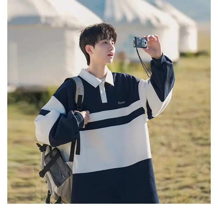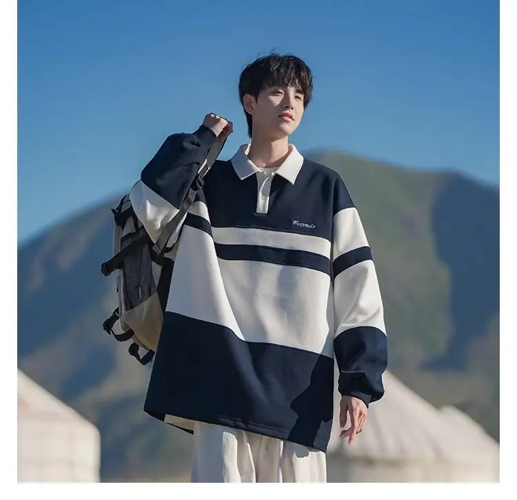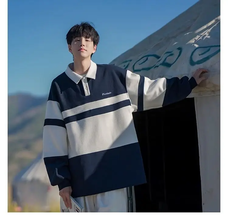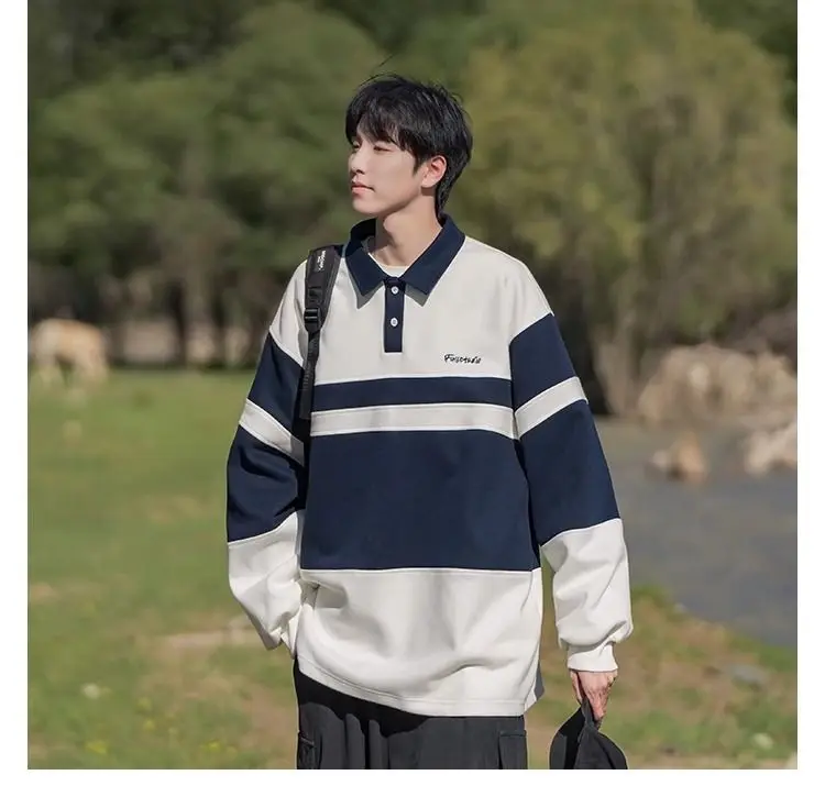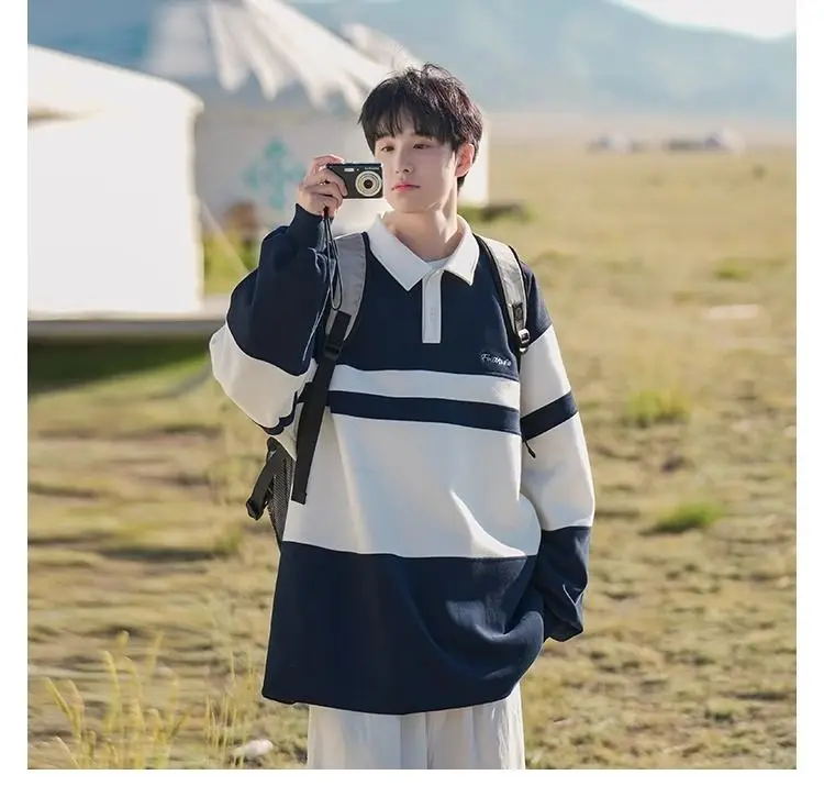 AIDASE - Retro Contrast Striped POLO Collar Sweatshirt for Men Loose Fashionable Casual Top
