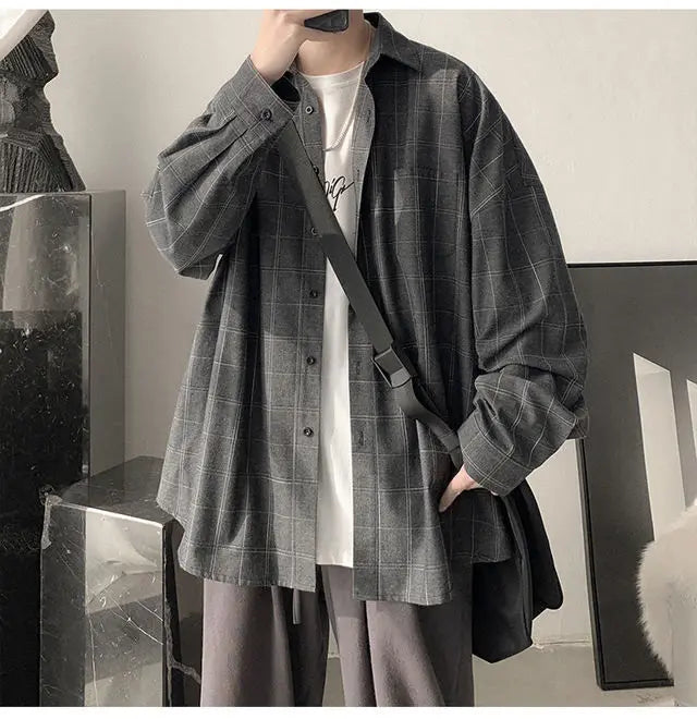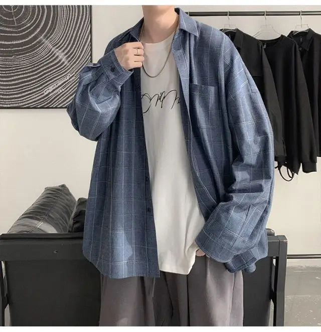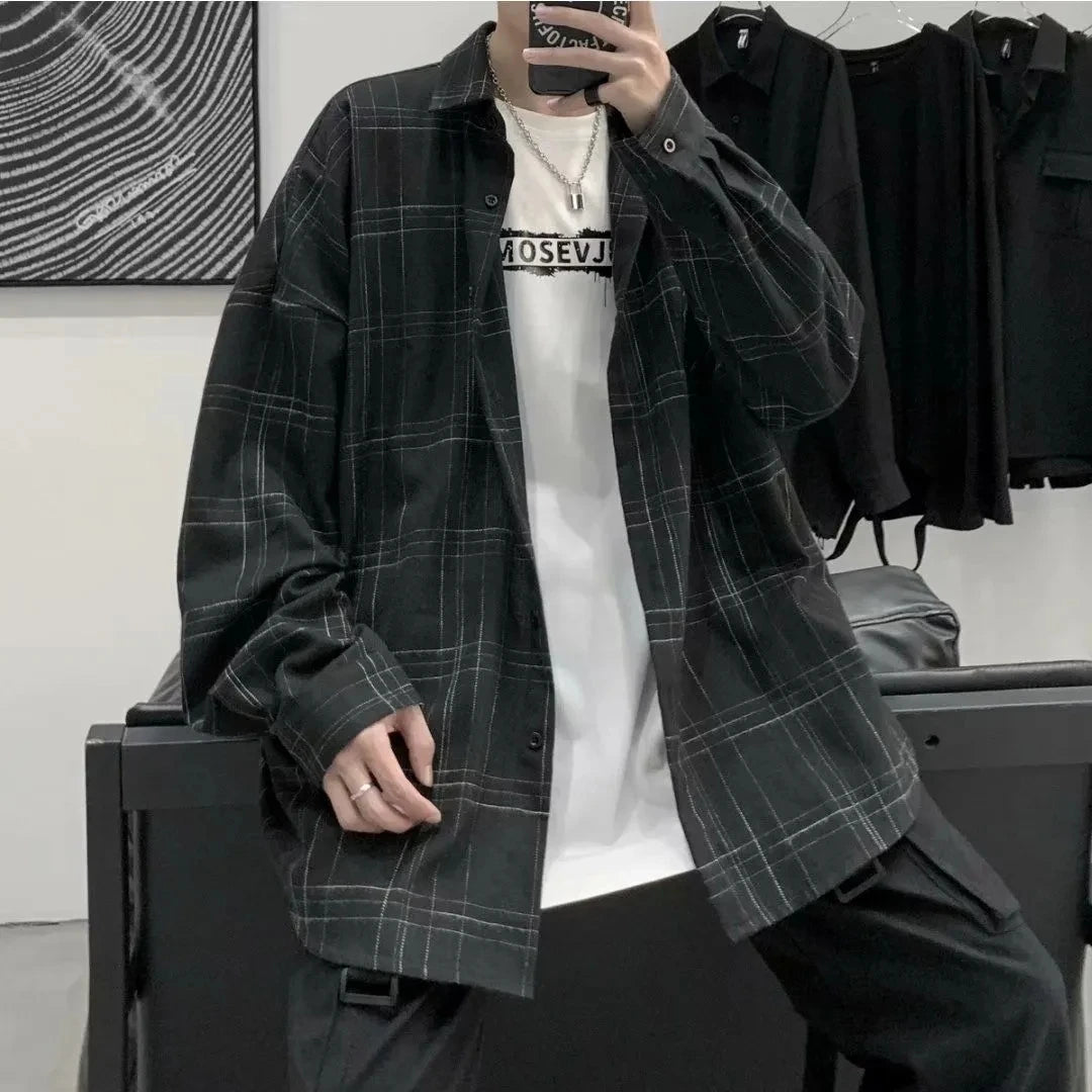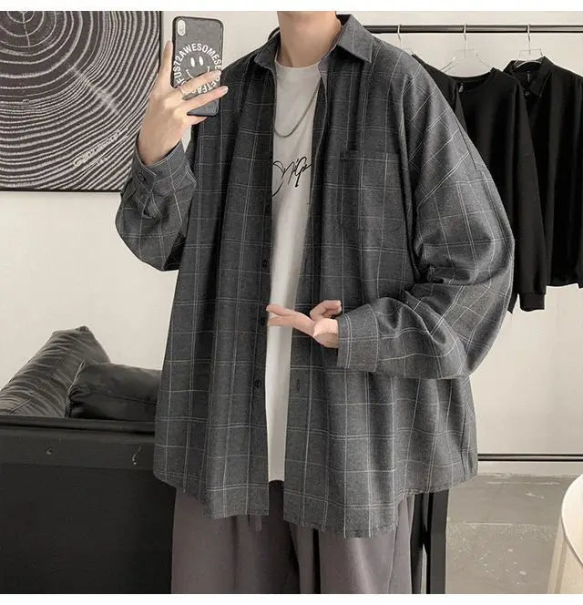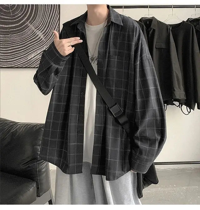 Aidase Spring Autumn Versatile Men's Cool Casual Loose Tess Button T-Shirt Soft Long Sleeve College Style Plaid Student Sport Pocket
