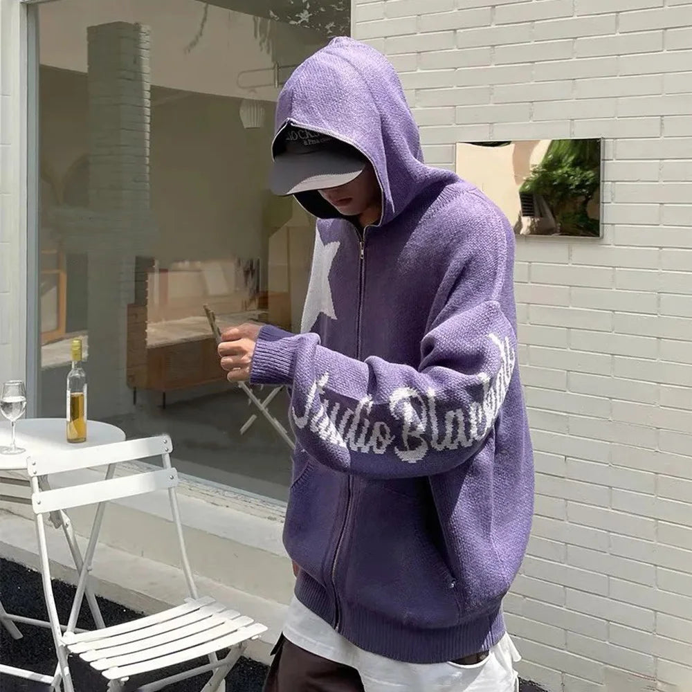 Star Zipper Cardigan Men Hooded Knitted Sweater Y2K Streetwear Spring Fall American Loose Casual All-match Hooded Sweater Jacket