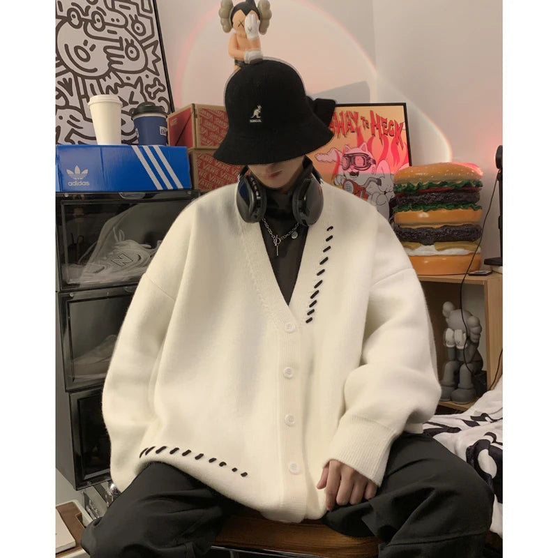 Aidase Striped Plush V-neck Sweater Men's Loose Casual Brushed Knit Trendy Couple Versatile Comfortable Harajuku High Street Cardigan