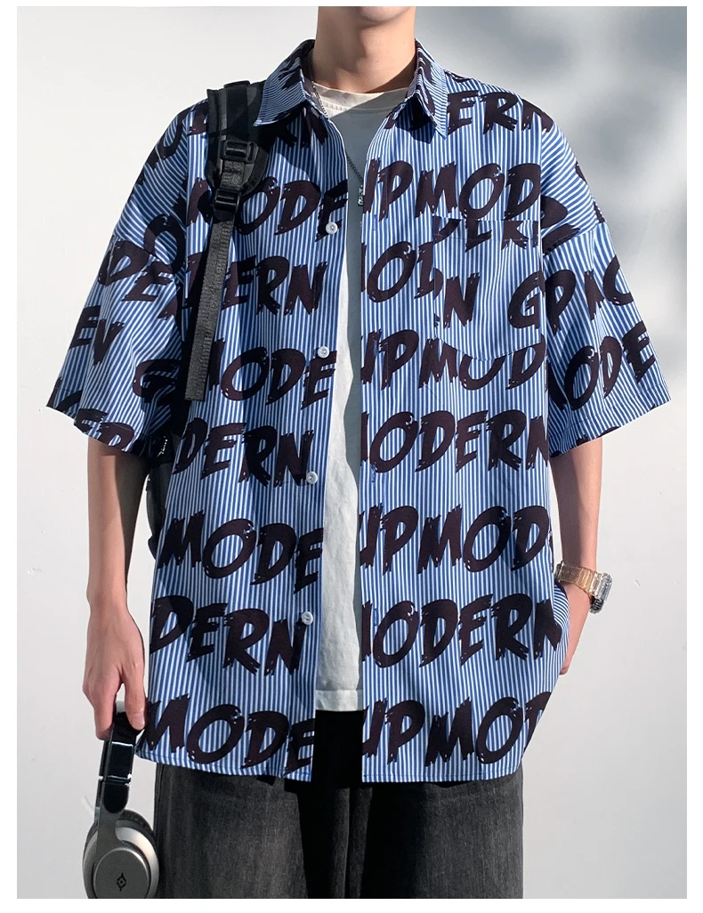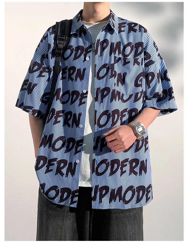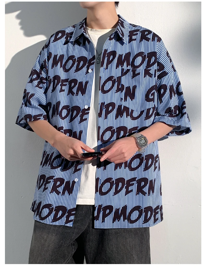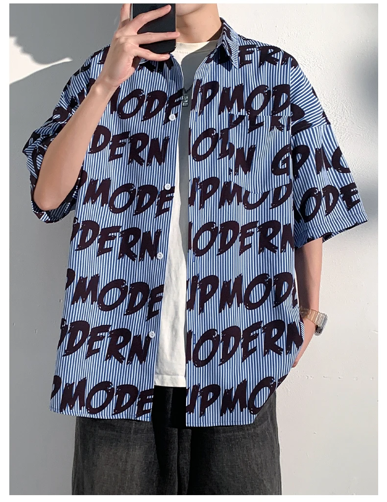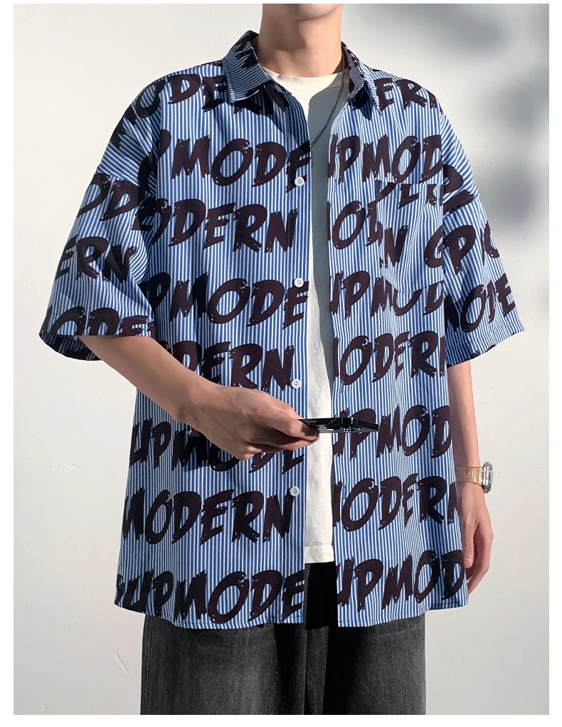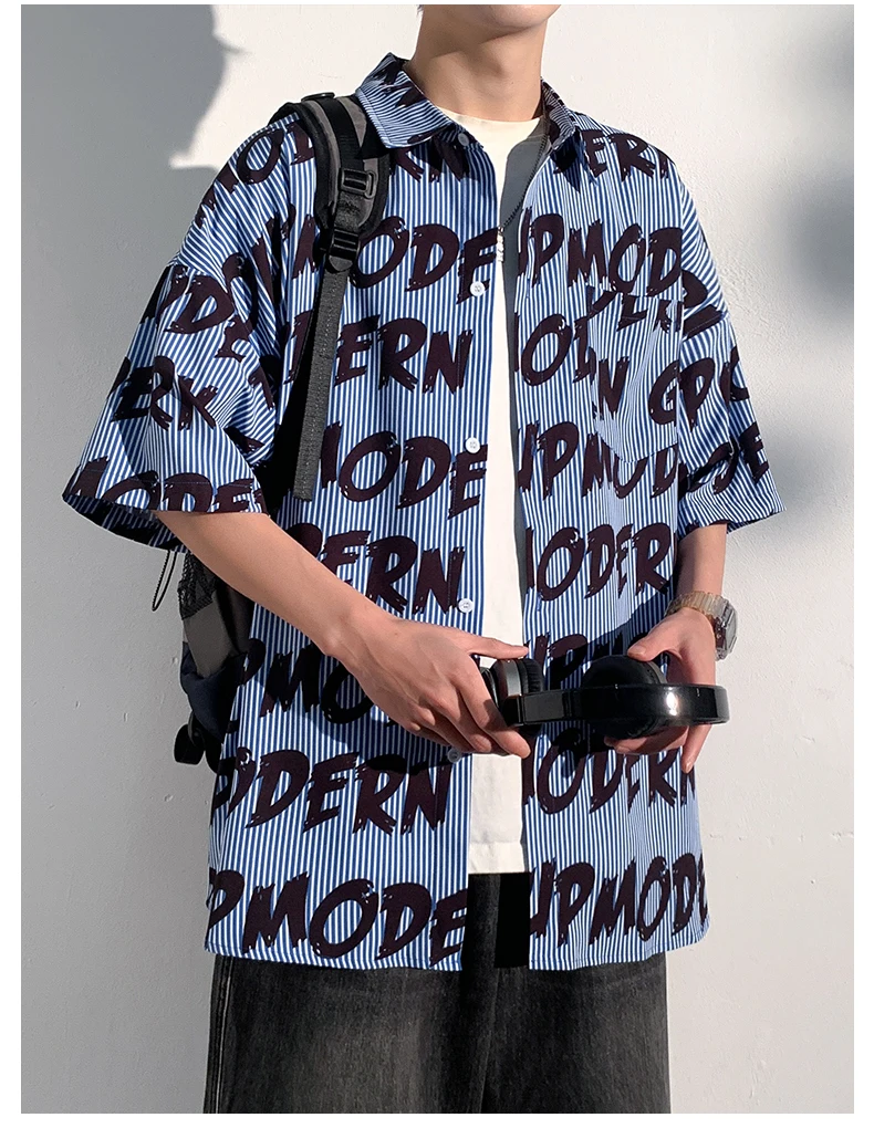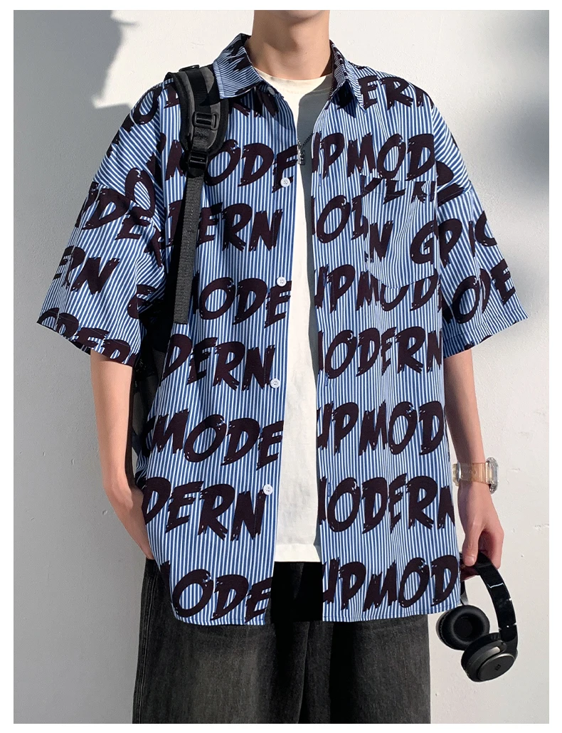 Summer Men Letter Printed Shirts Hawaiian Loose Shirts Short Sleeve Beach Loose Tops Blouse Streetwear Dress Clothing