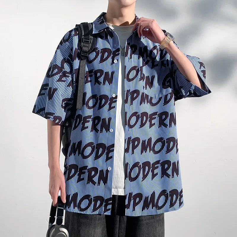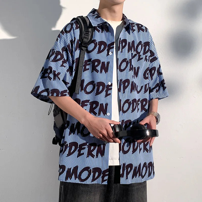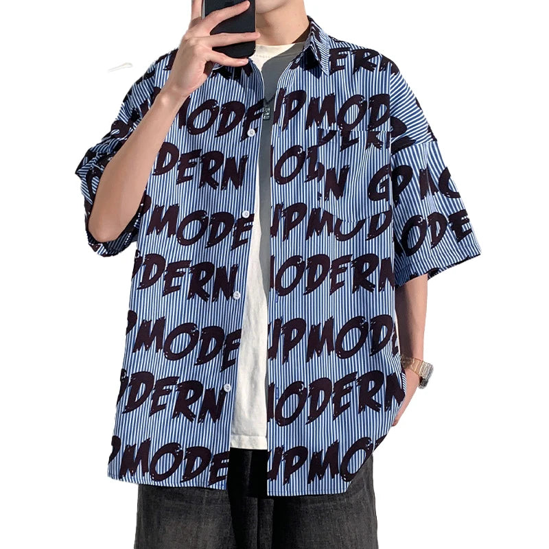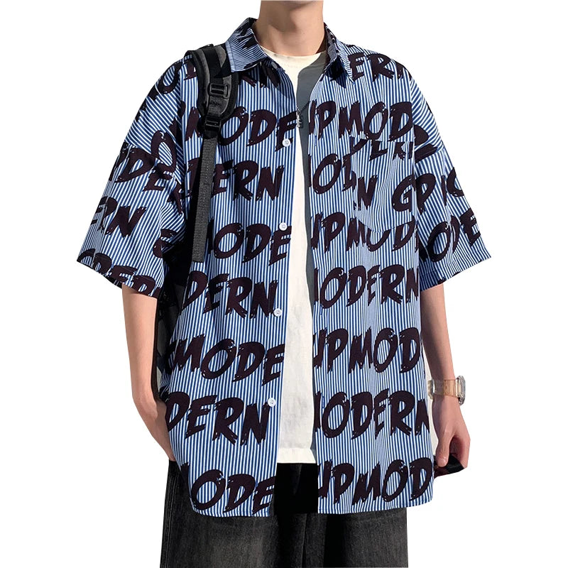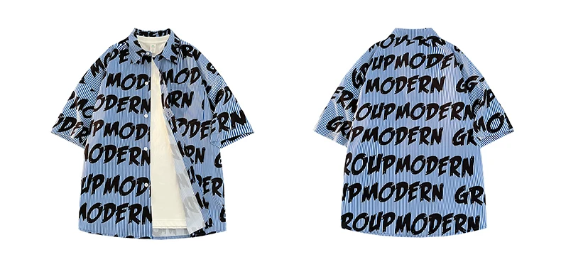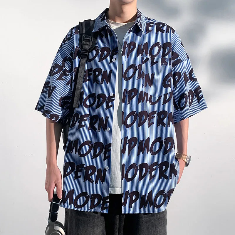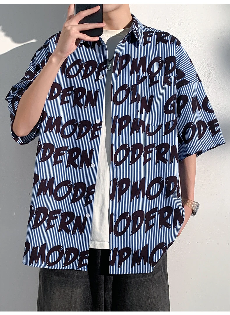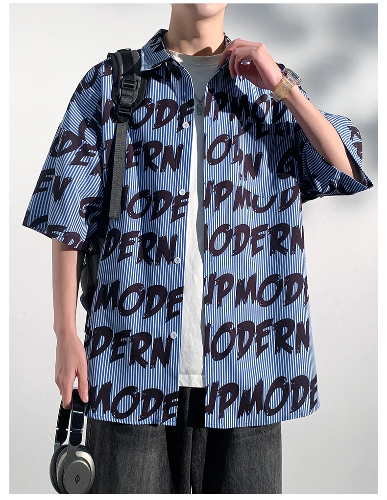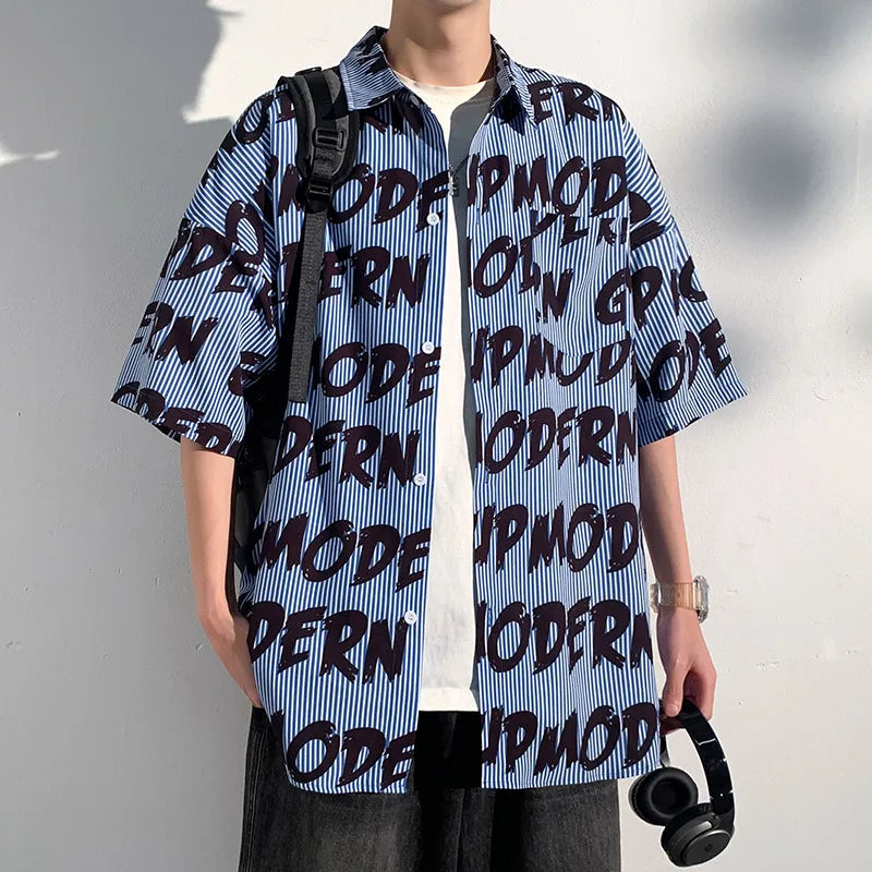 Summer Men Letter Printed Shirts Hawaiian Loose Shirts Short Sleeve Beach Loose Tops Blouse Streetwear Dress Clothing