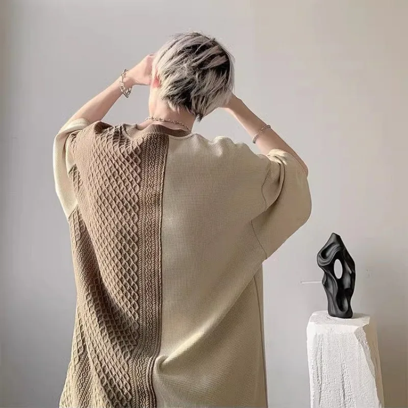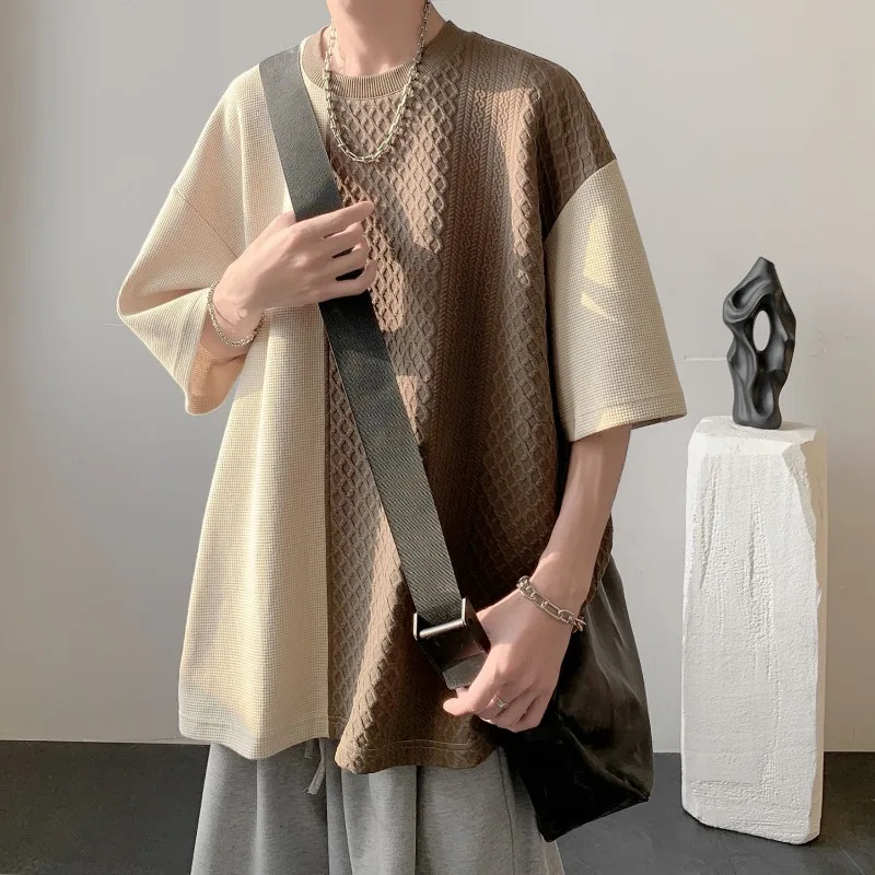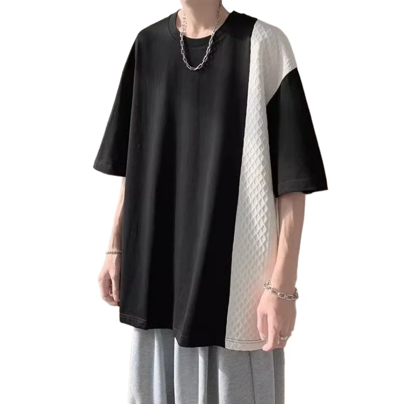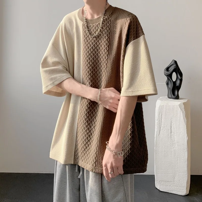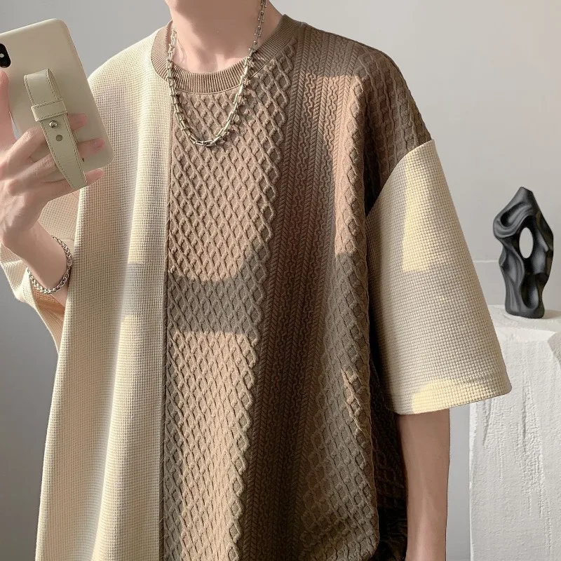 AIDASE - Summer Men's Plaid Short Sleeved T-shirt Contrasting Patchwork Retro Top Loose Casual Round Neck Male Pullover