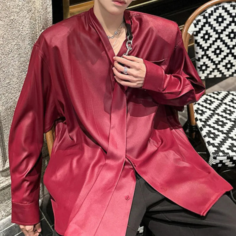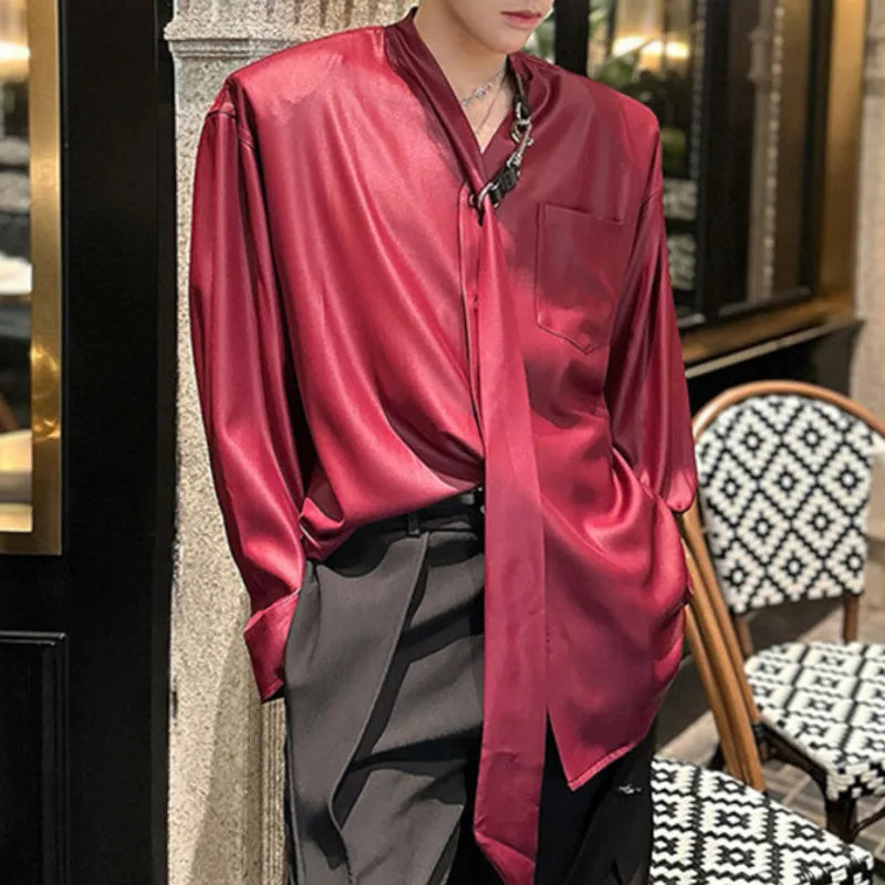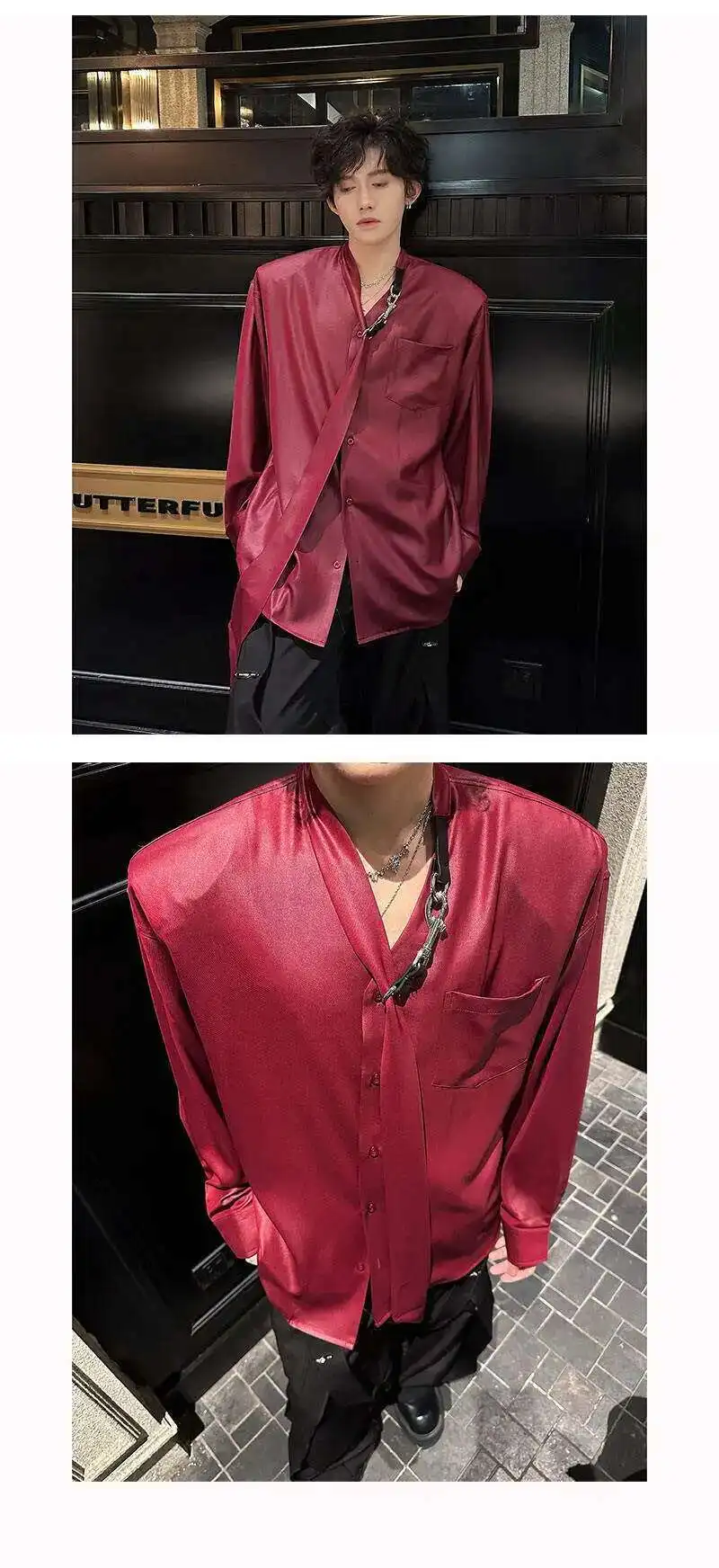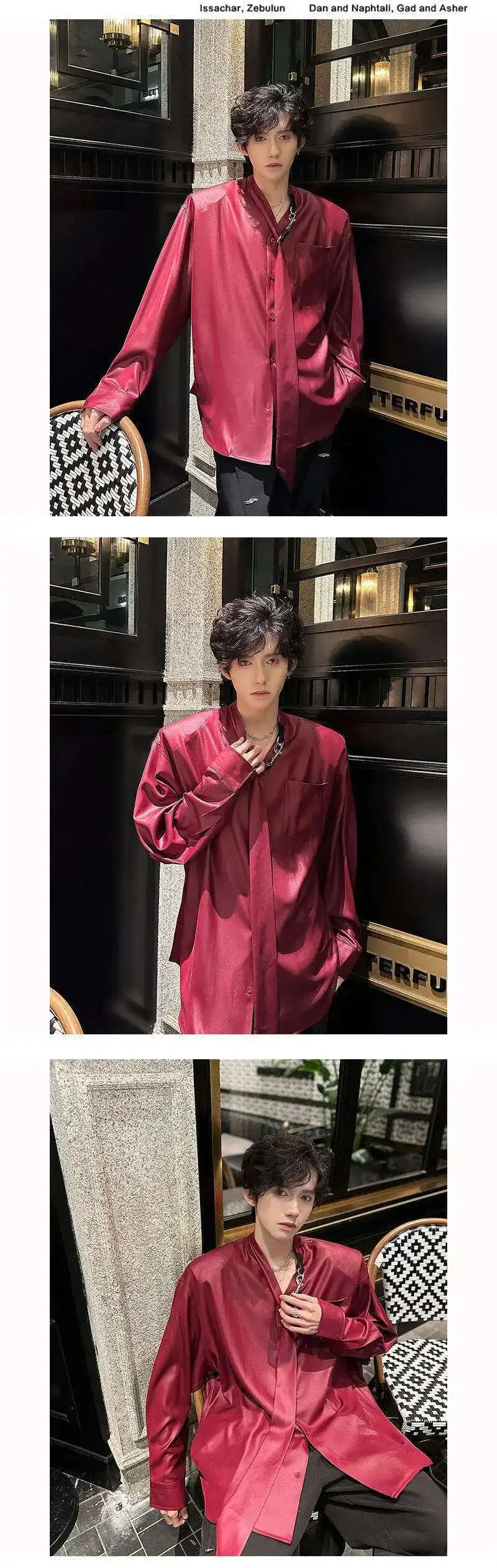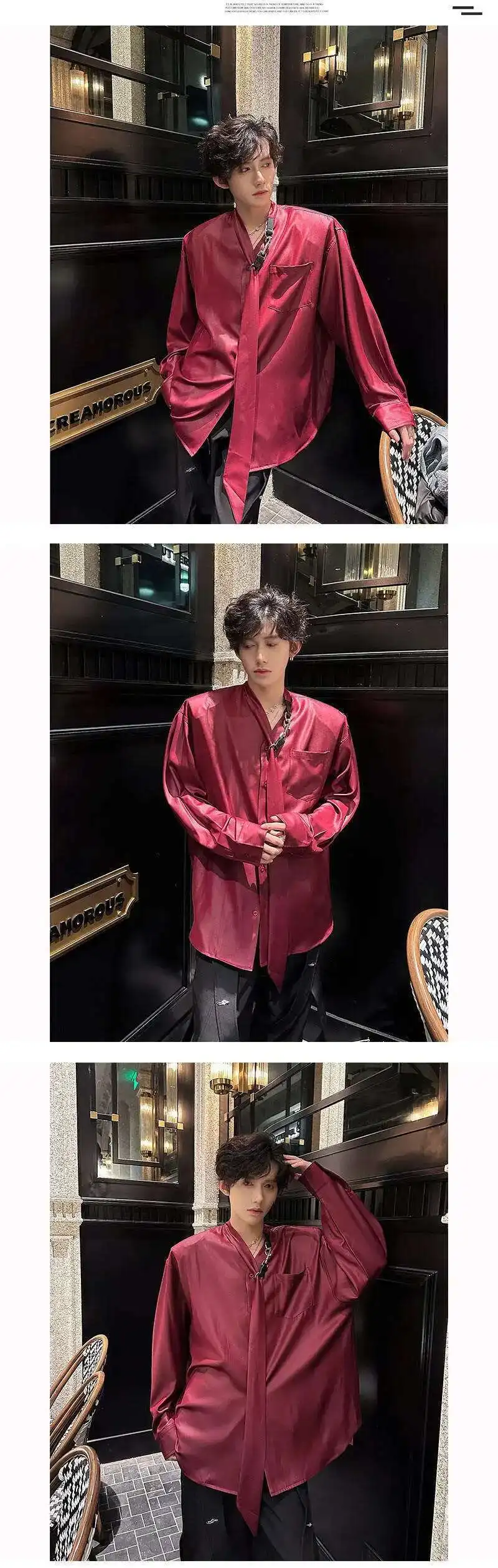AIDASE - Summer Men's Shirt Korean Style Ribbon Bright Silk Smooth Solid Color Long Sleeve Men Shirts Fashion New Top Red 9W2765