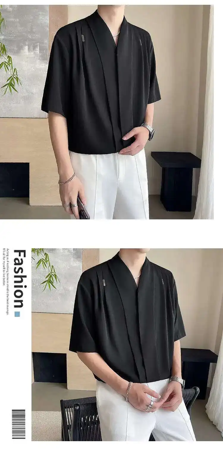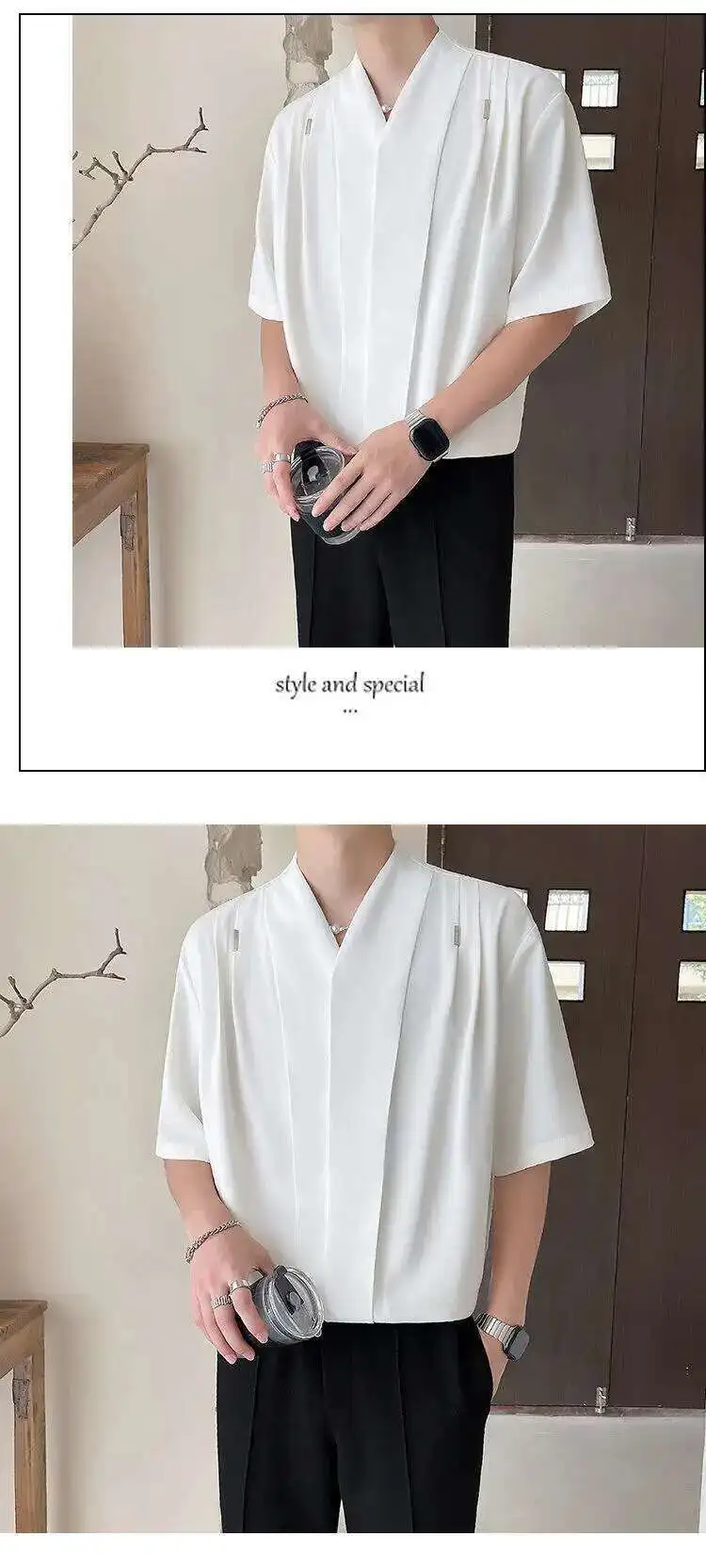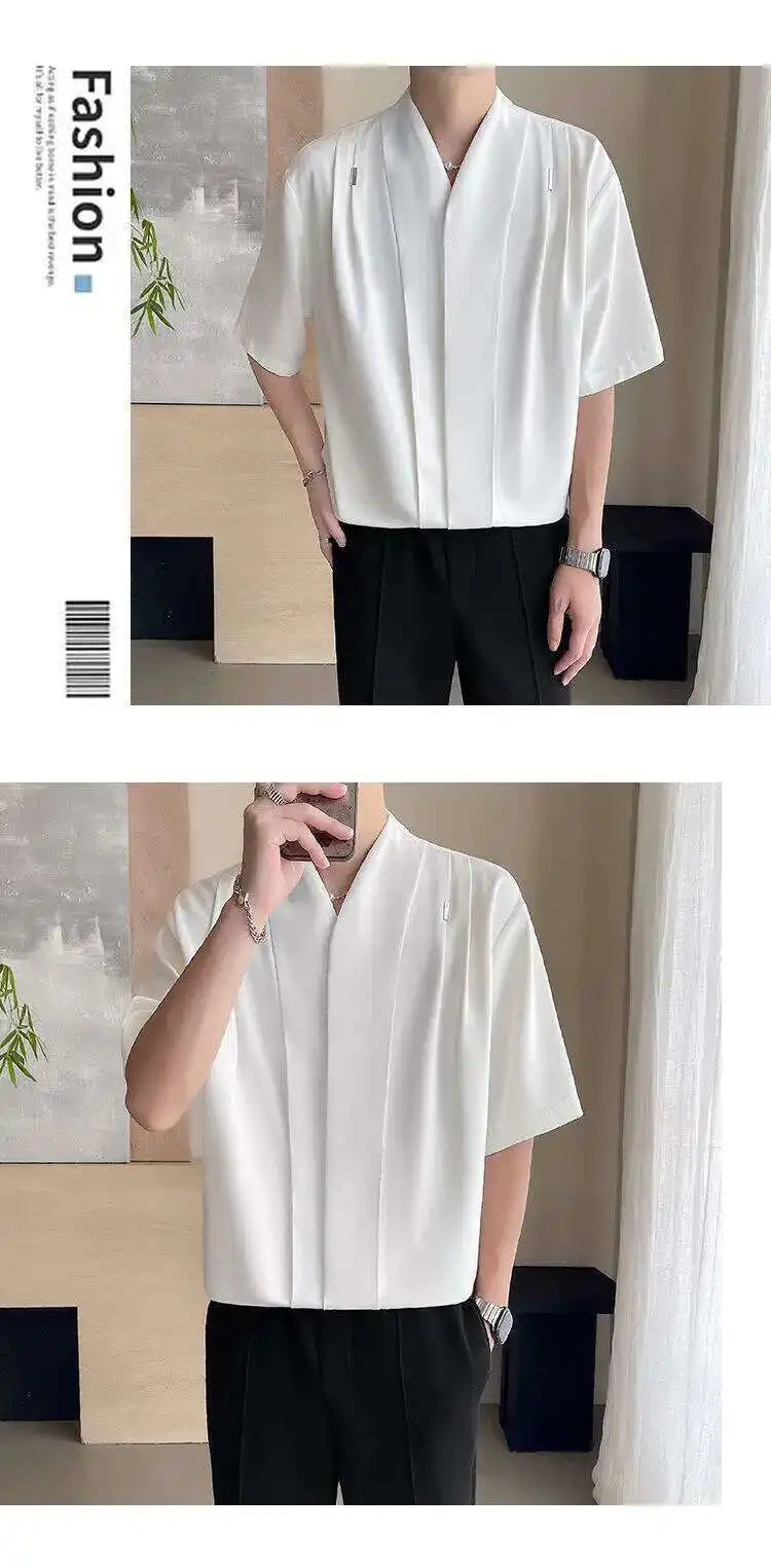 AIDASE - Summer New Ice Silk Drape Mid Sleeved Men's Shirt V-neck Korea Fashion Casual Male Tops Loose