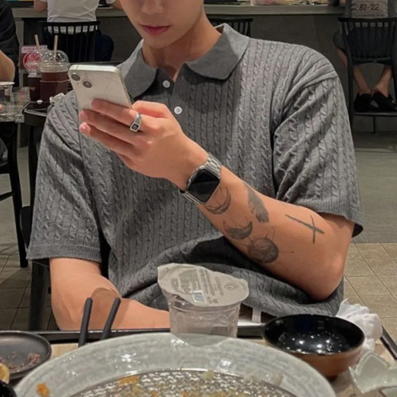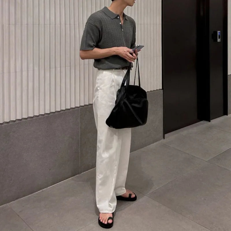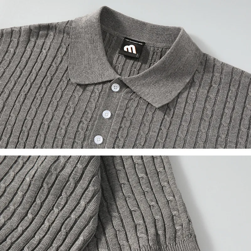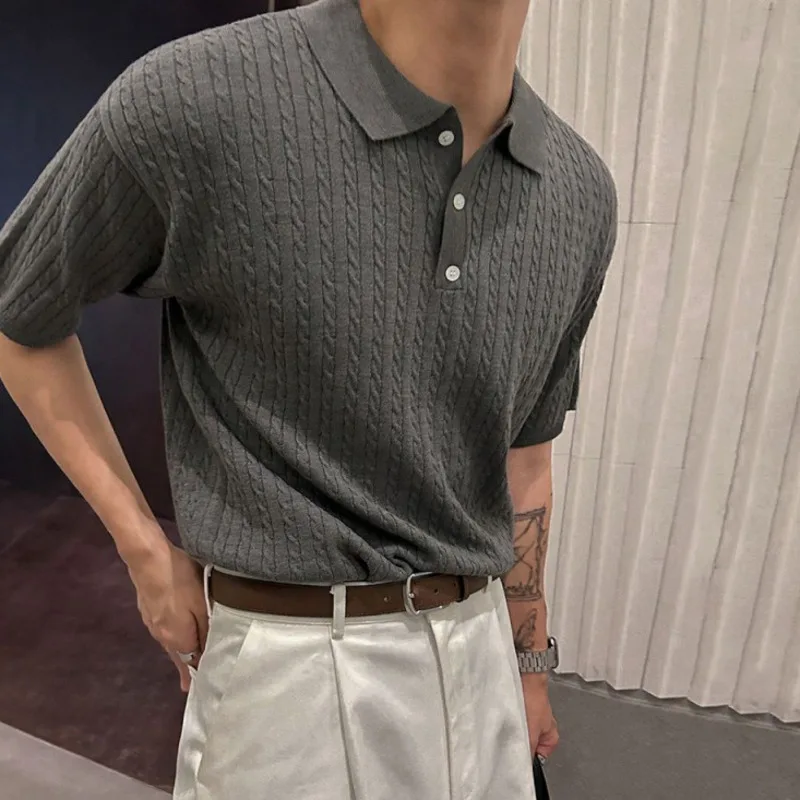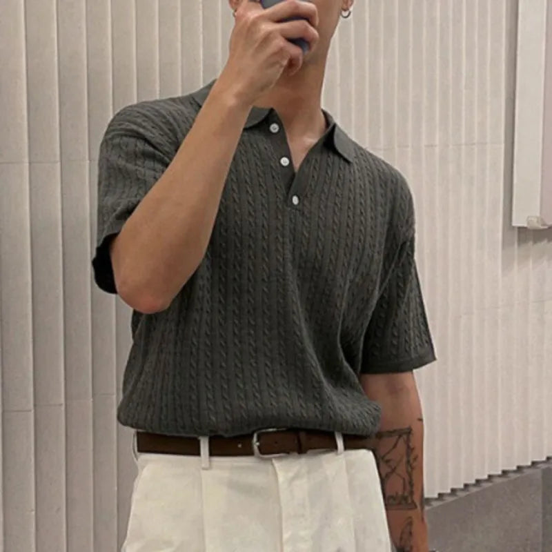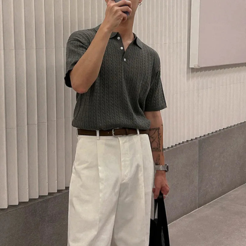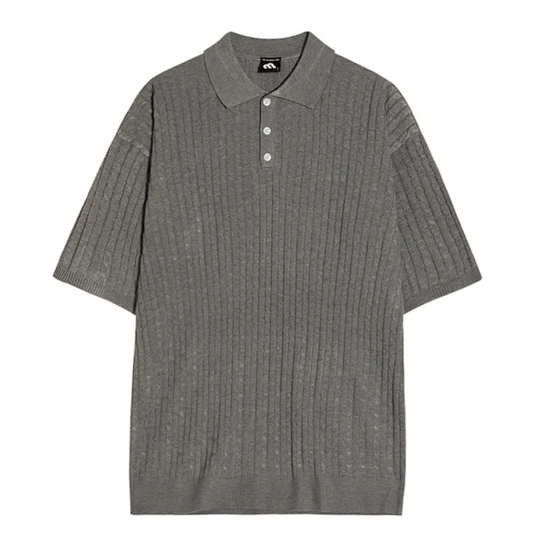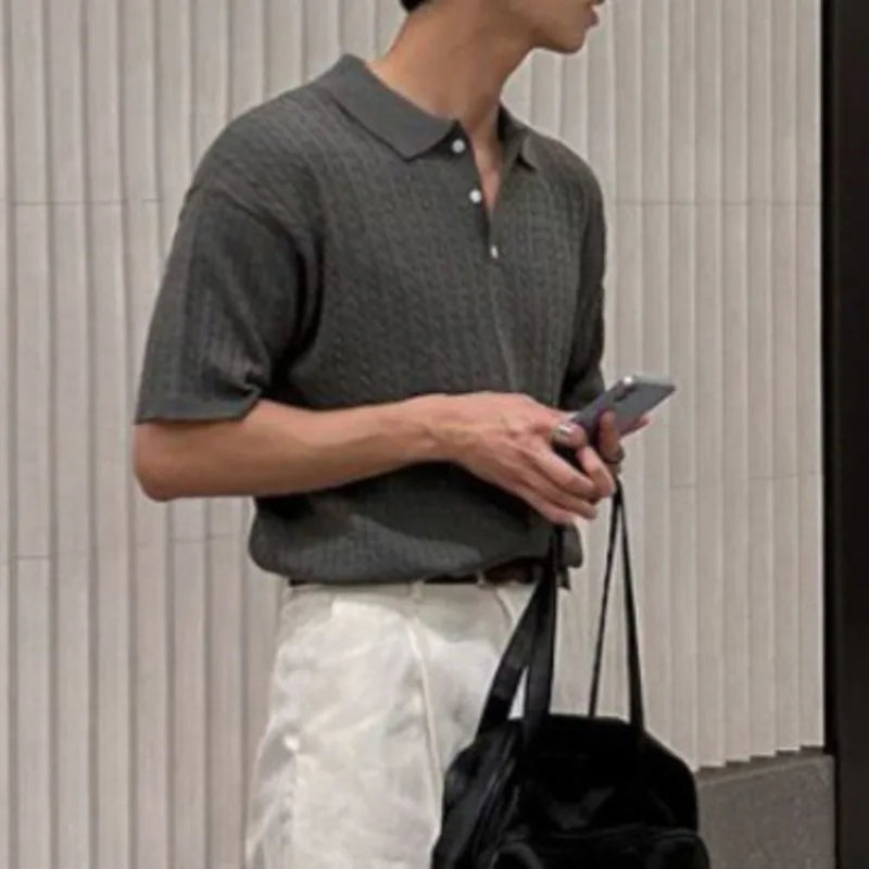AIDASE - Summer New Men Ins Fashion Korean High Street Tees Casual Hemp Pattern Turn-down Collar Knitted Short Sleeve T-shirt HK5143
