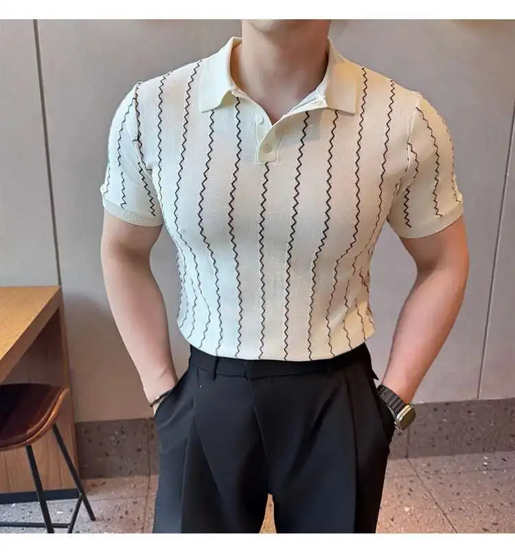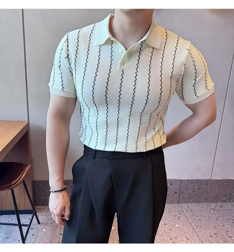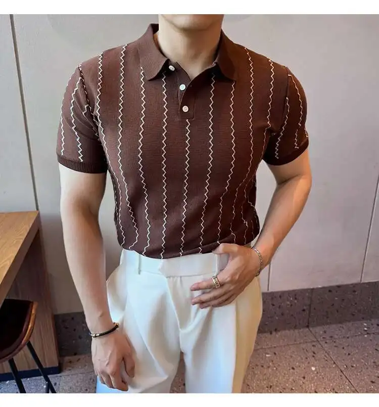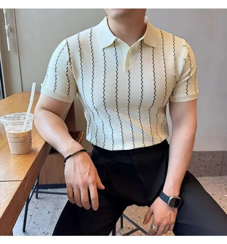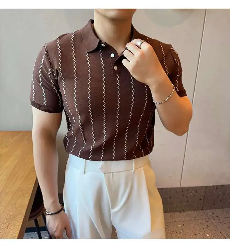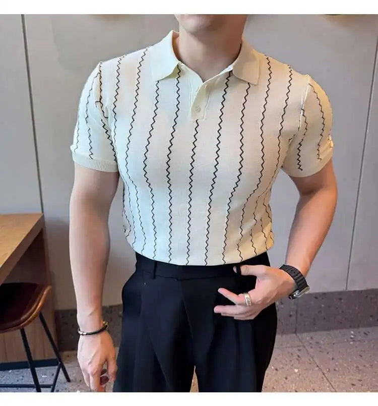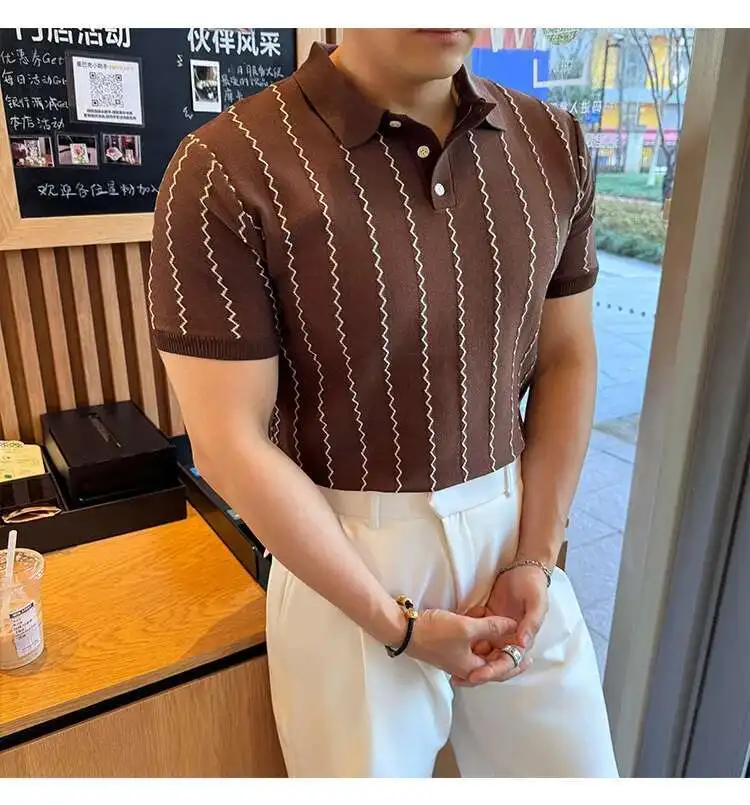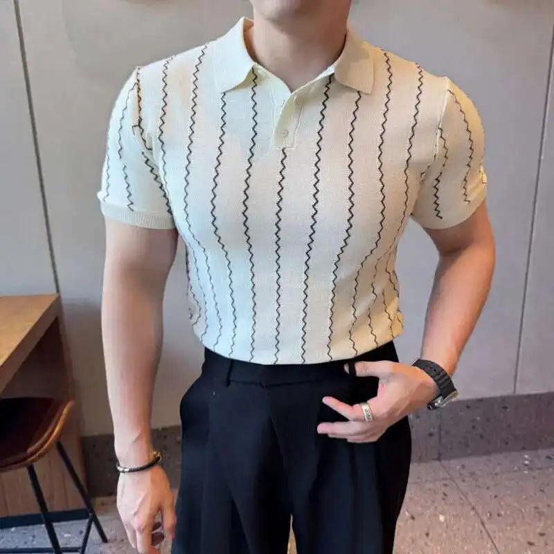 AIDASE - Summer Thin Striped Ice Silk Short Sleeved T-shirt Cool Turn-down Collar American Male Tops