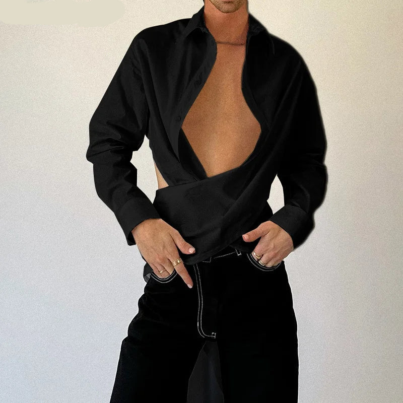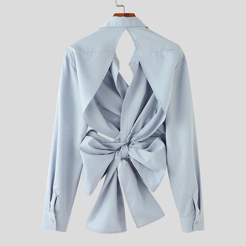 AIDASE - Tops American Style Fashion Sexy Men Deconstructive Backless Bow Shirts Casual Male Solid Loose Long Sleeved Blouse