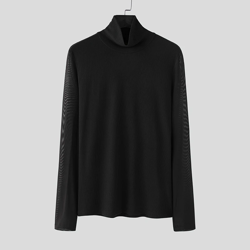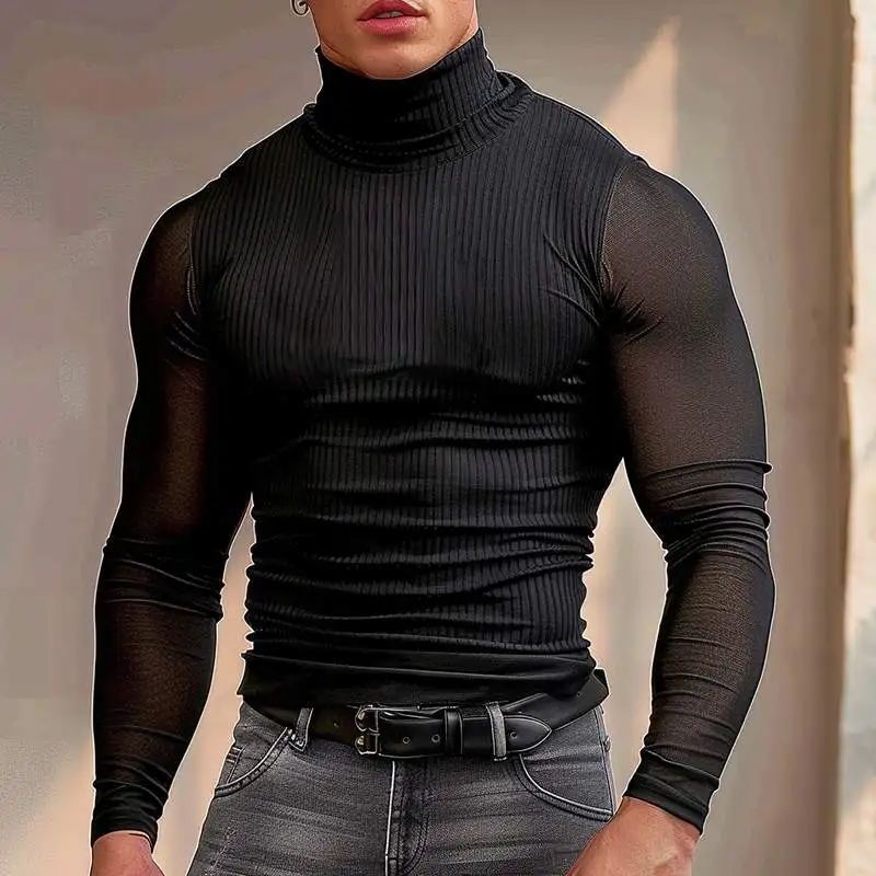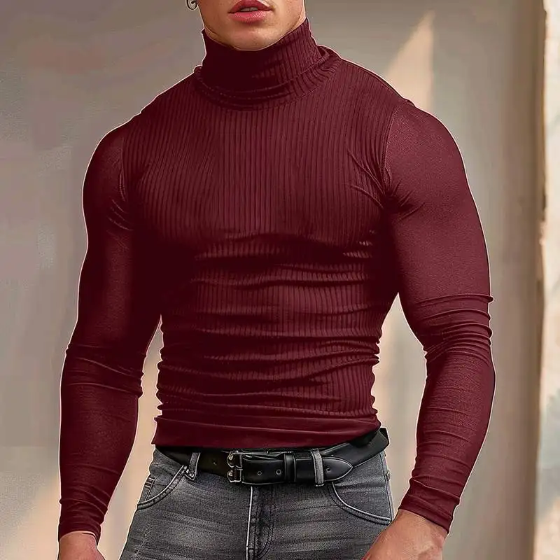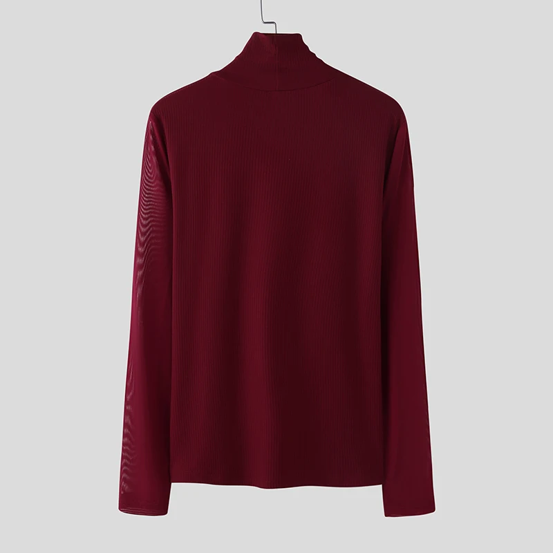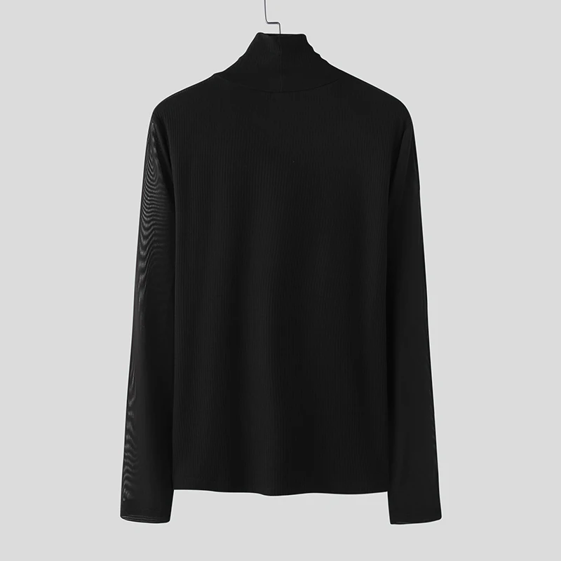 Aidase Tops American Style Men's Solid Stripe Texture Design T-shirts Casual Simple Long Sleeved High Neck Camiseta S-5XL