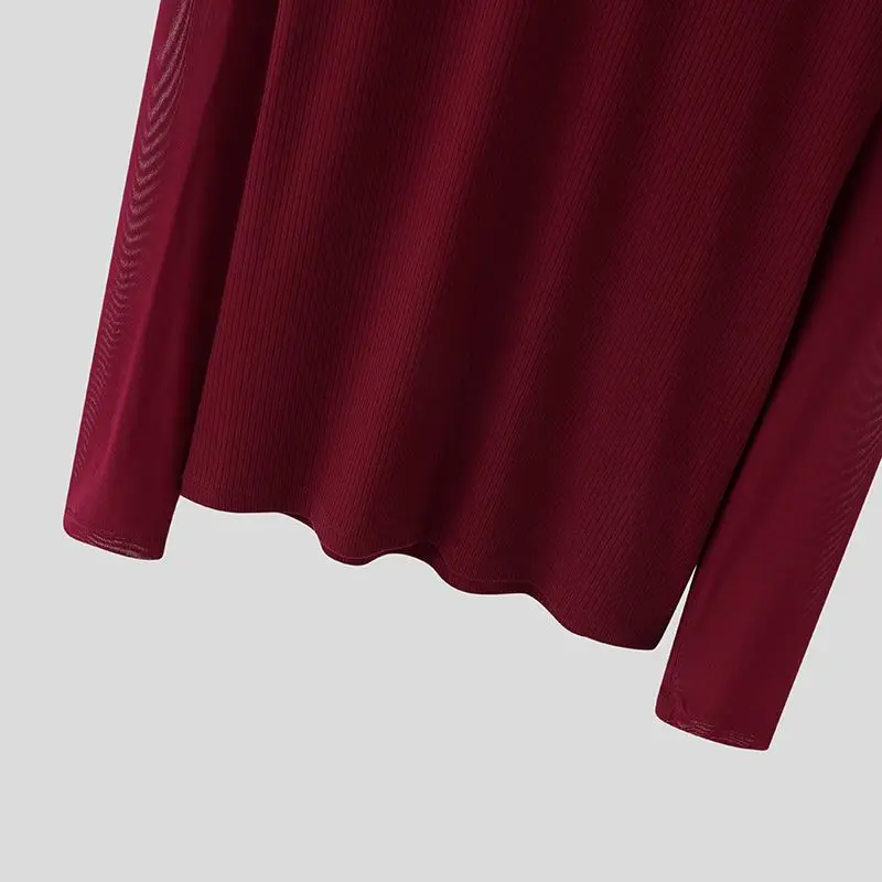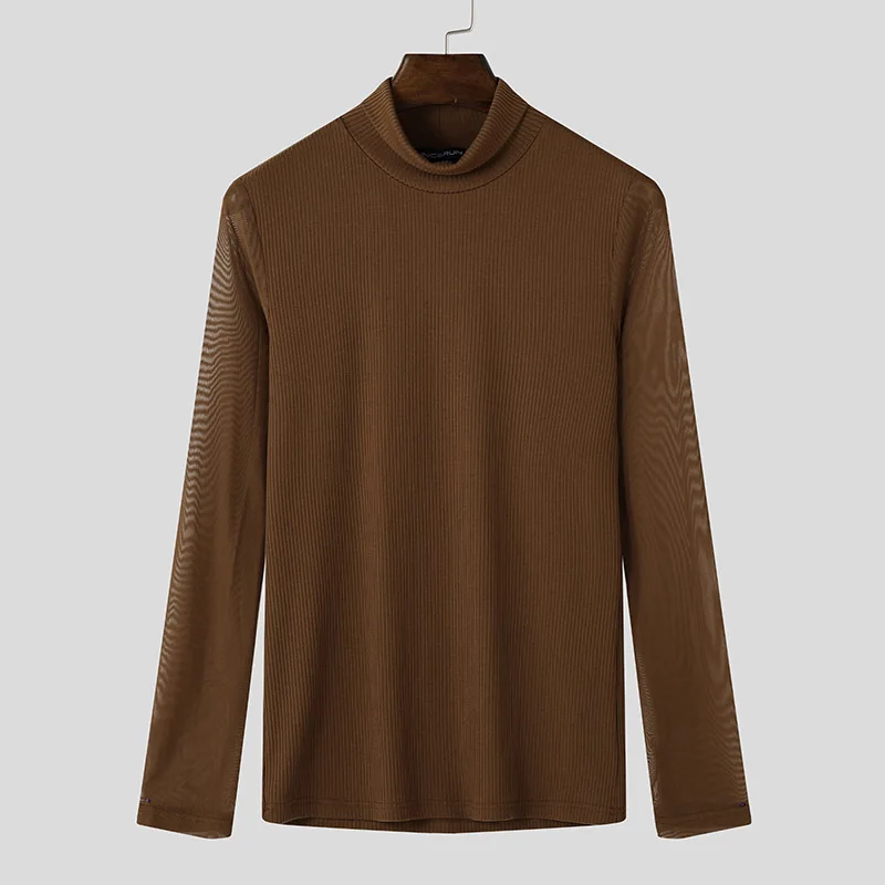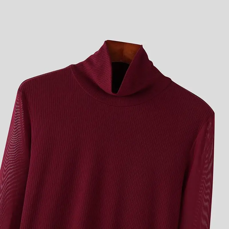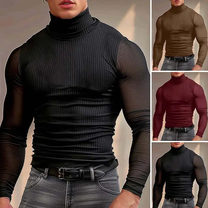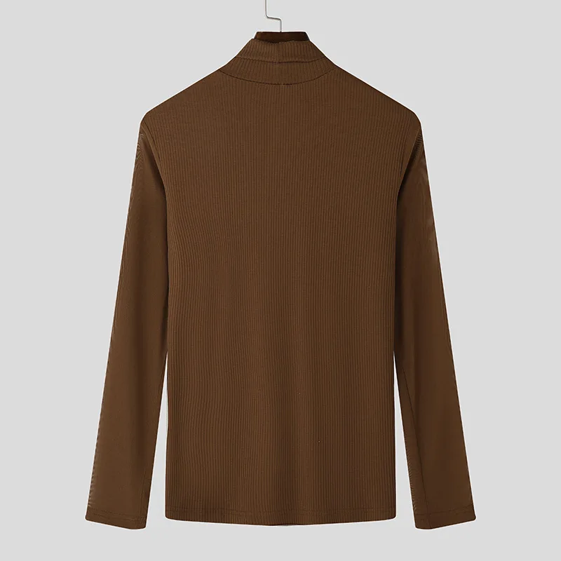 Aidase Tops American Style Men's Solid Stripe Texture Design T-shirts Casual Simple Long Sleeved High Neck Camiseta S-5XL
