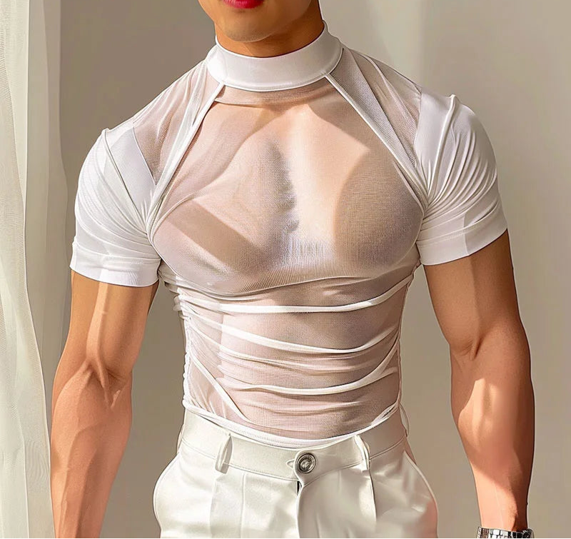 Aidase Tops Korean Style New Men's Sexy Mesh See Through T-shirts Fashion Male Half High Neck Short Sleeved Camiseta S-5XL