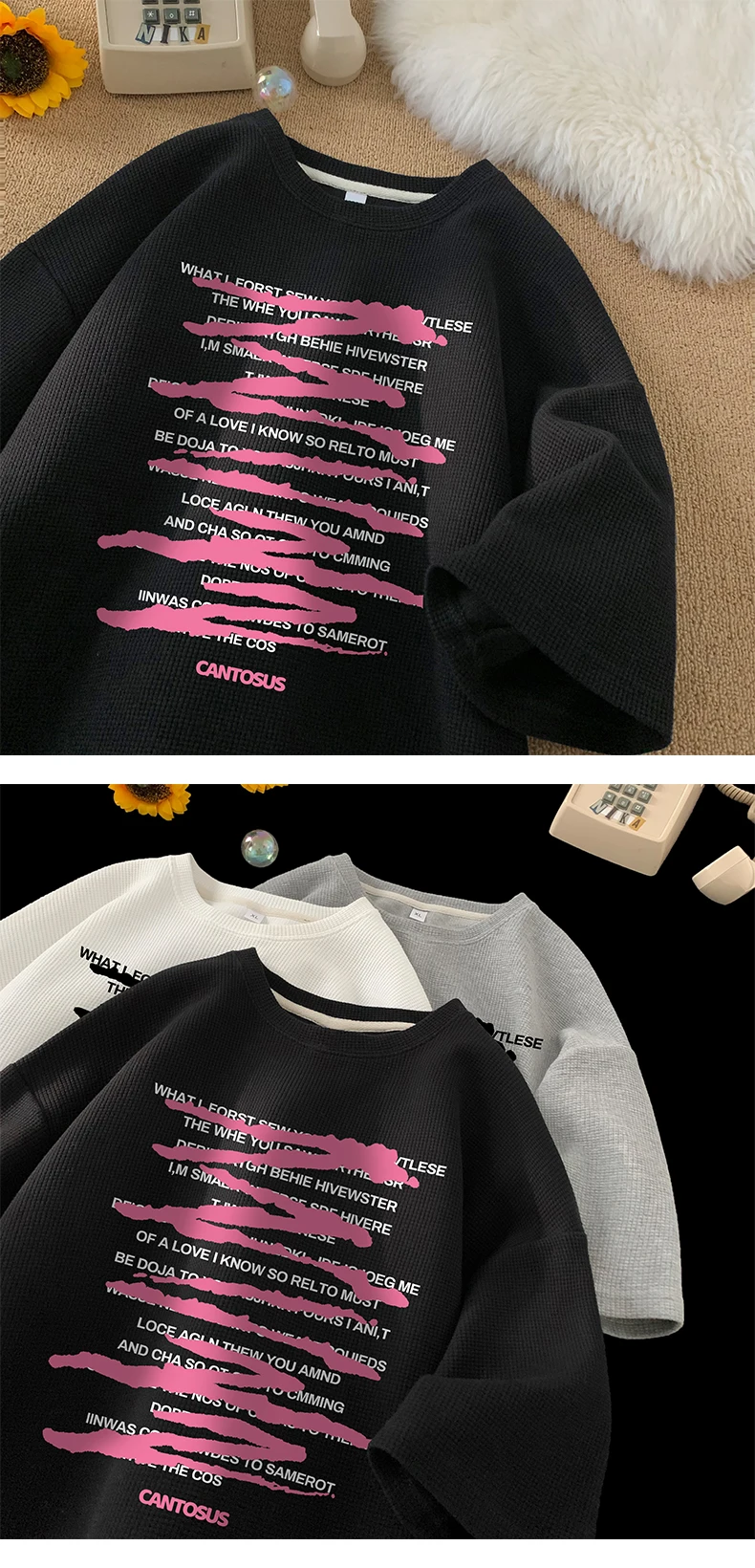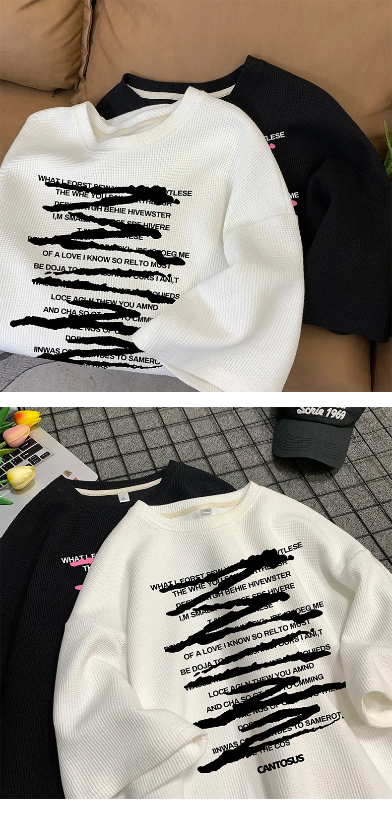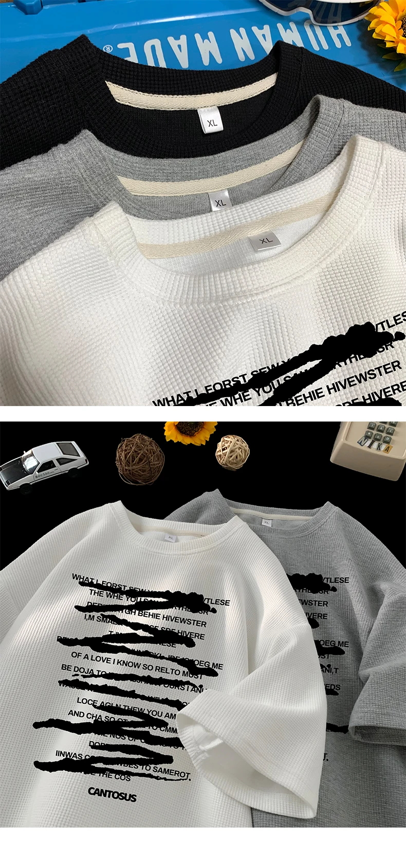 Aidase Trendy Men's T-Shirt Graffiti Letter Print Design T-Shirts Summer Waffle Short Sleeve Top Fashion Clashing Colour T-shirt