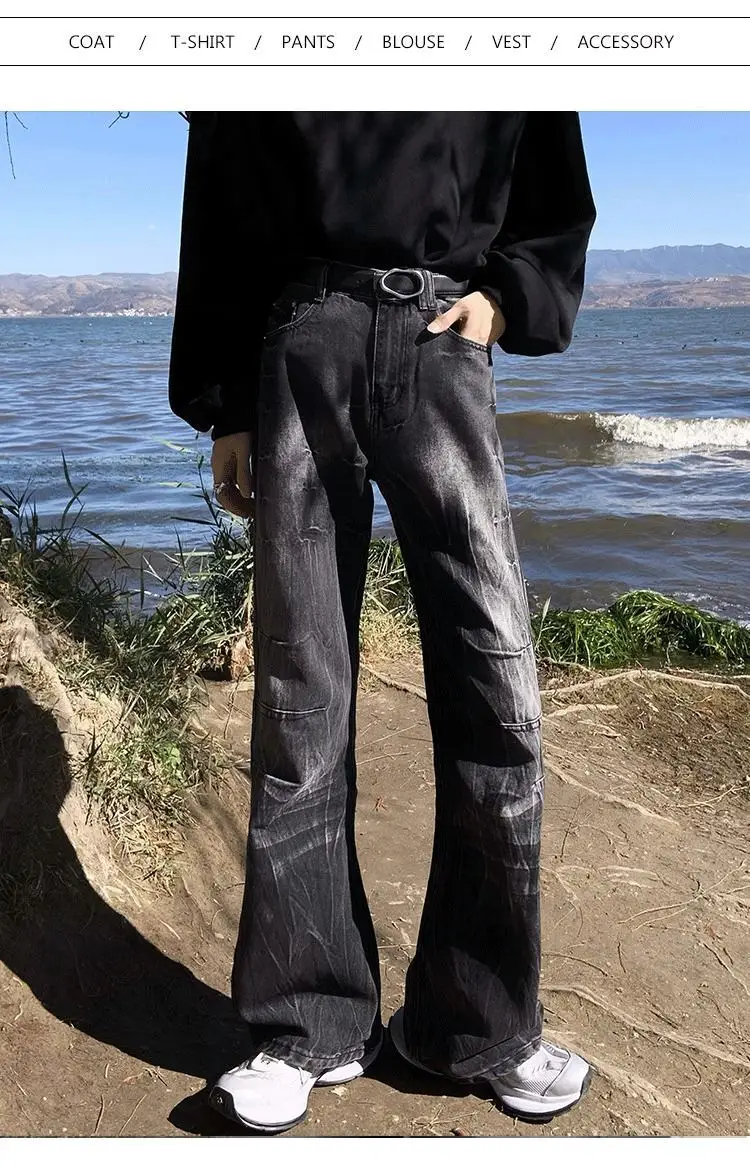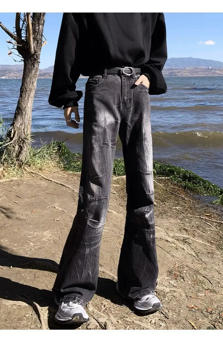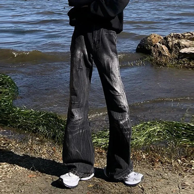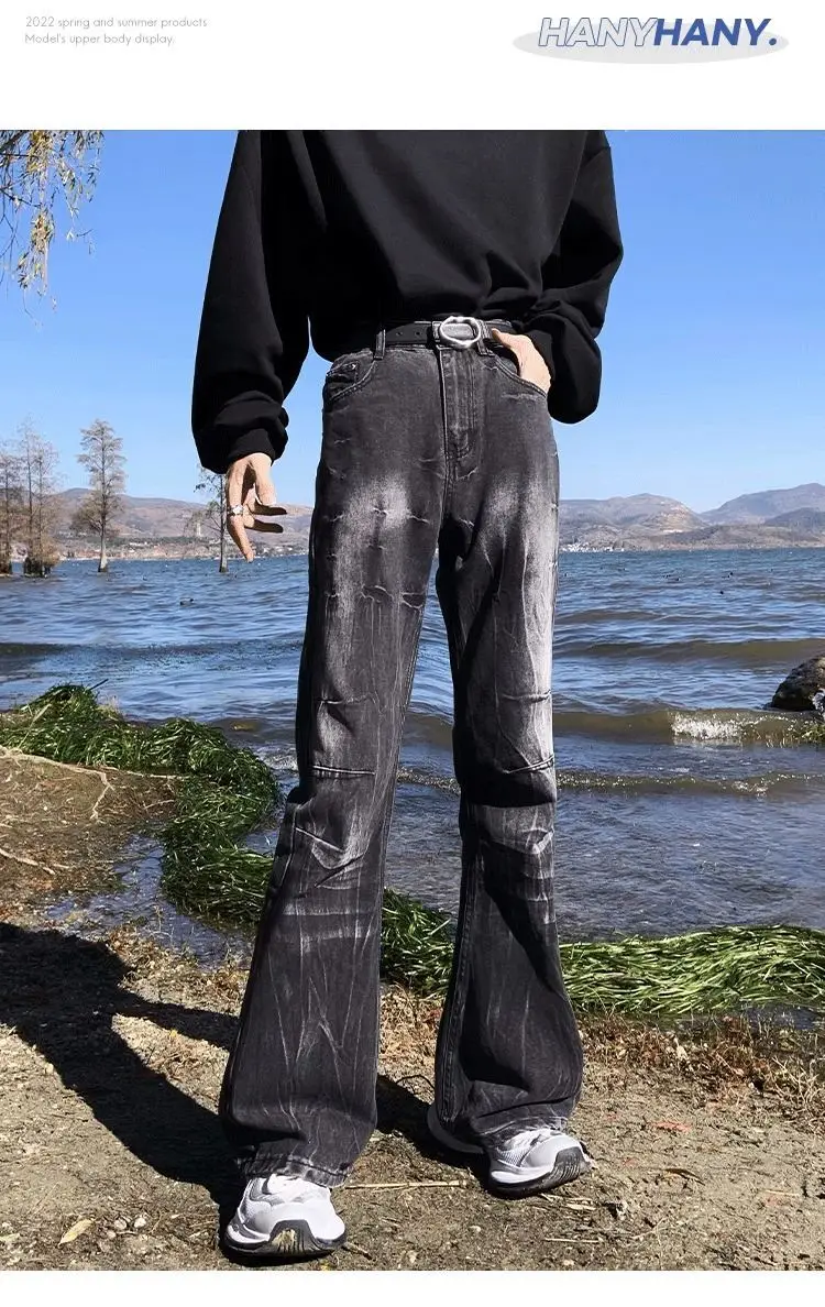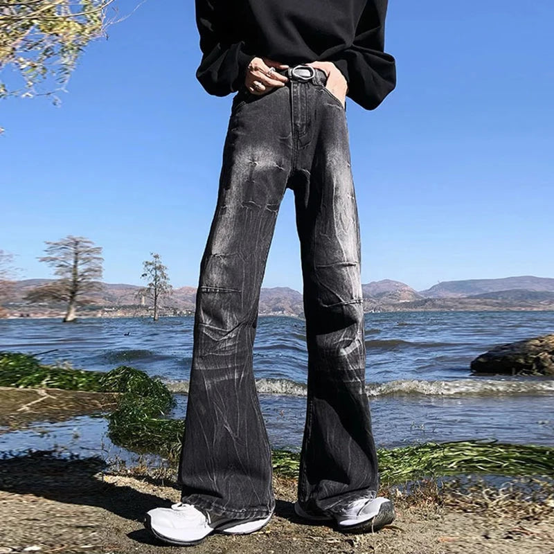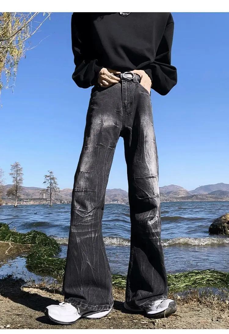 AIDASE - Vintage Male Jeans Wrinkled Lightning Pattern Washed Design Layered Slightly Flared Men's Denim Pants Fashion New 21E7545