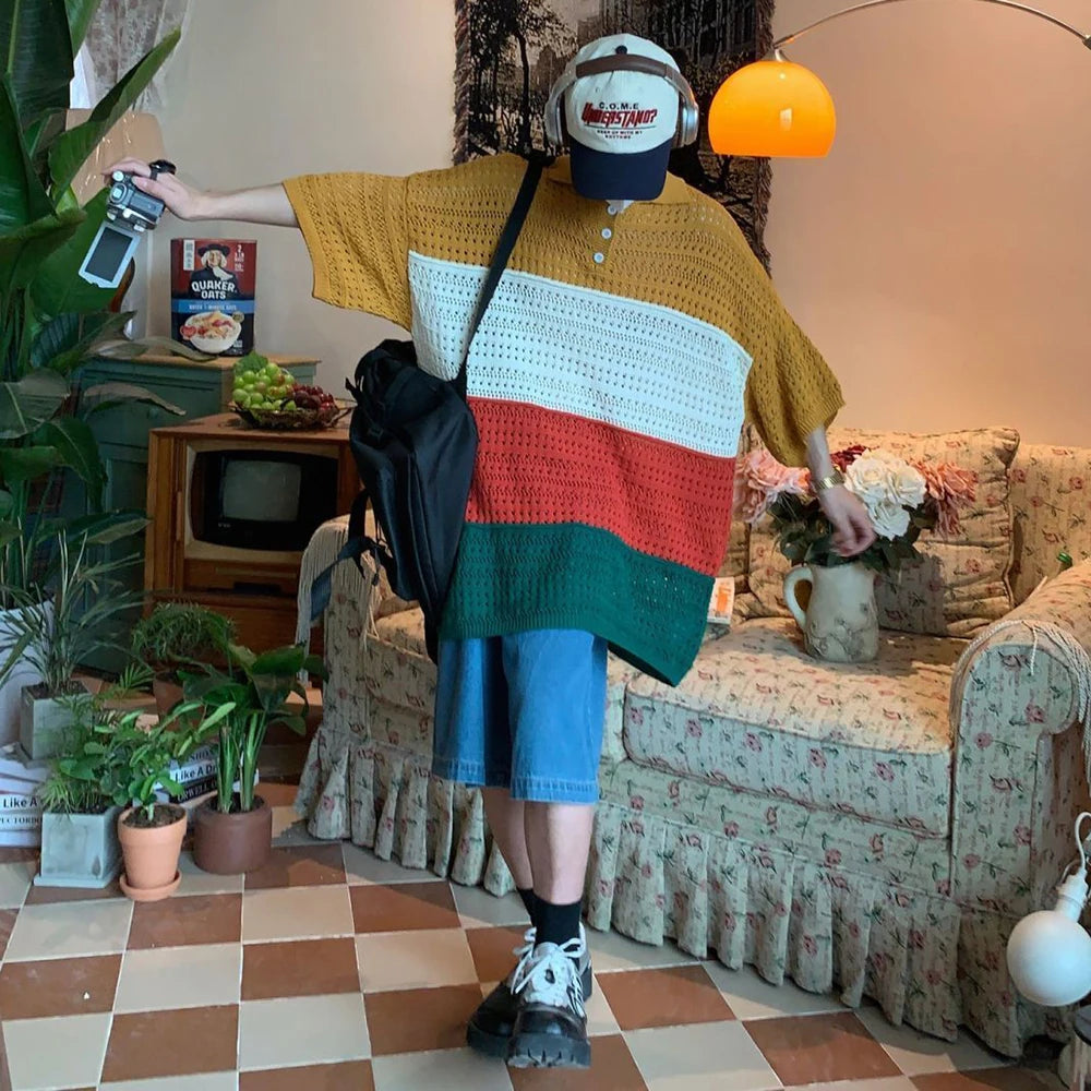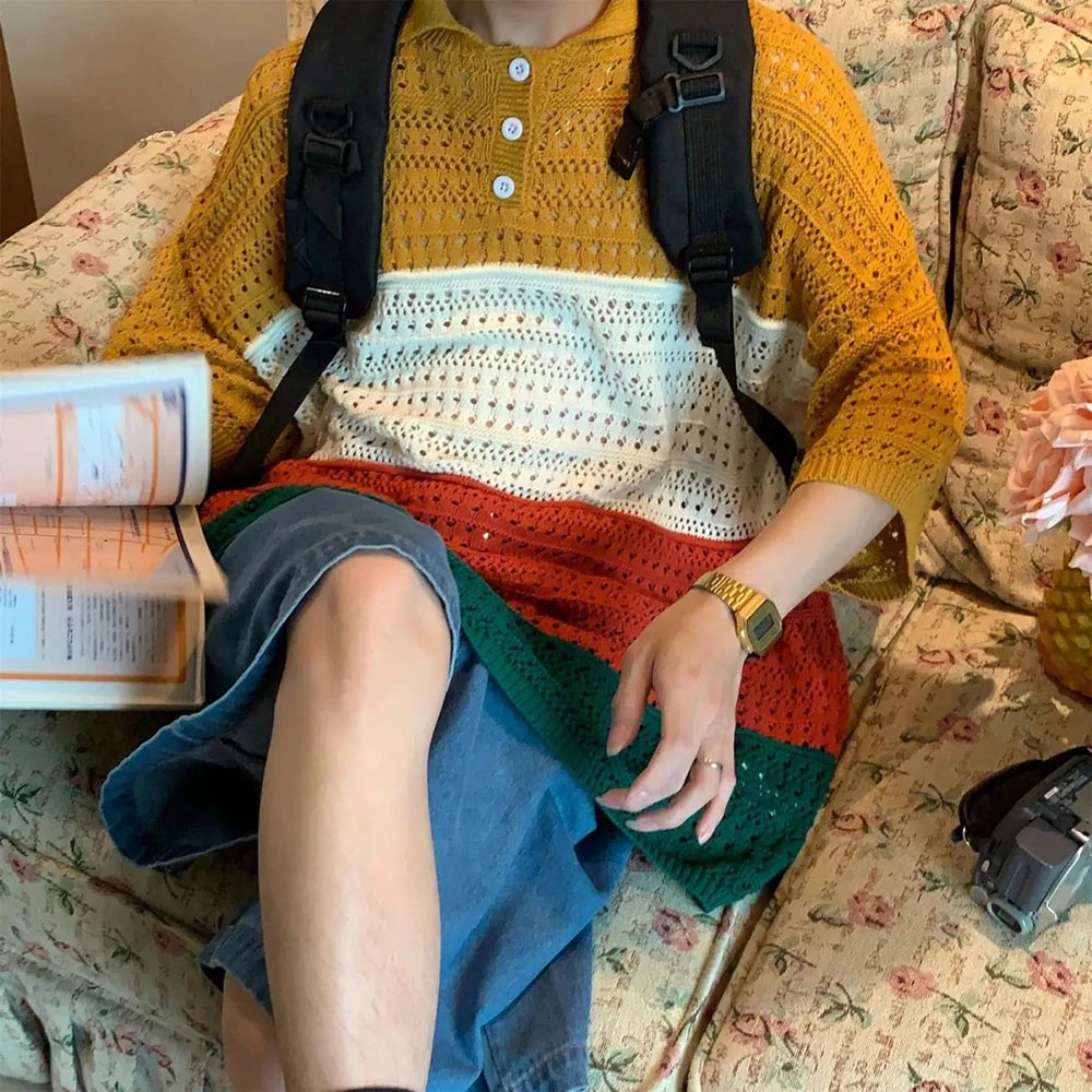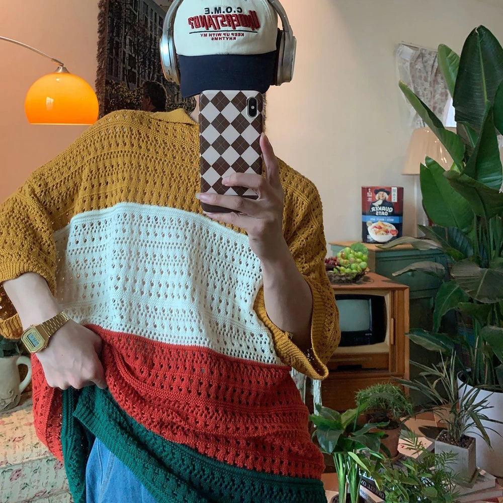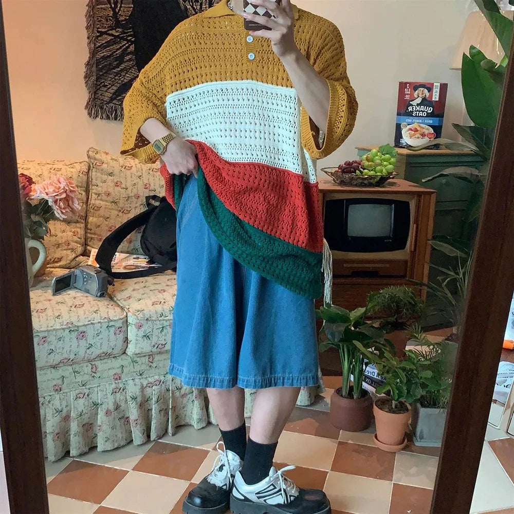 Y2k Streetwear Men's Contrasting Knitwear Casual Short Sleeve Tops Fashion Hollow T-shirt Trendy All-match Pullover POLO Shirts