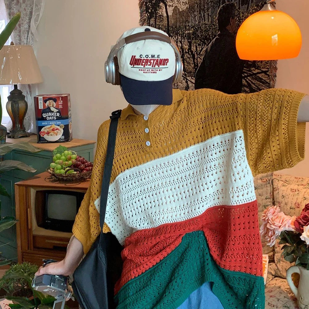 Aidase Y2k Streetwear Men's Contrasting Knitwear Casual Short Sleeve Tops Fashion Hollow T-shirt Trendy All-match Pullover POLO Shirts