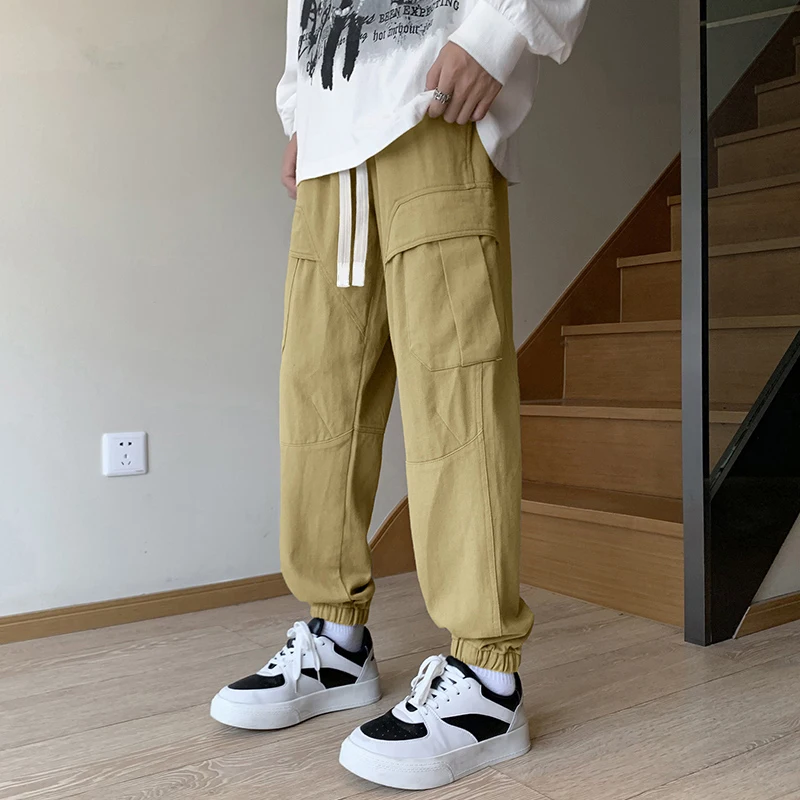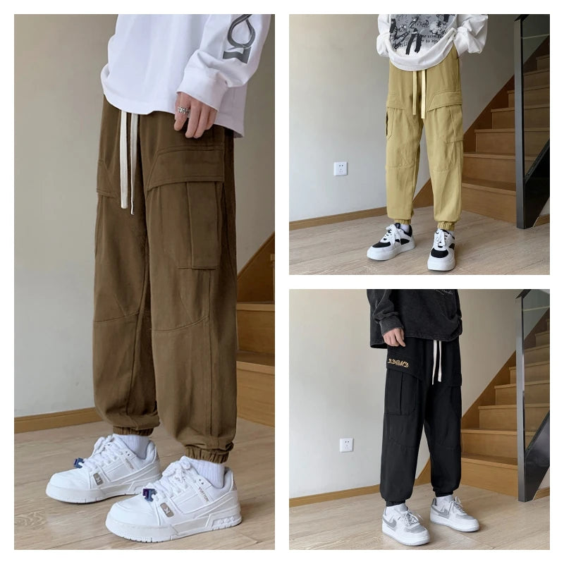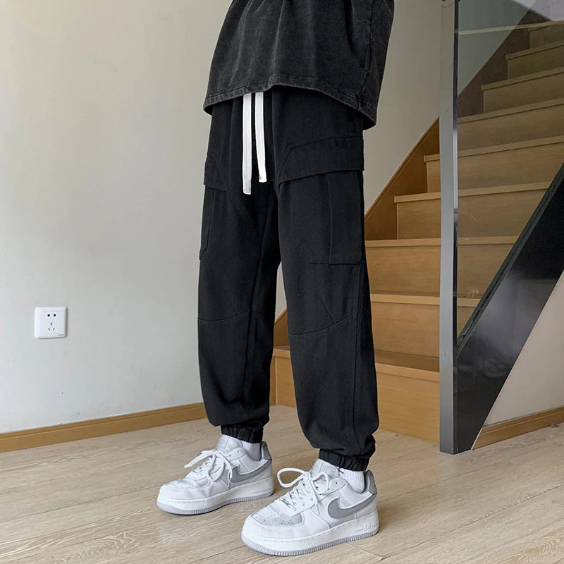 AIDASE - New Spring and Summer Men's Solid High Waist Elastic Loose Plus Size Cargo Pants Pockets Sports Fashion Casual Commuter Trousers