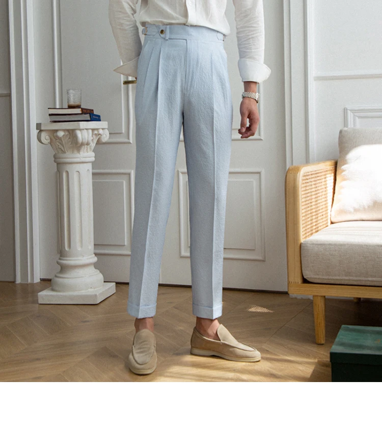 2024 Spring Seersucker High Waist Straight Pants British Petty Bourgeoisie Blue Stripe Italian Casual Trousers Men