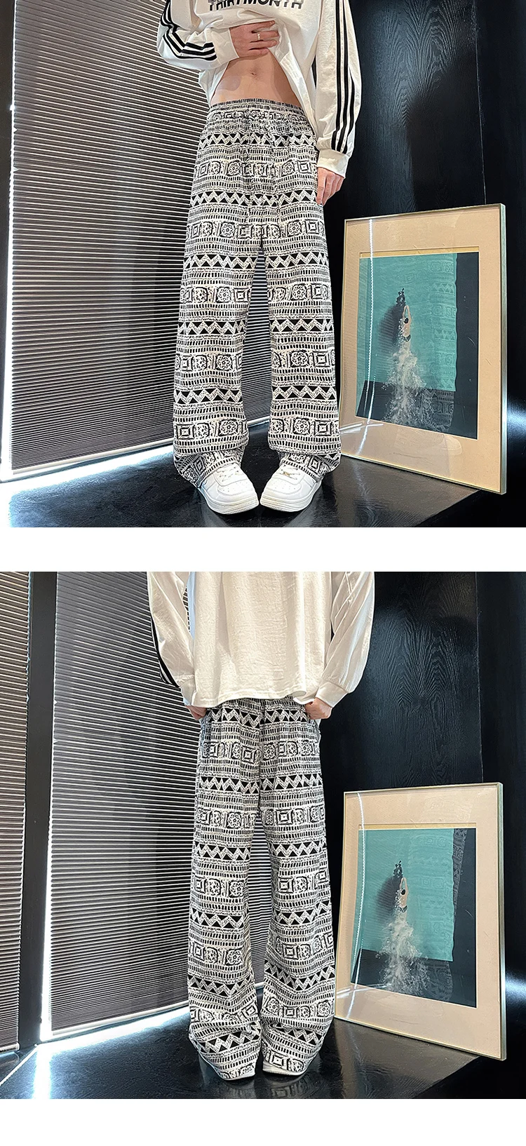 Aidase Men Hippie Pants Retro Street Printed Outdoor Straight-legs Trousers Casual Pants Loose Fit Elastic Drawstring Waist Pants