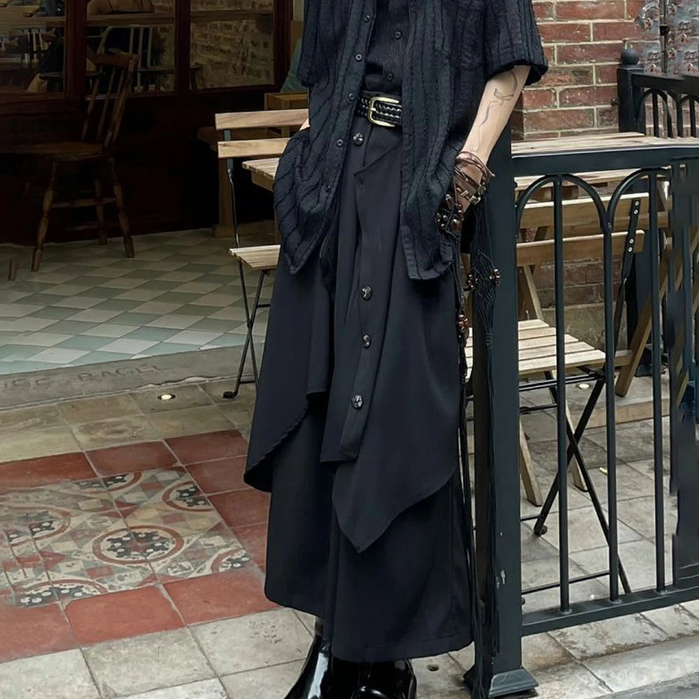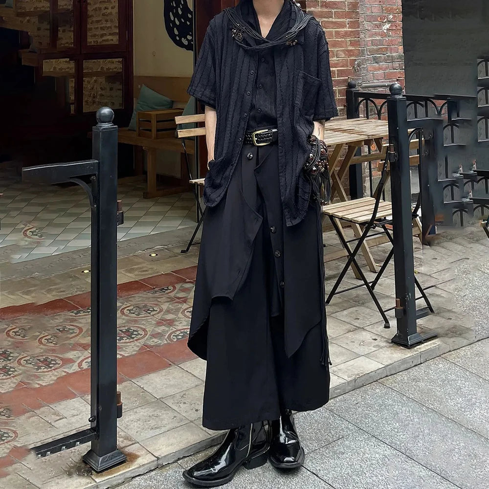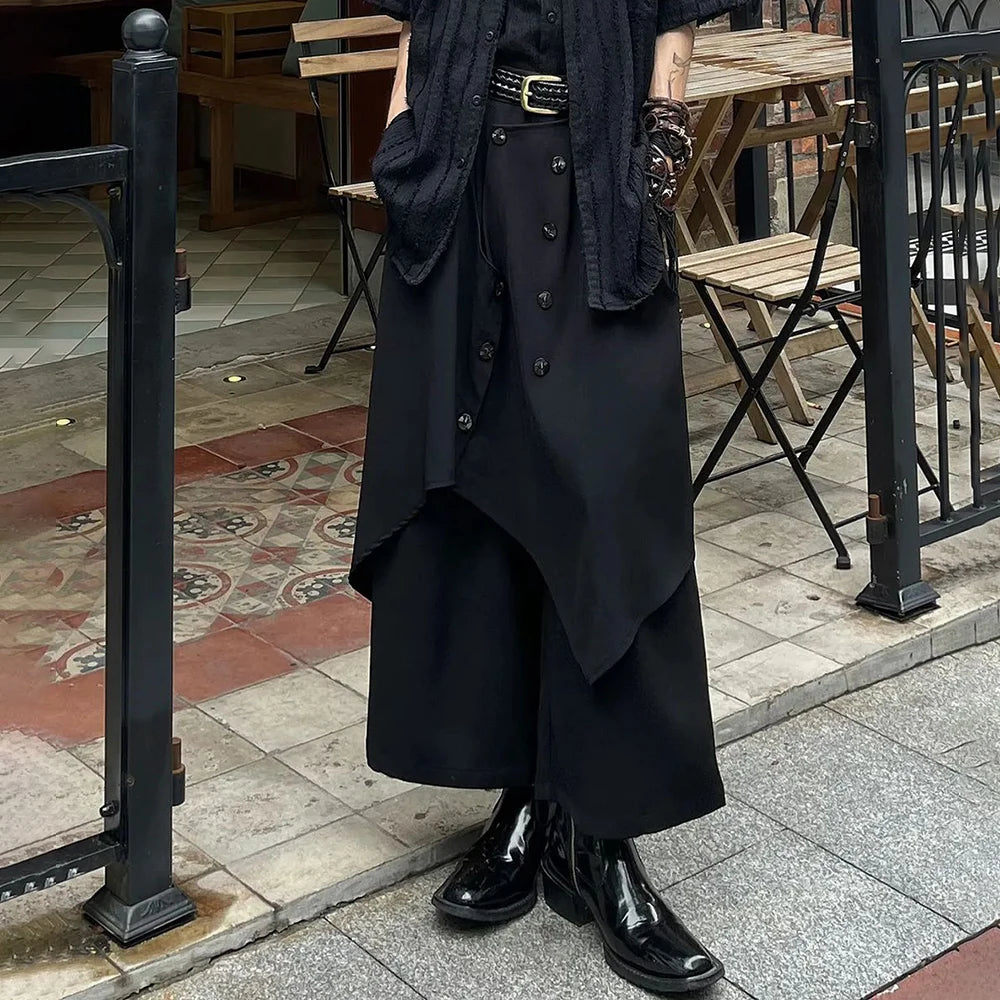 Mens Chinese Style Pleated Button Double Button Stacked Irregular Culottes Essential Casual Fashion Trend Loose Wide Leg Pants