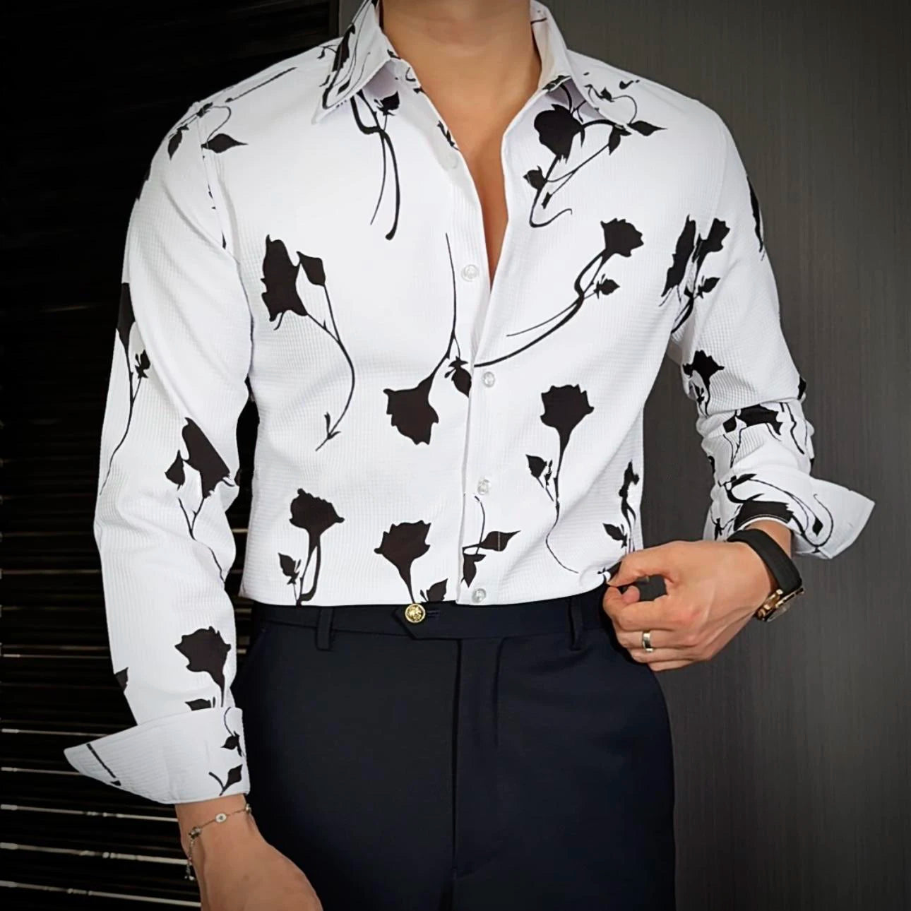 2024 Summer Luxury Black White Flower Shirt For Men Long Sleeve Casual Business Dress Shirts Social Party Tuxedo Men Clothing