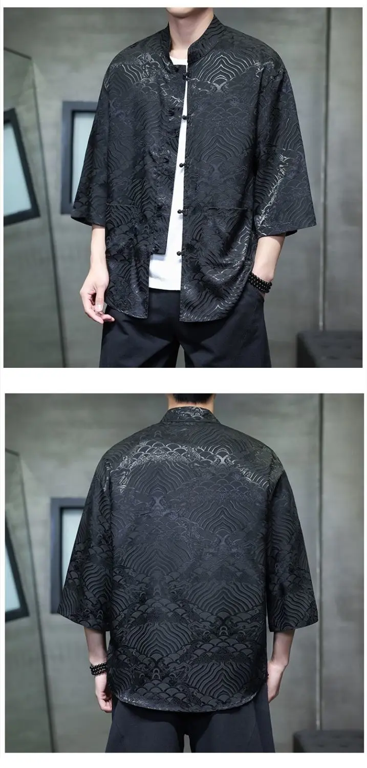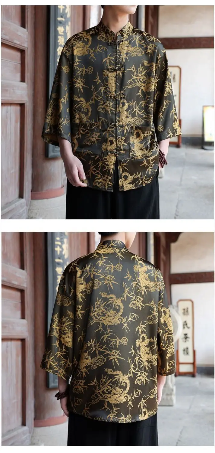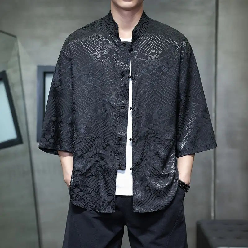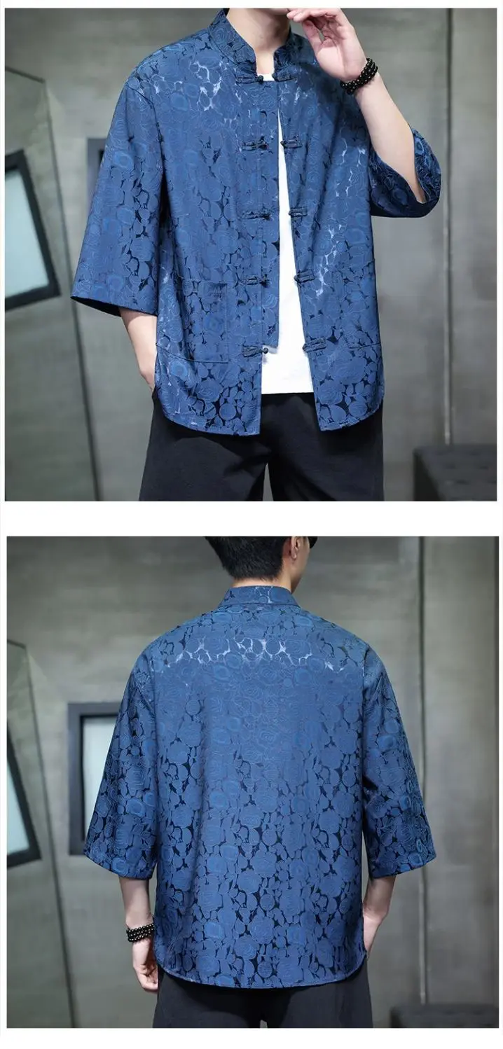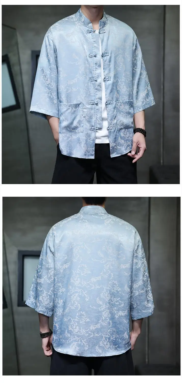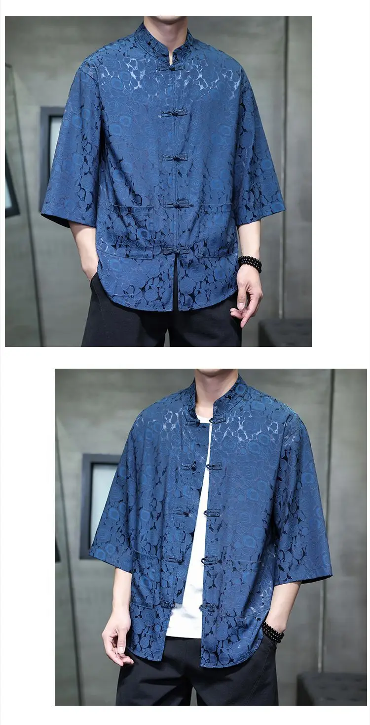 AIDASE - Chinese Style Thin Light Luxury Retro Men National Trend Large Size Loose Ice Silk Shirt Men's Jacquard Fashion Trend Tang Suit