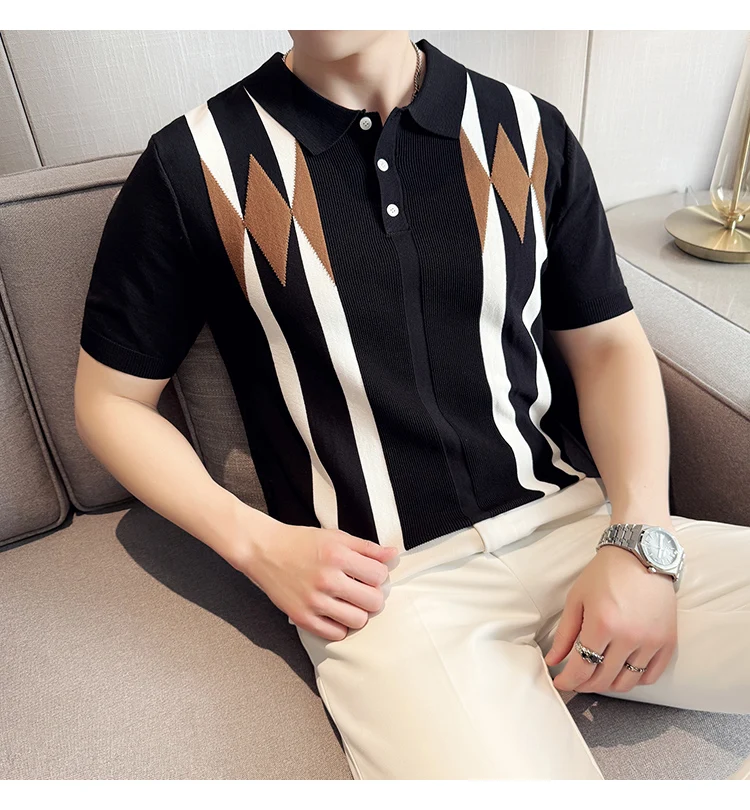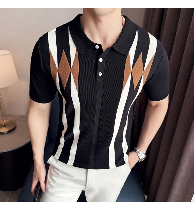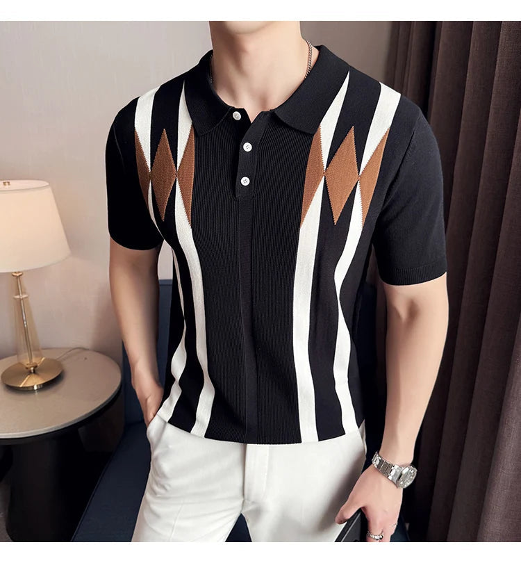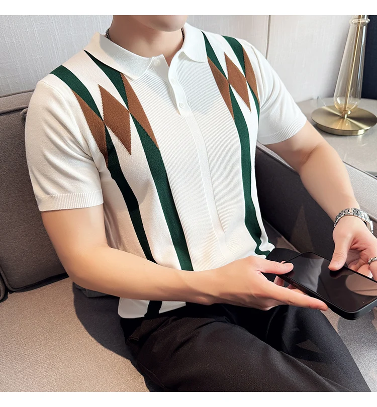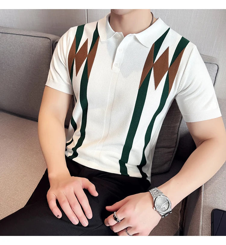 AIDASE - Contemporary Men's Polo: White Shirt with Earth-Tone Geometric Lines | Office-to-Outing Versatility M-4XL