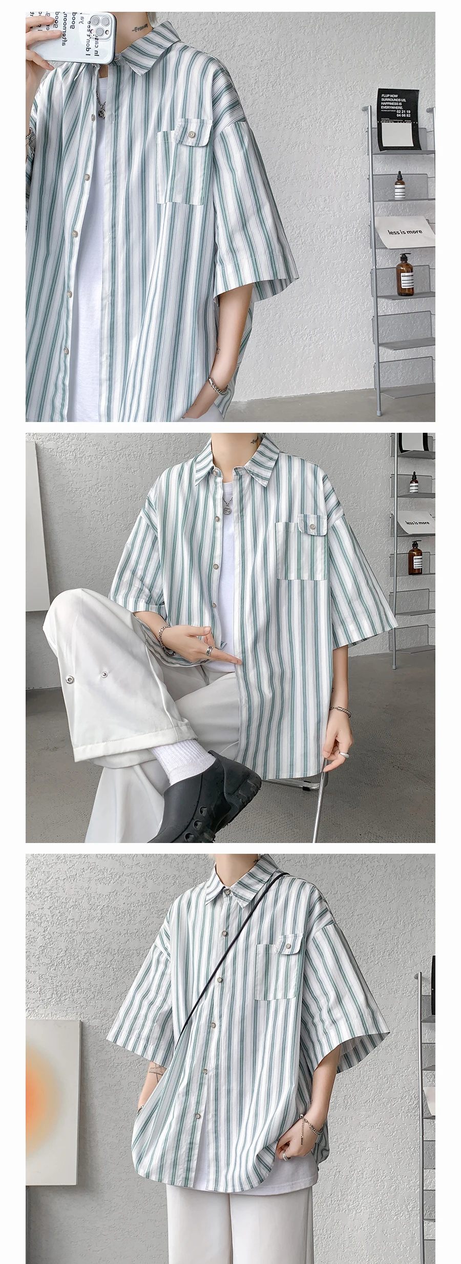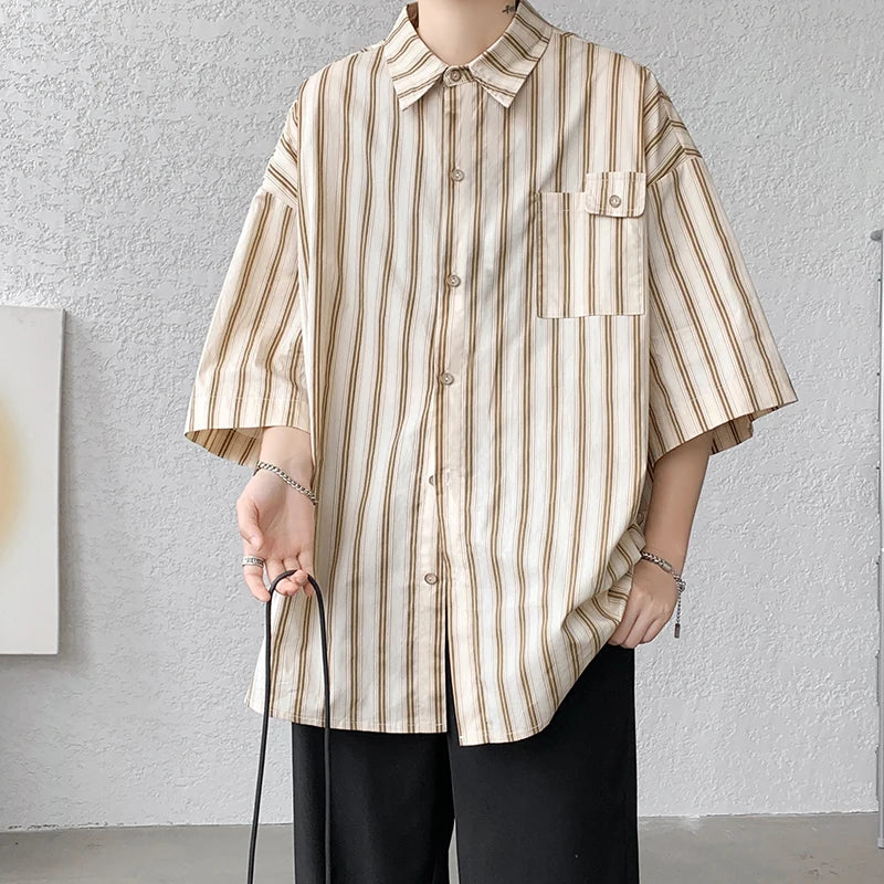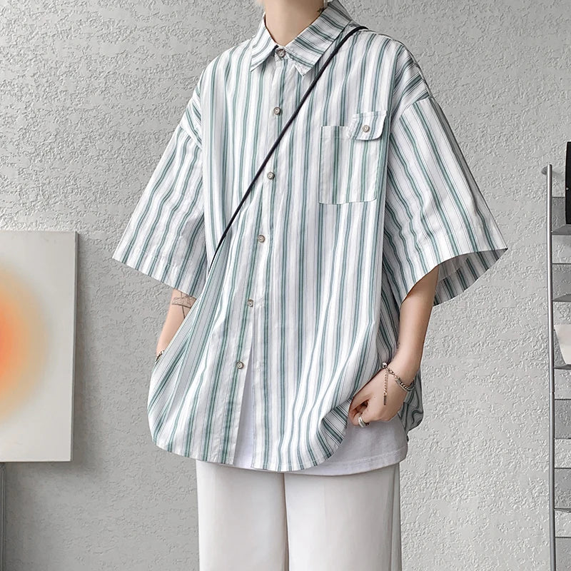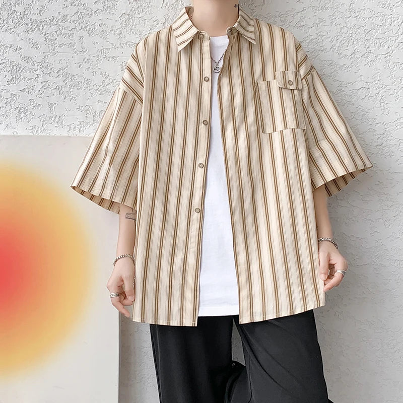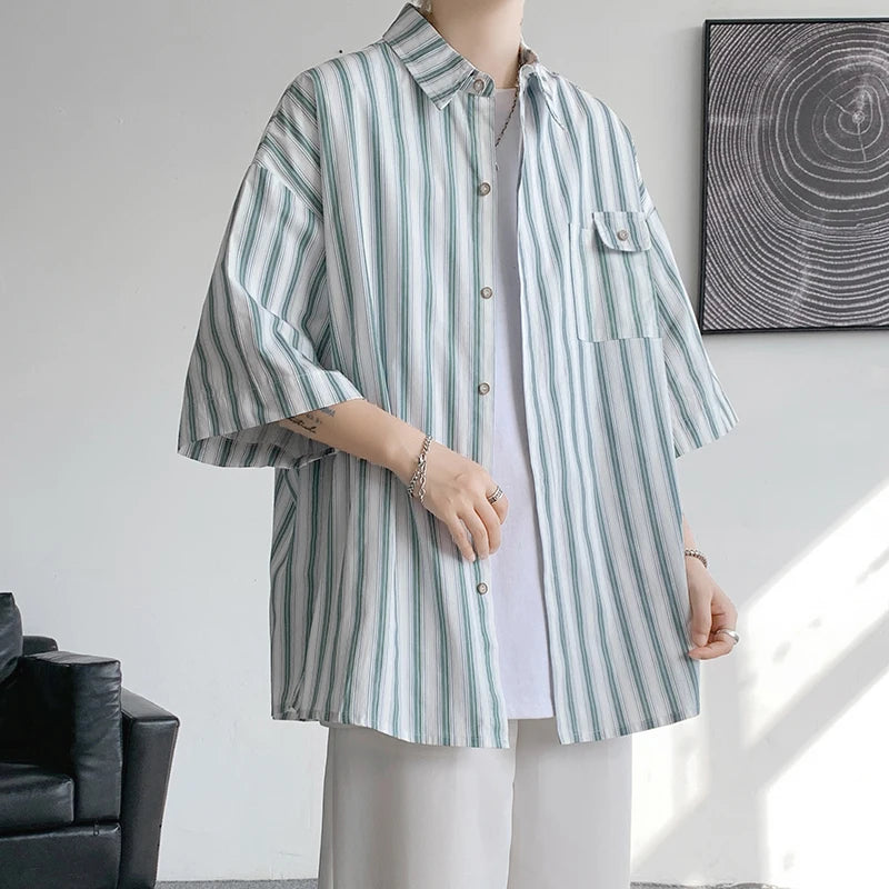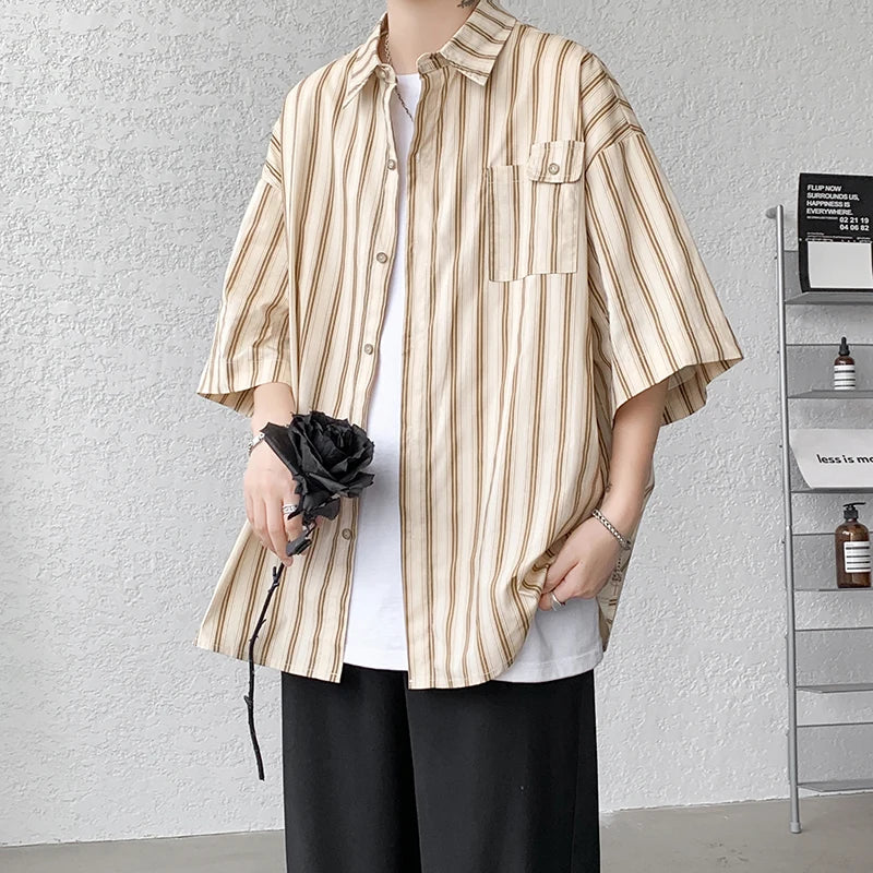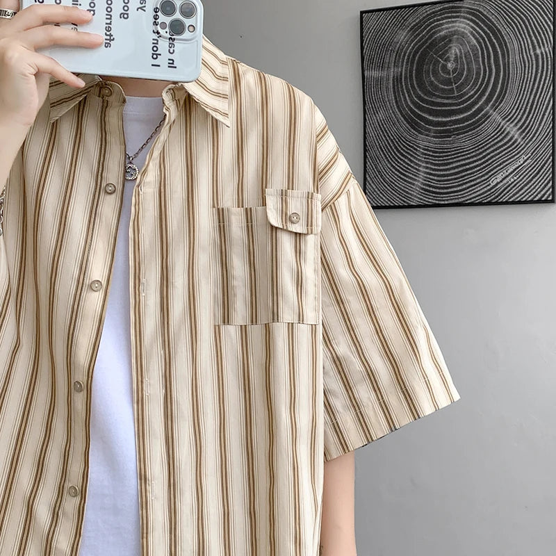 Half Sleeve Shirts Men Casual Stripe Shirts Streetwear Oversize Blouses Single Breasted Male Clothing Harajuku Summer