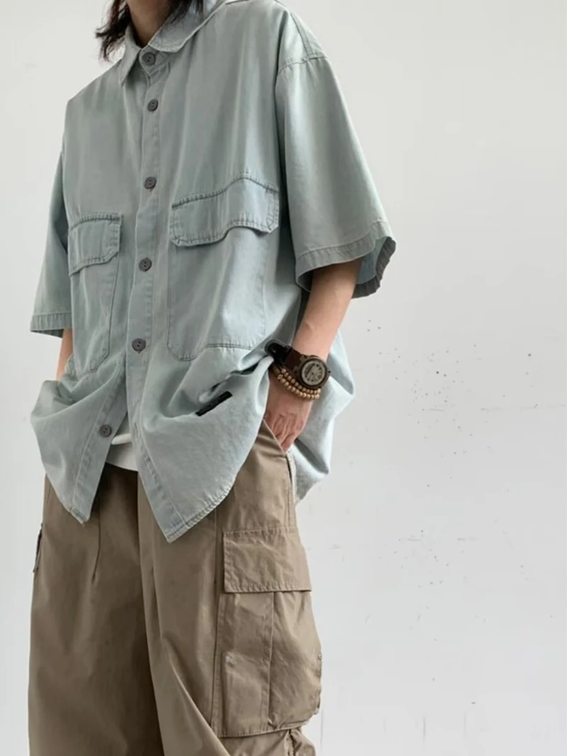 Aidase Japanese Trendy Set Mens Retro Simplicity Light Blue Denim Shirt+Multi Pocket Wide Leg Cargo Pants 2-pcs Street Harajuku Suit
