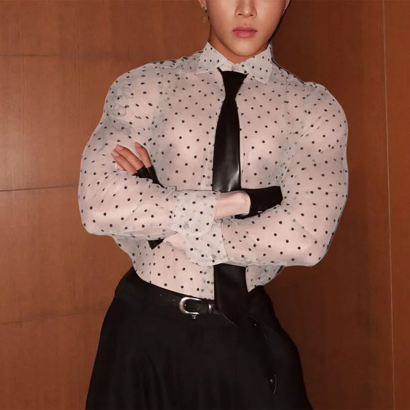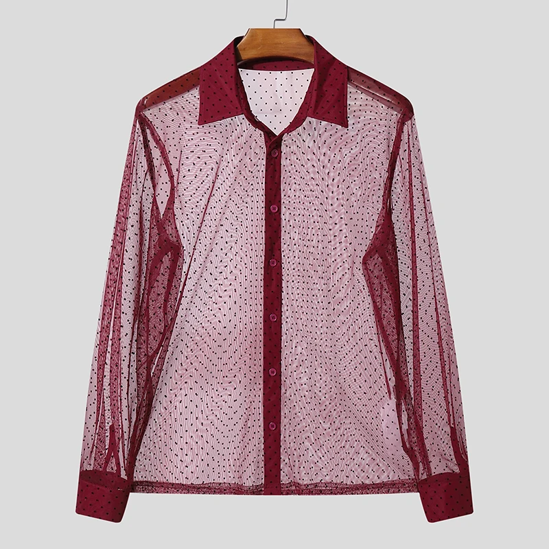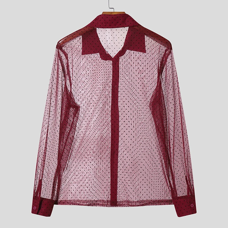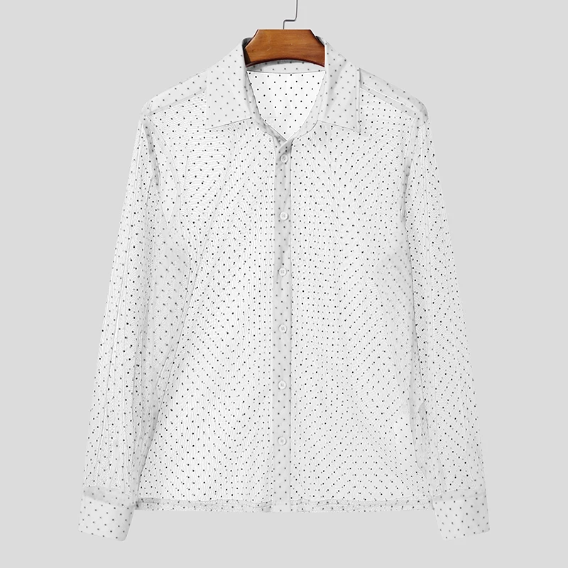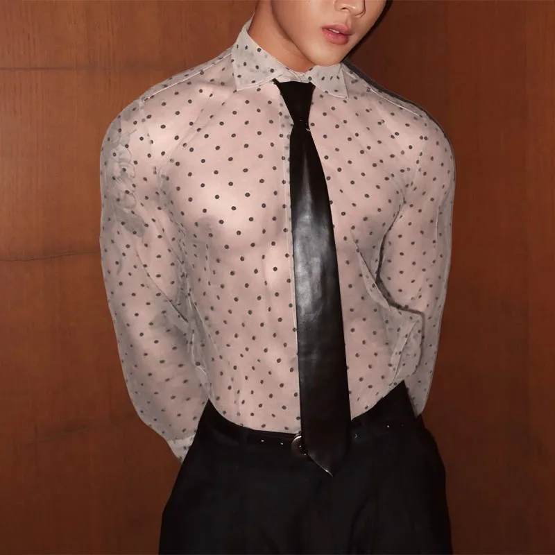 AIDASE - Men Shirt Polka Dot Printing Lapel Long Sleeve Button Men Clothing Mesh See Through Loose Fashion Male Shirts Streetwear