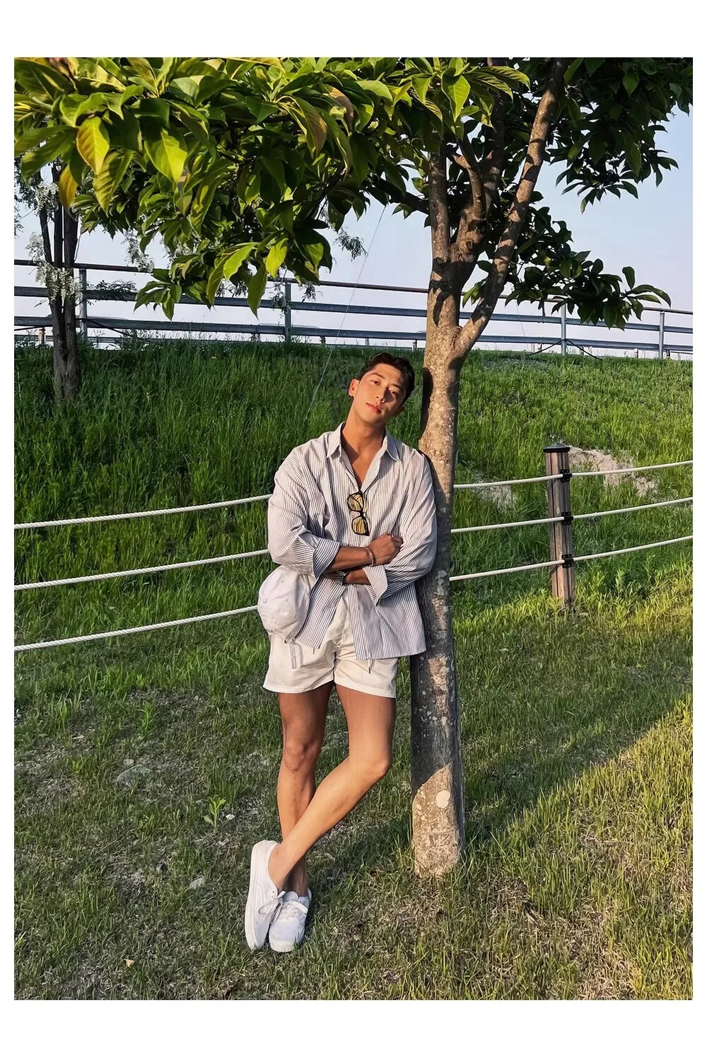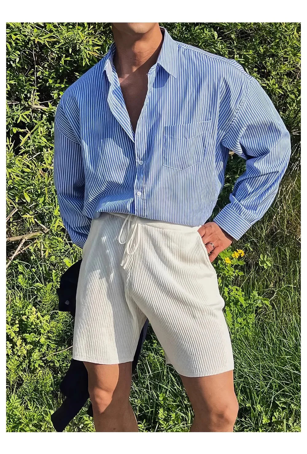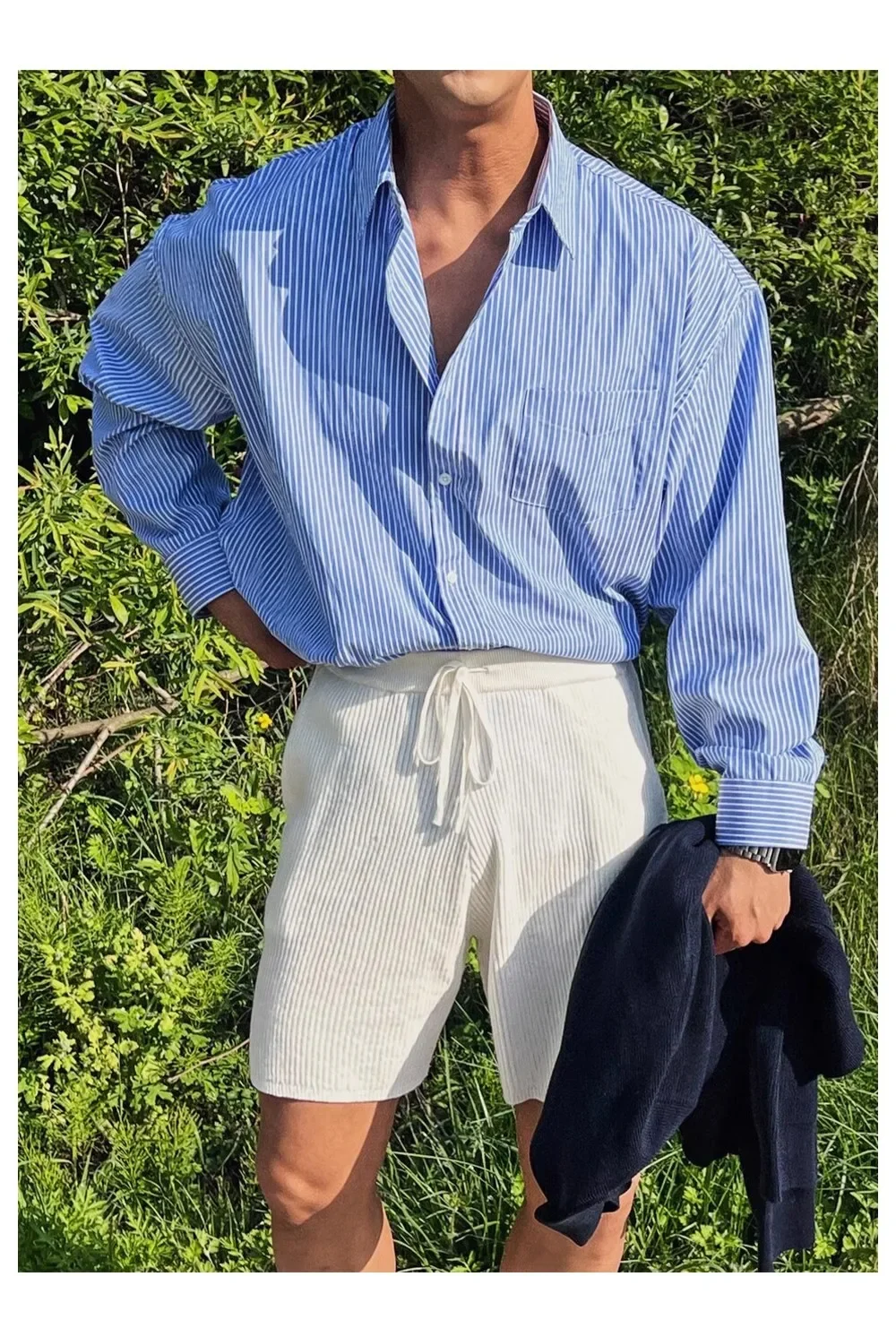 Aidase Men's Blue Vertical Striped Long-Sleeved Shirt, Korean Style High Quality Casual Shirt Coat, Travel ,Hiking Shirt Coat