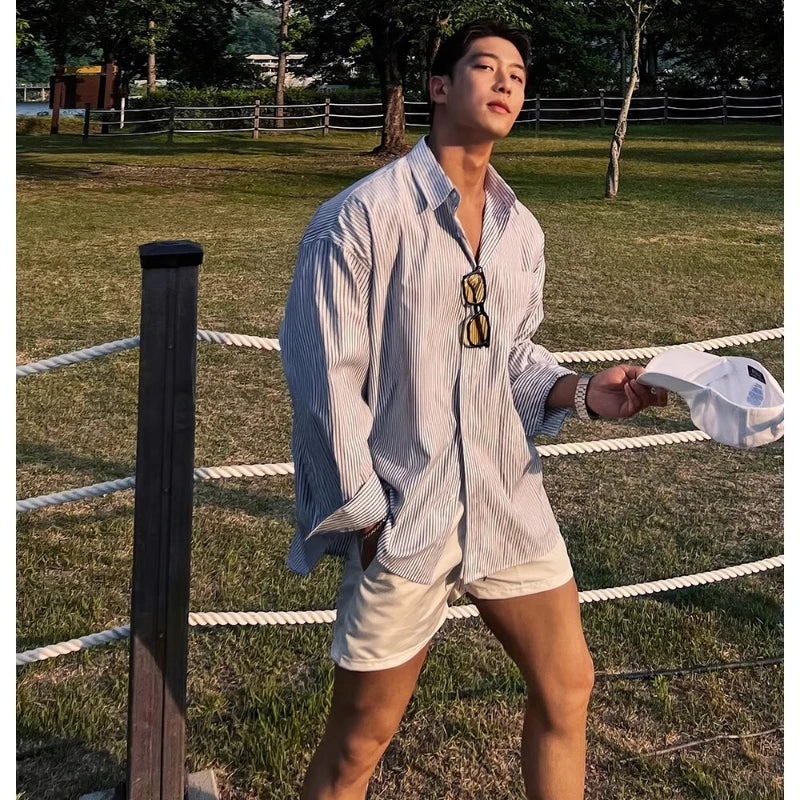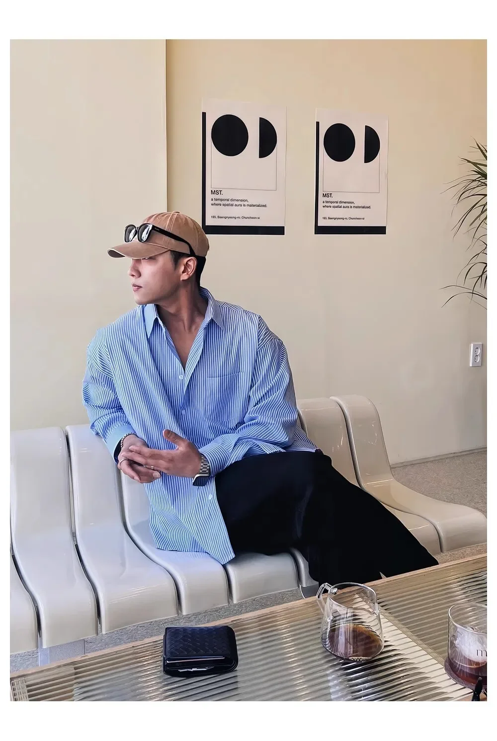 Men's Blue Vertical Striped Long-Sleeved Shirt, Korean Style High Quality Casual Shirt Coat, Travel ,Hiking Shirt Coat