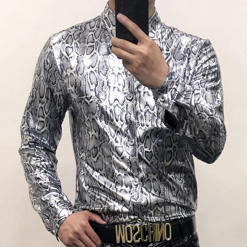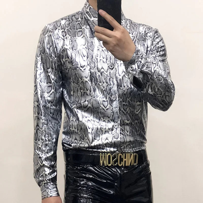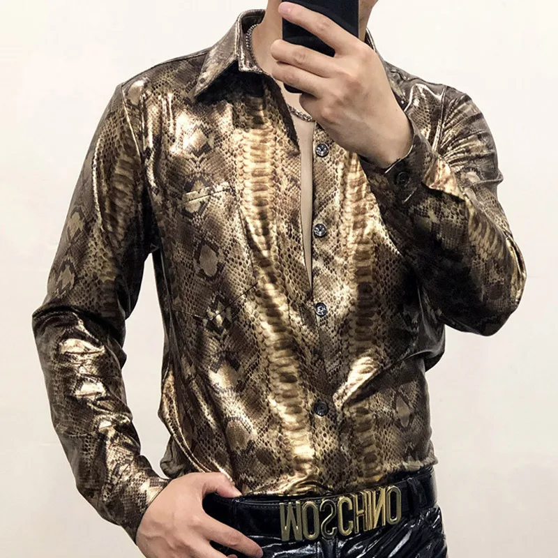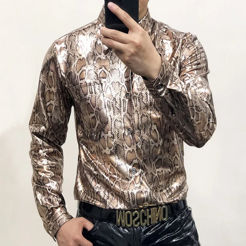 Men's Boutique Gold Snake Print Leopard Print High Gloss Face Shirt Slim Fit Large Nightclub Sexy Shirt Foreign Trade European