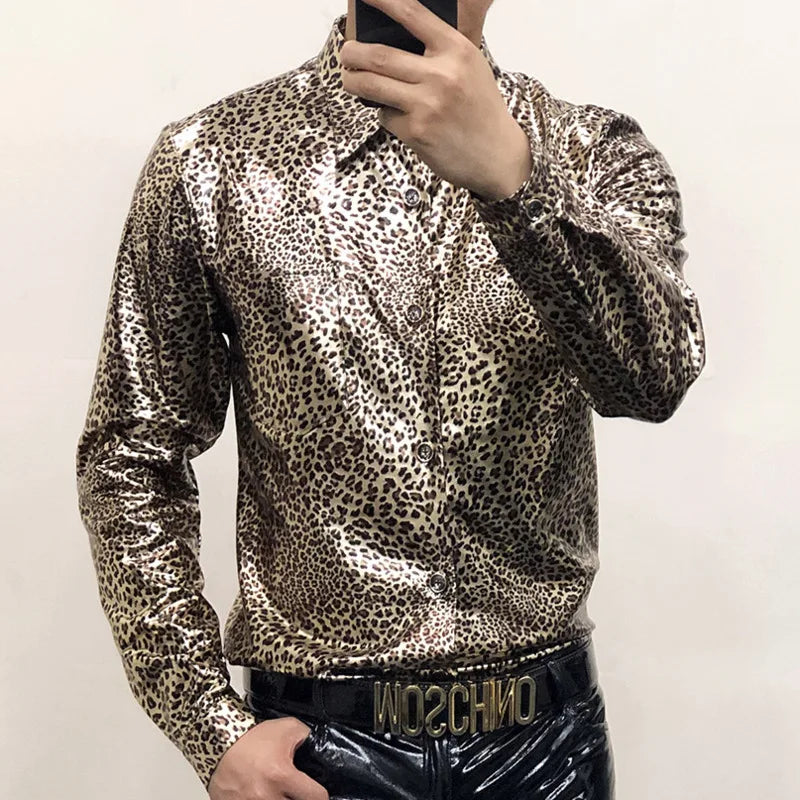 Aidase Men's Boutique Gold Snake Print Leopard Print High Gloss Face Shirt Slim Fit Large Nightclub Sexy Shirt Foreign Trade European