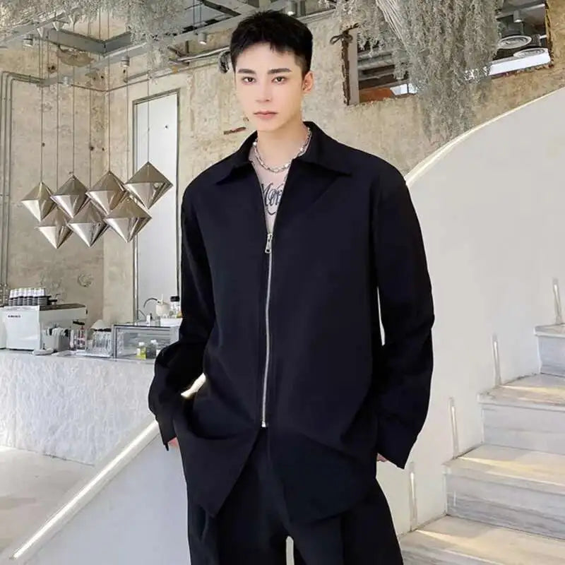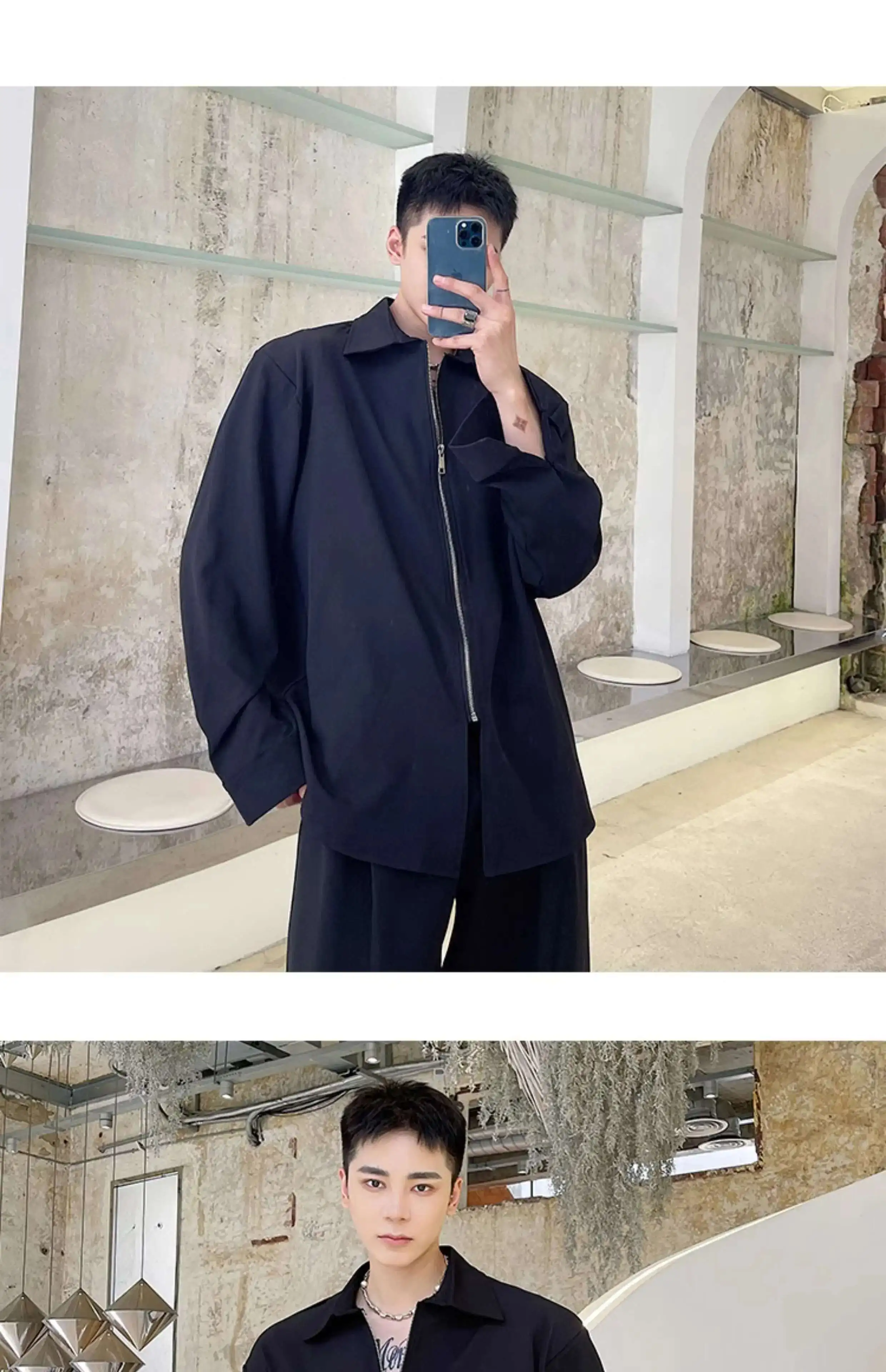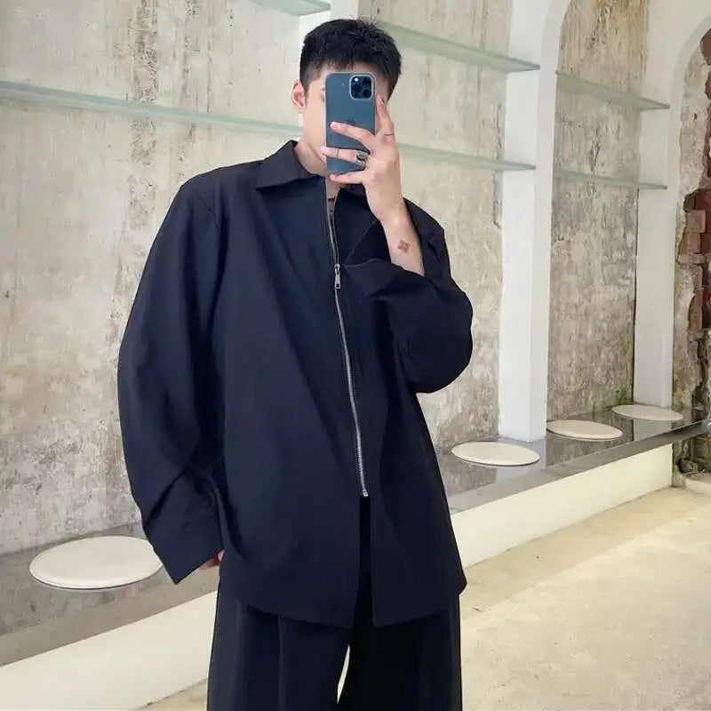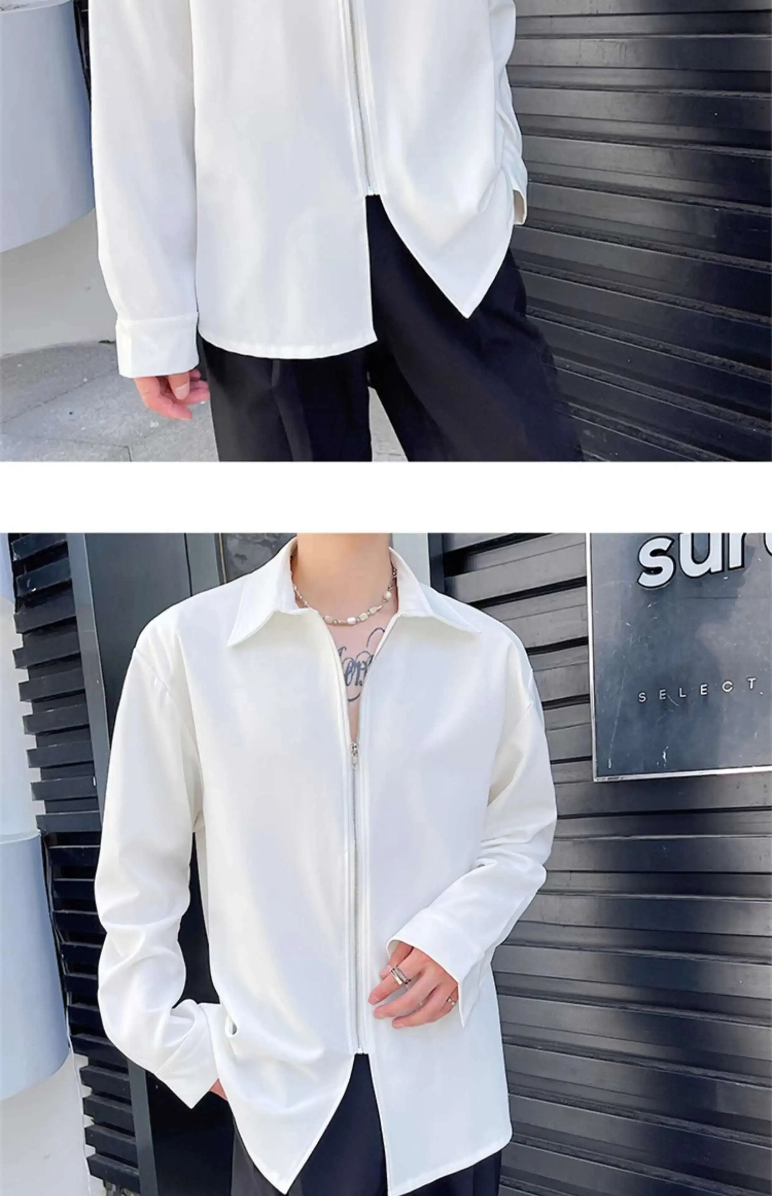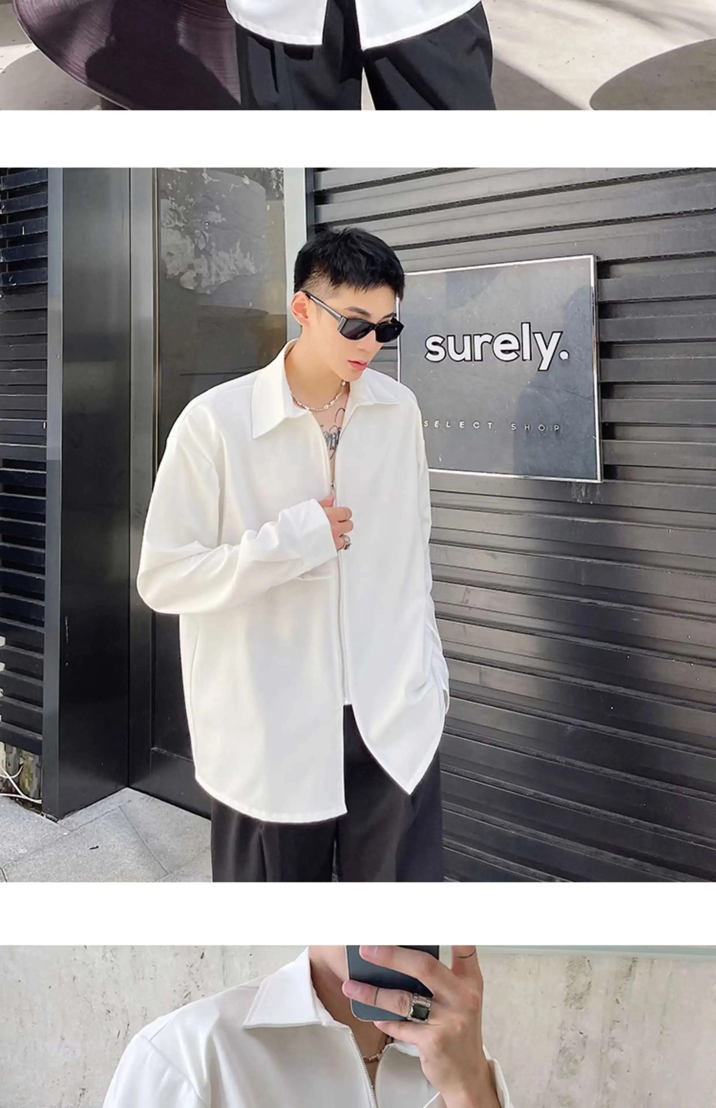 AIDASE - Men's Long Sleeves Shirts New Korean Solid Color Trendy Casual Shoulder Pads Zipper Design Male Loose Shirts Spring