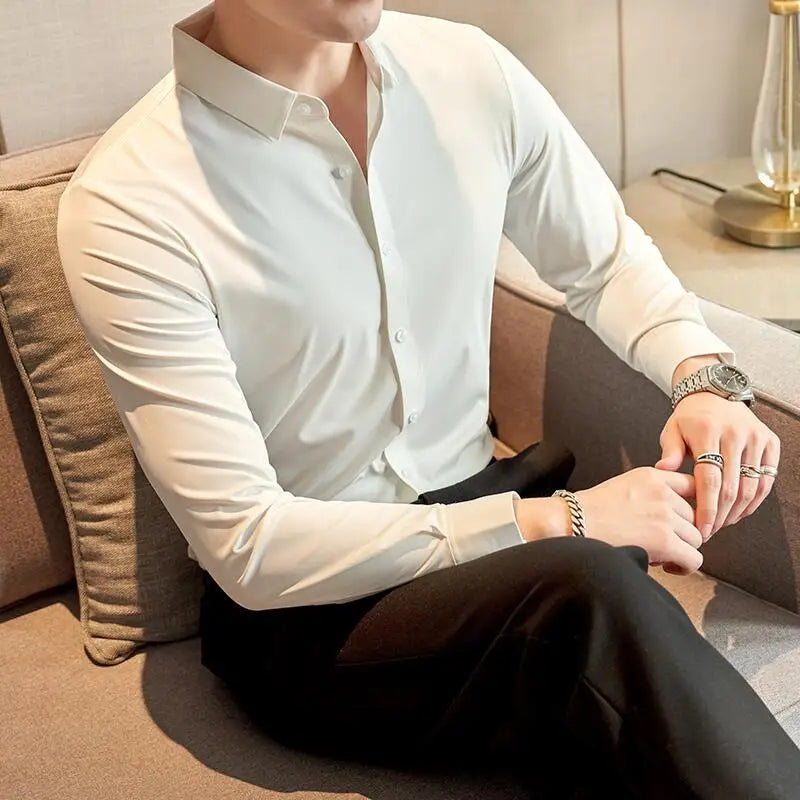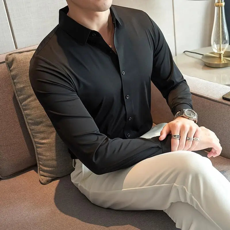 New High Quality No Trace Ice Silk Long Sleeve Elastic Shirts Men Formal Business Slim Fit Solid Casual Shirt Tuxedo 4XL-M
