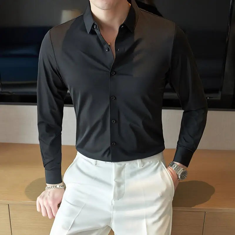 Aidase New High Quality No Trace Ice Silk Long Sleeve Elastic Shirts Men Formal Business Slim Fit Solid Casual Shirt Tuxedo 4XL-M