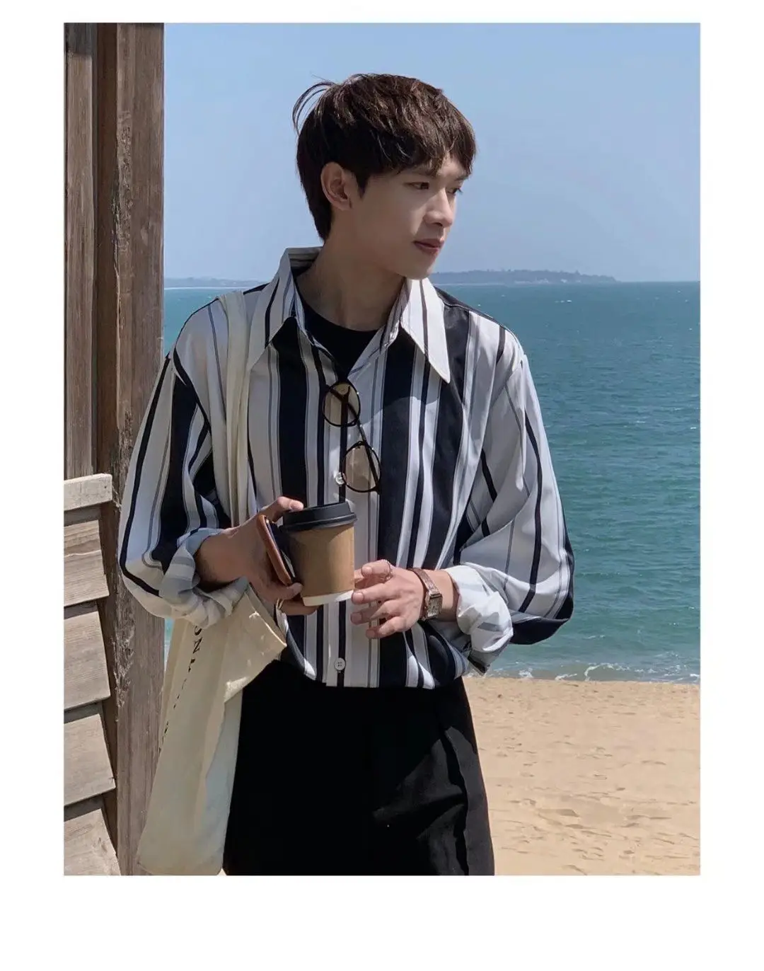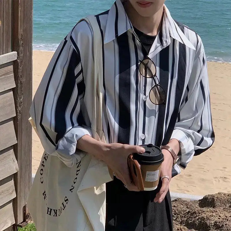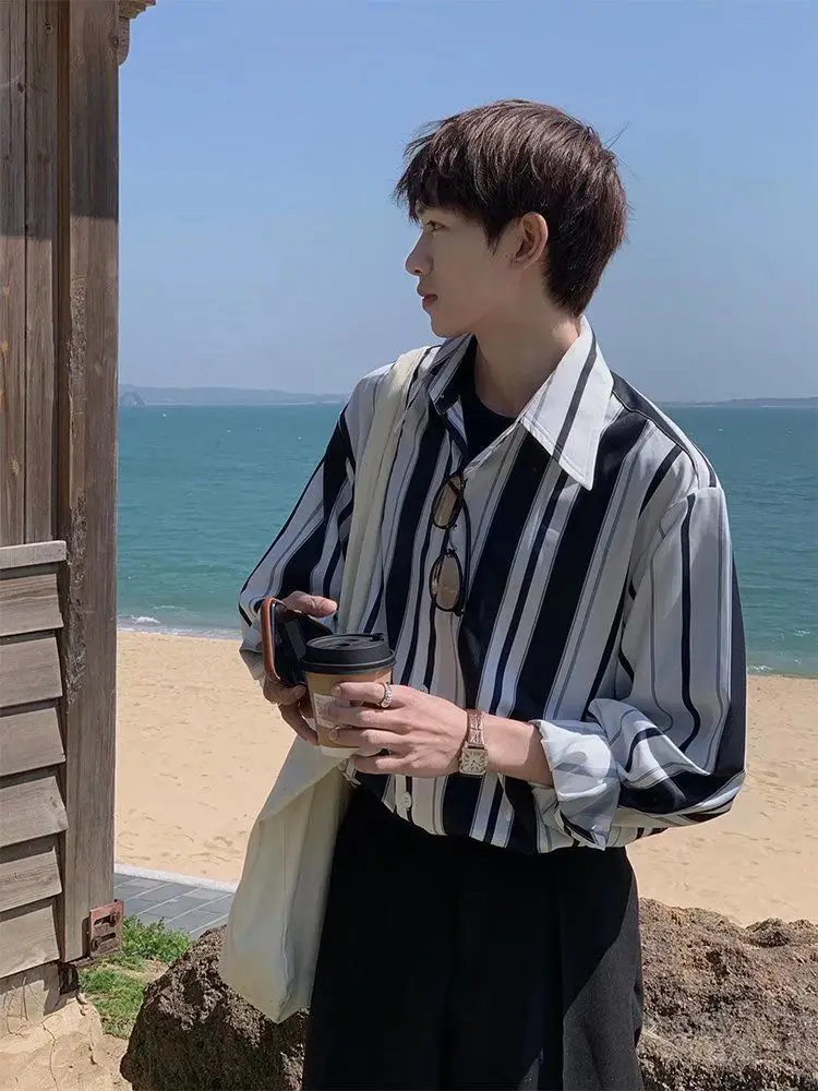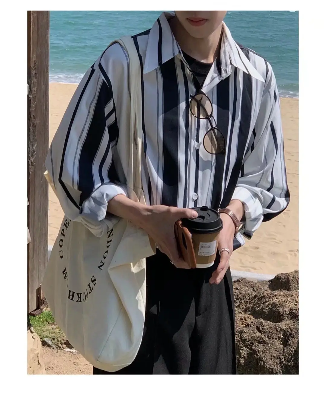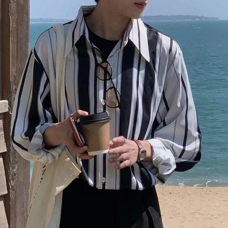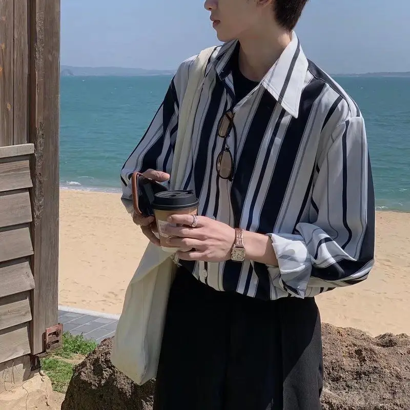 AIDASE - New Spring and Autumn Fashion Trend Men's Polo Neck Stripe Contrast Color Long Sleeve Handsome Versatile Casual Loose Shirt